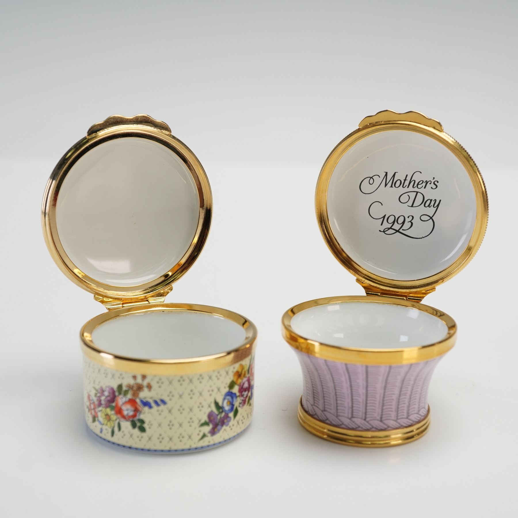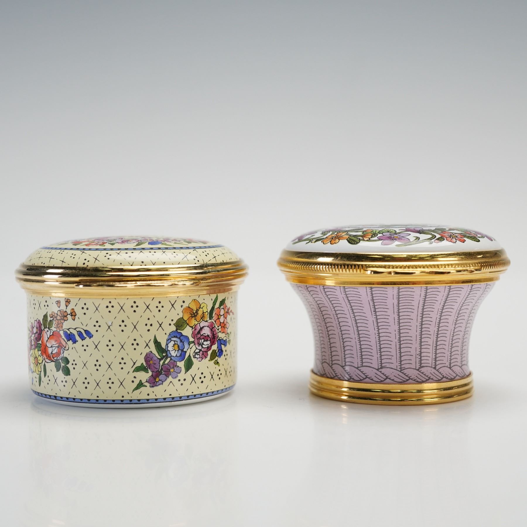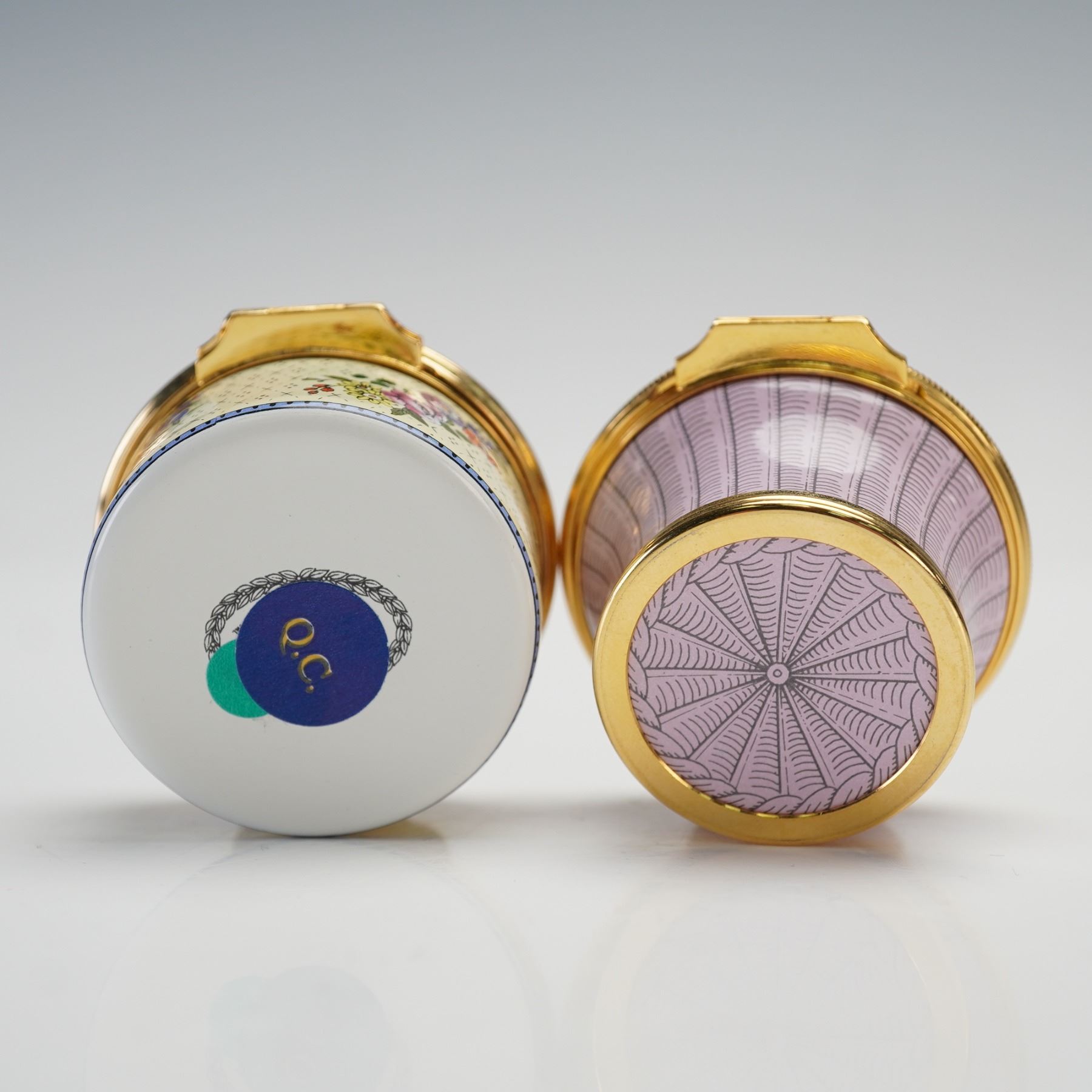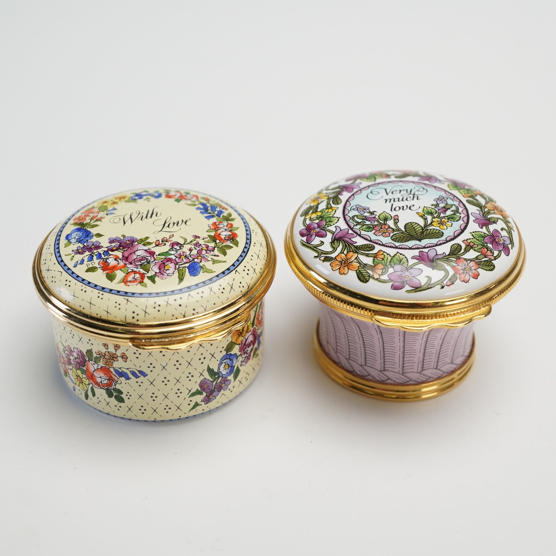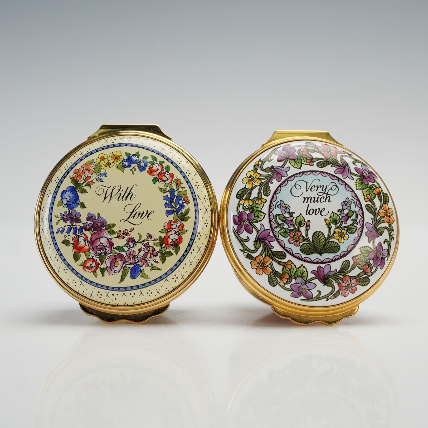 A pair of charming Halcyon Days enamel boxes, each beautifully hand-decorated with colorful floral garlands and gilt mounts, inscribed with tender messages of affection. One features the phrase With Love on a cream trellis-patterned ground adorned with vibrant blooms, while the other reads Very Much Love, with a lilac guilloche-style body and interior inscription Mother's Day 1993. Each bears appropriate marks to the interior and the base, including a Q.C. quality control stamp.