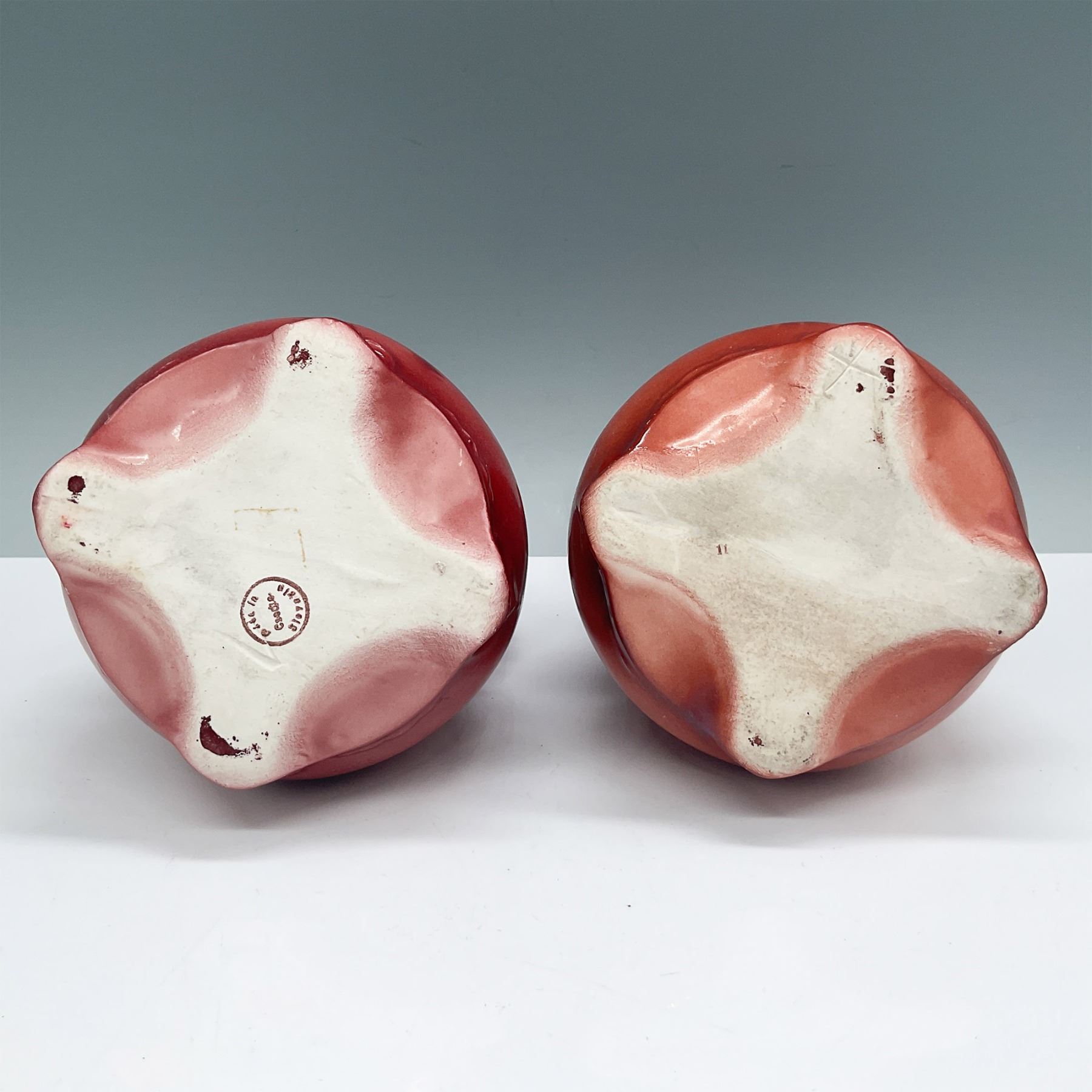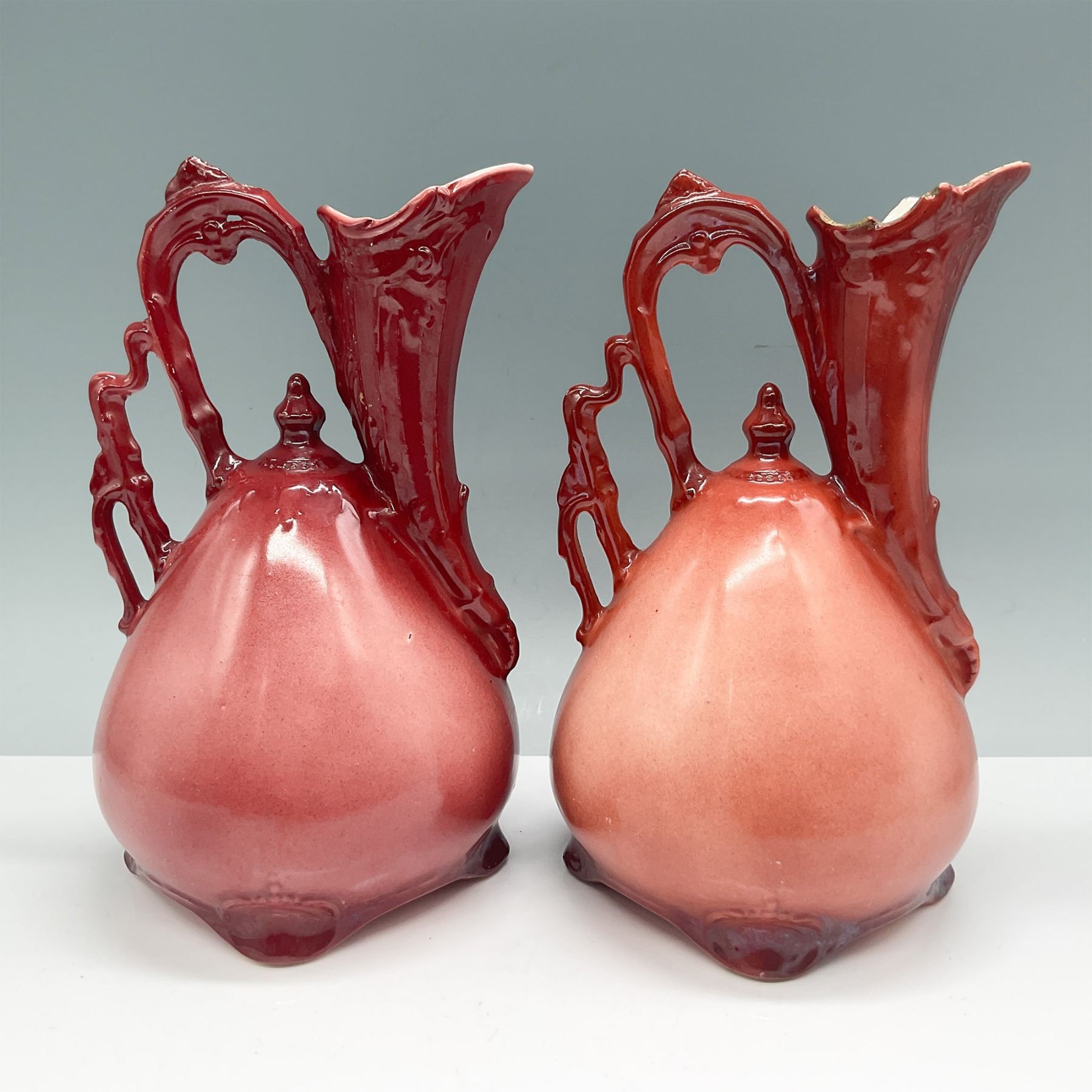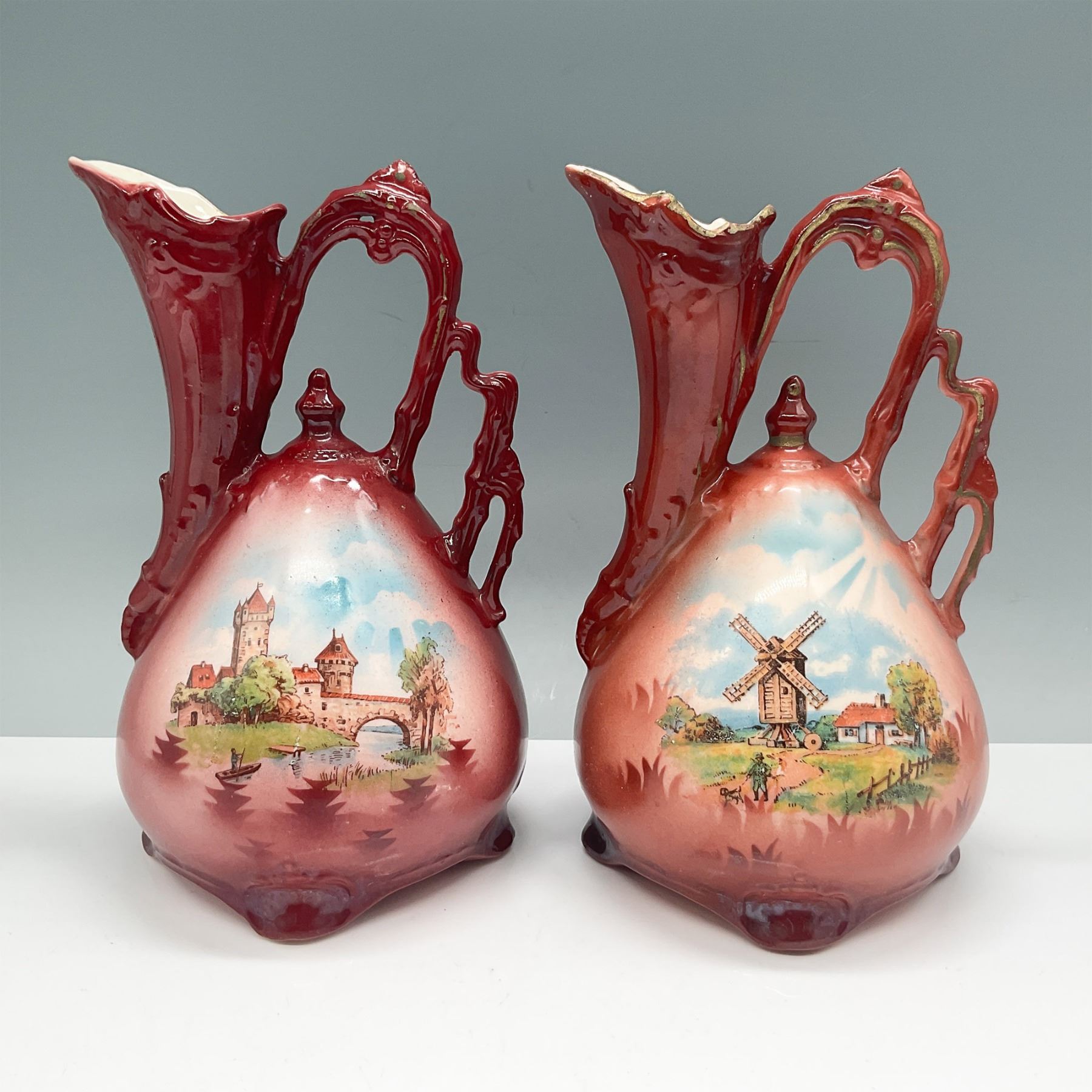 Pair of vintage hand-painted pottery pitchers, each standing 7.25"H. These pitchers feature scenic motifs, with one depicting a castle and bridge, and the other showcasing a windmill and countryside. Designed with ornate, sculpted handles and vibrant red-toned finishes. Both are backstamped "Czechoslovakia," highlighting their origin. A charming addition to any collection of vintage pottery.