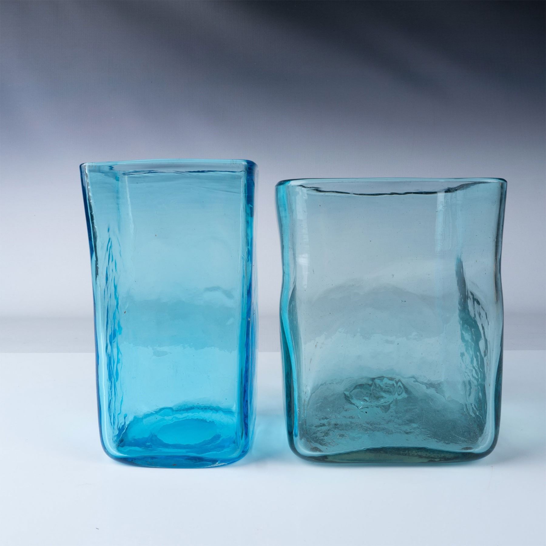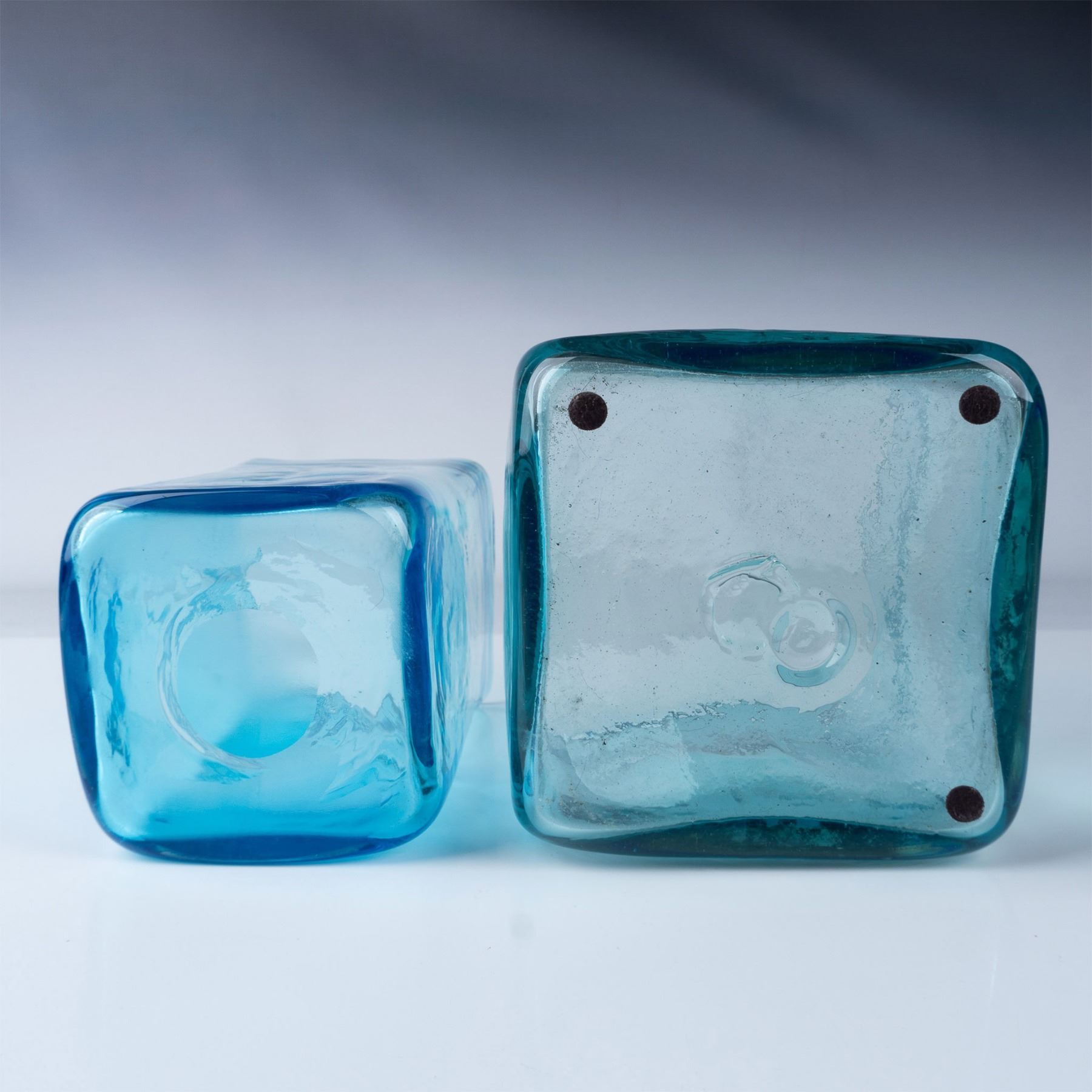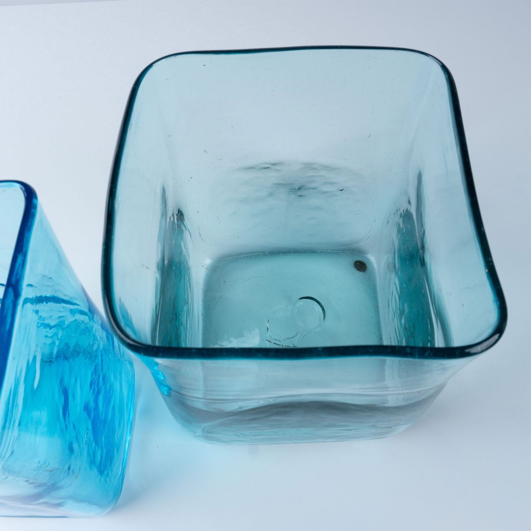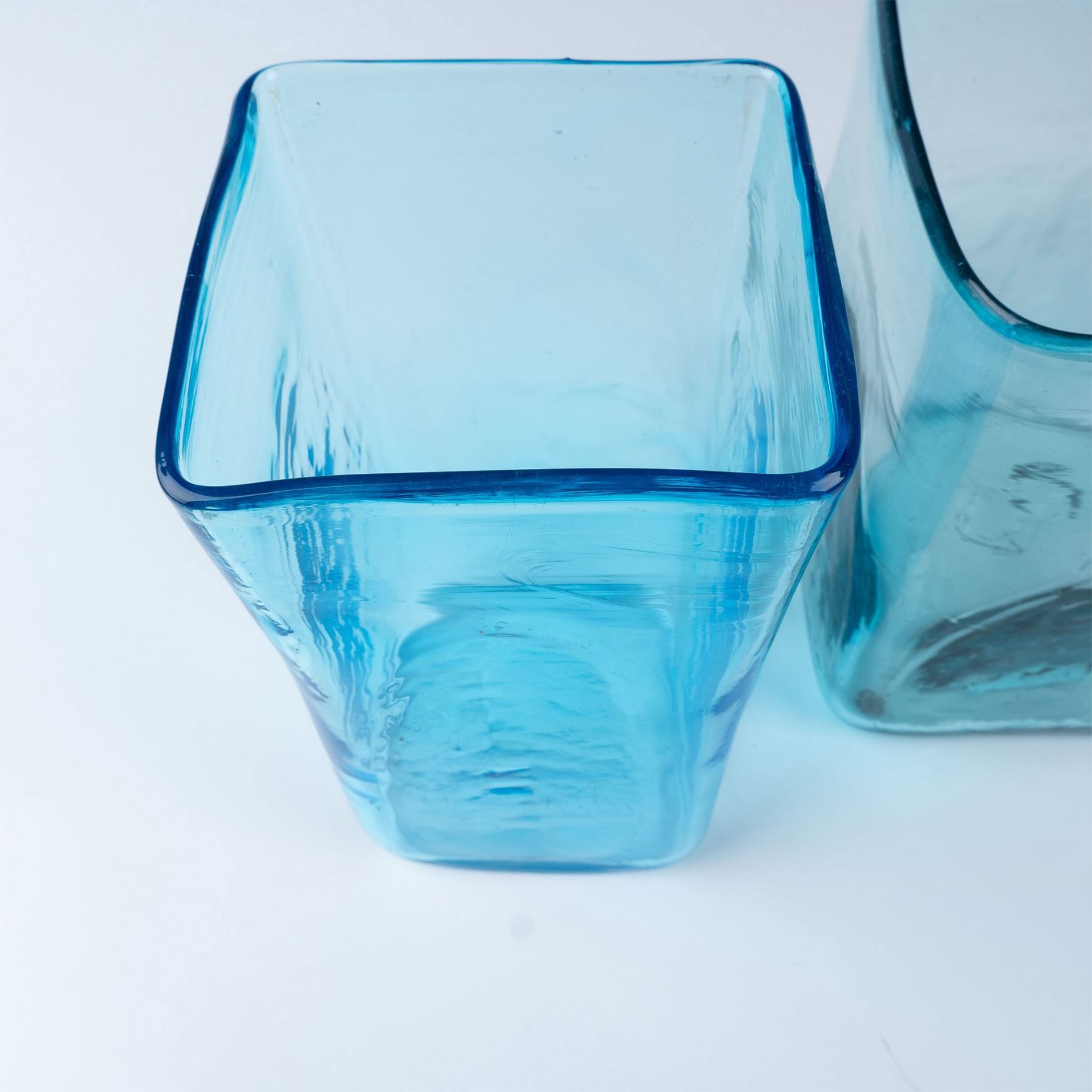 This lot features a pair of handblown blue glass vases showcasing a striking modern design. The vases exhibit a square shape with slight organic asymmetry, characteristic of artisanal glassmaking techniques. Each vase's surface displays natural bubbling and irregularities, enhancing their handcrafted appeal. The bases are polished, with one vase featuring protective felt pads for stability. These decorative pieces are perfect for adding a touch of vibrant color and elegance to any interior decor.