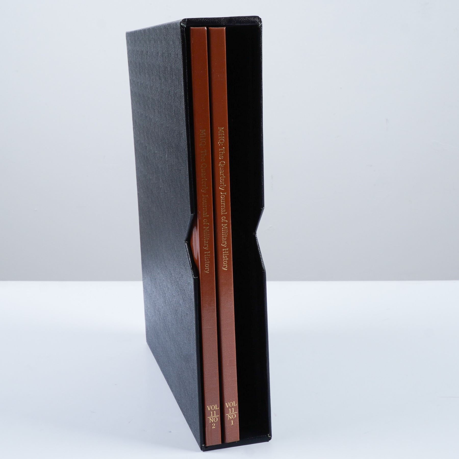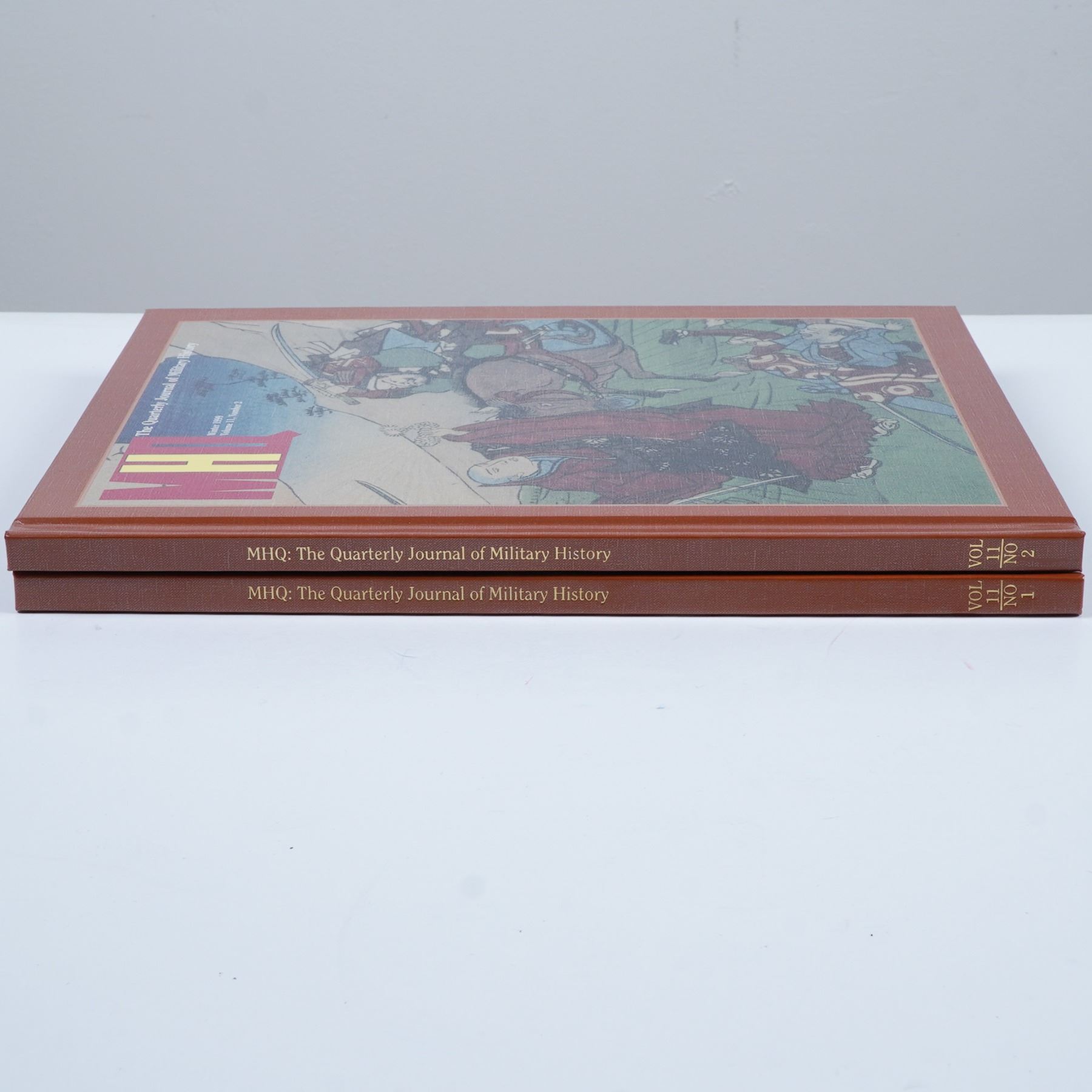 This set includes two bound volumes of MHQ: The Quarterly Journal of Military History, covering Autumn 1998 (Vol. 11, No. 1) and Winter 1999 (Vol. 11, No. 2). These editions feature in-depth articles, high-quality illustrations, and expert analyses on significant military events, strategies, and historical conflicts. Bound in brown covers with gold lettering, this set is an excellent resource for historians, collectors, and military enthusiasts. Each book measures 9"L x 11.5"H