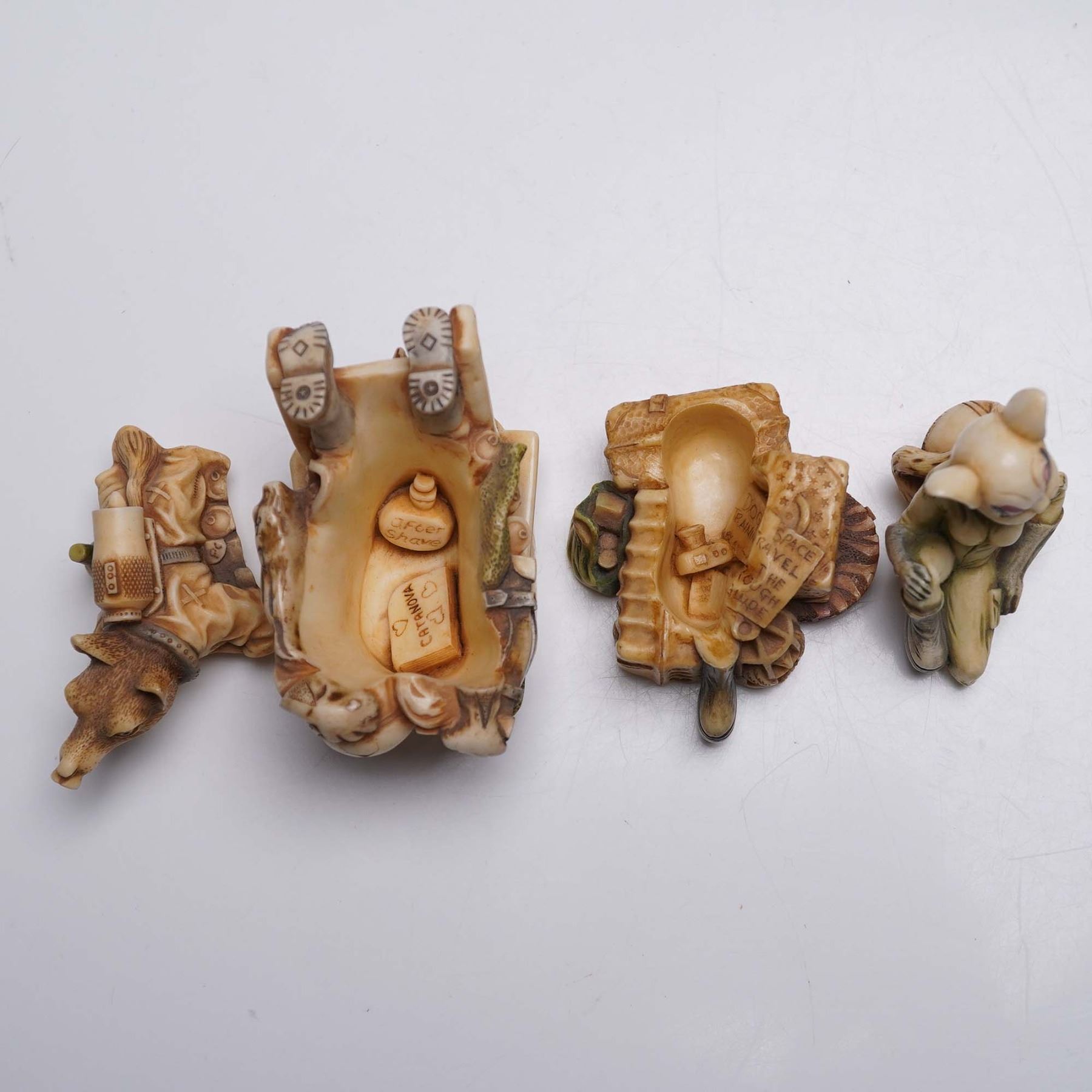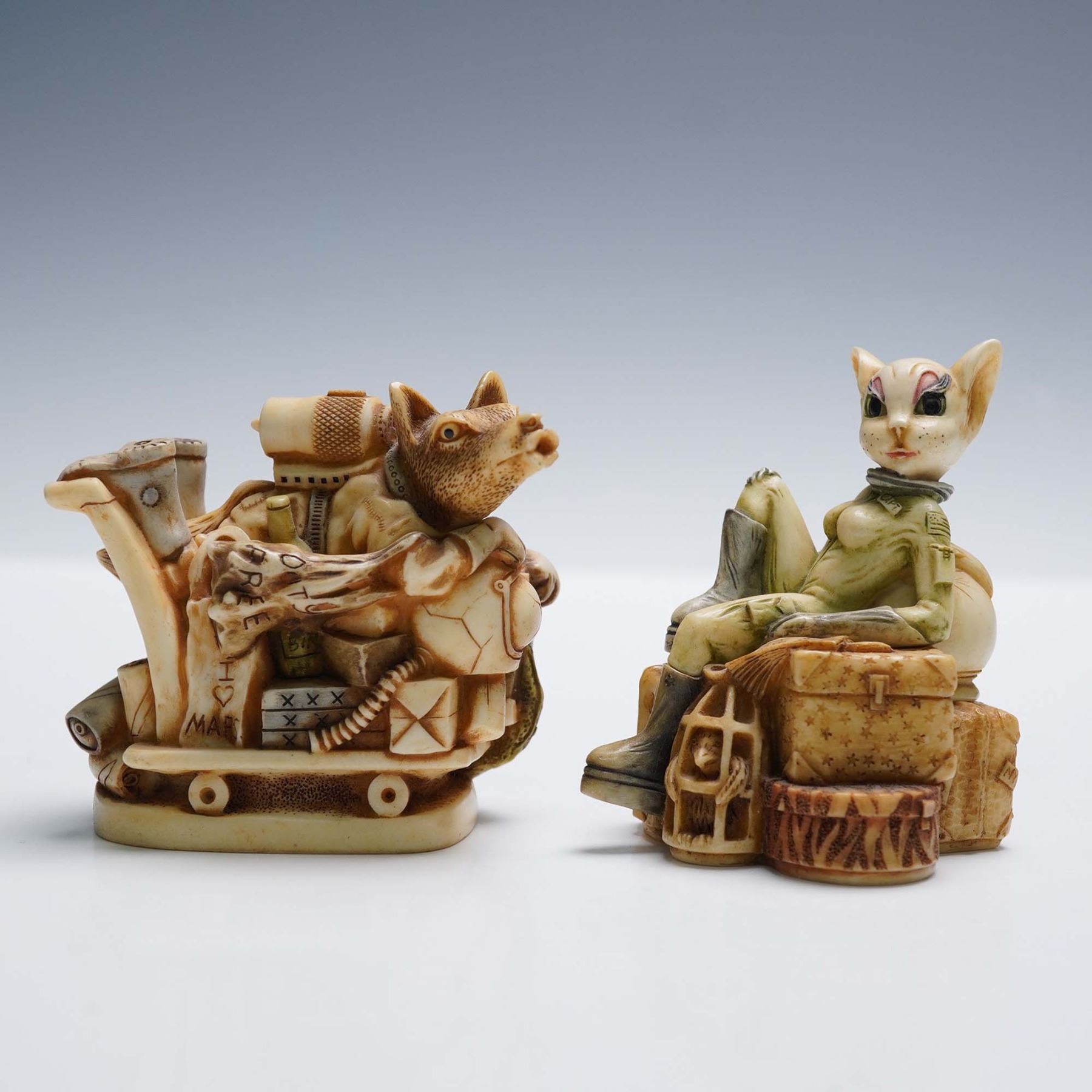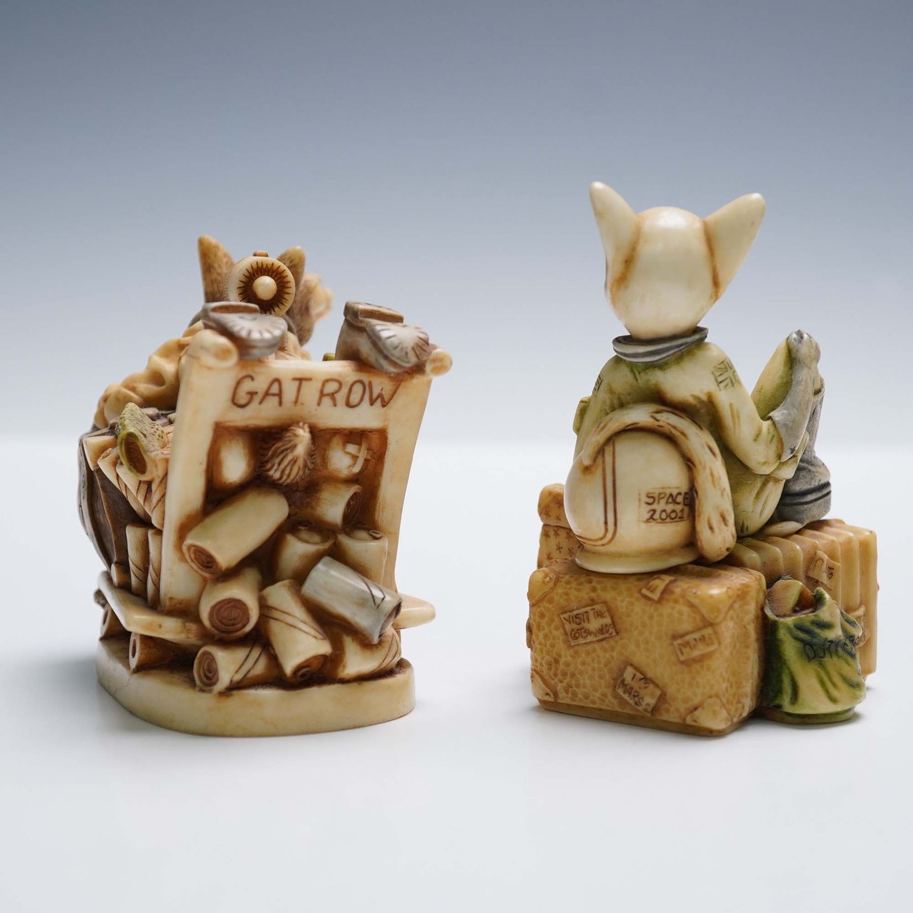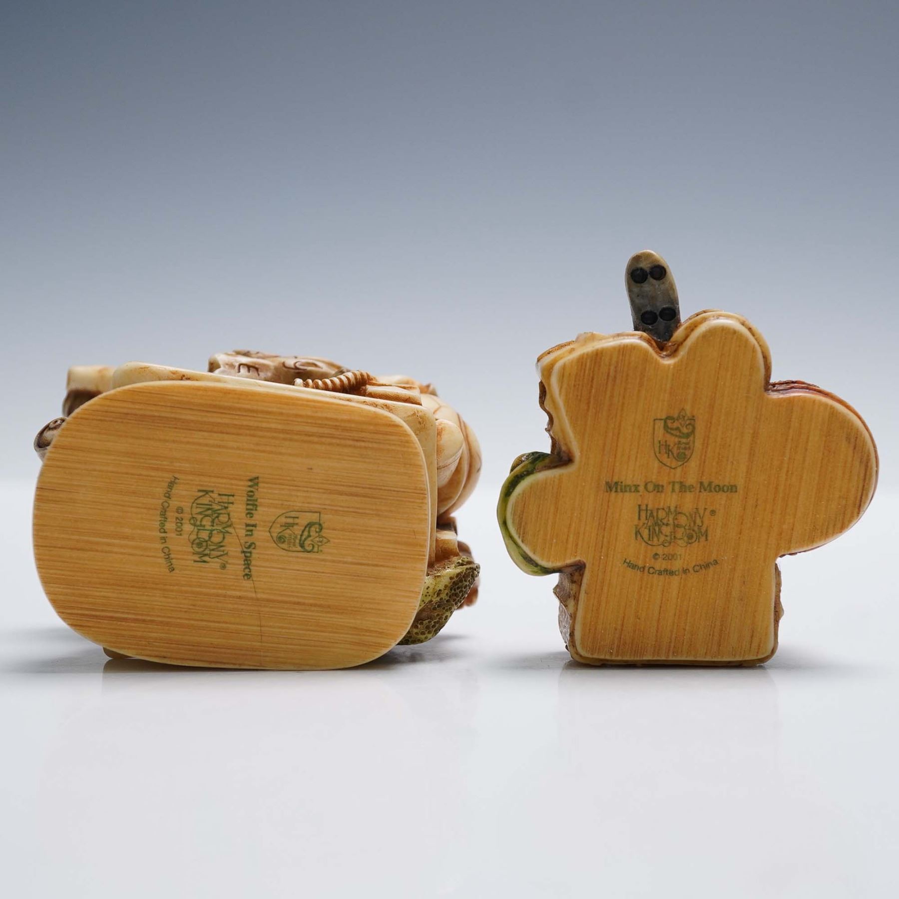 Two intricately sculpted Harmony Kingdom figurines titled Wolfie in Space and Minx on the Moon, featuring whimsical anthropomorphic animal characters in detailed space-travel attire. Wolfie in Space portrays a wolf piloting a vessel packed with gear, while Minx on the Moon features a stylized feline reclining on a stack of interstellar luggage. Both pieces are marked on the base and dated 2001, with the original Harmony Kingdom stamp and titles visible. Largest item measures 2.75"H.