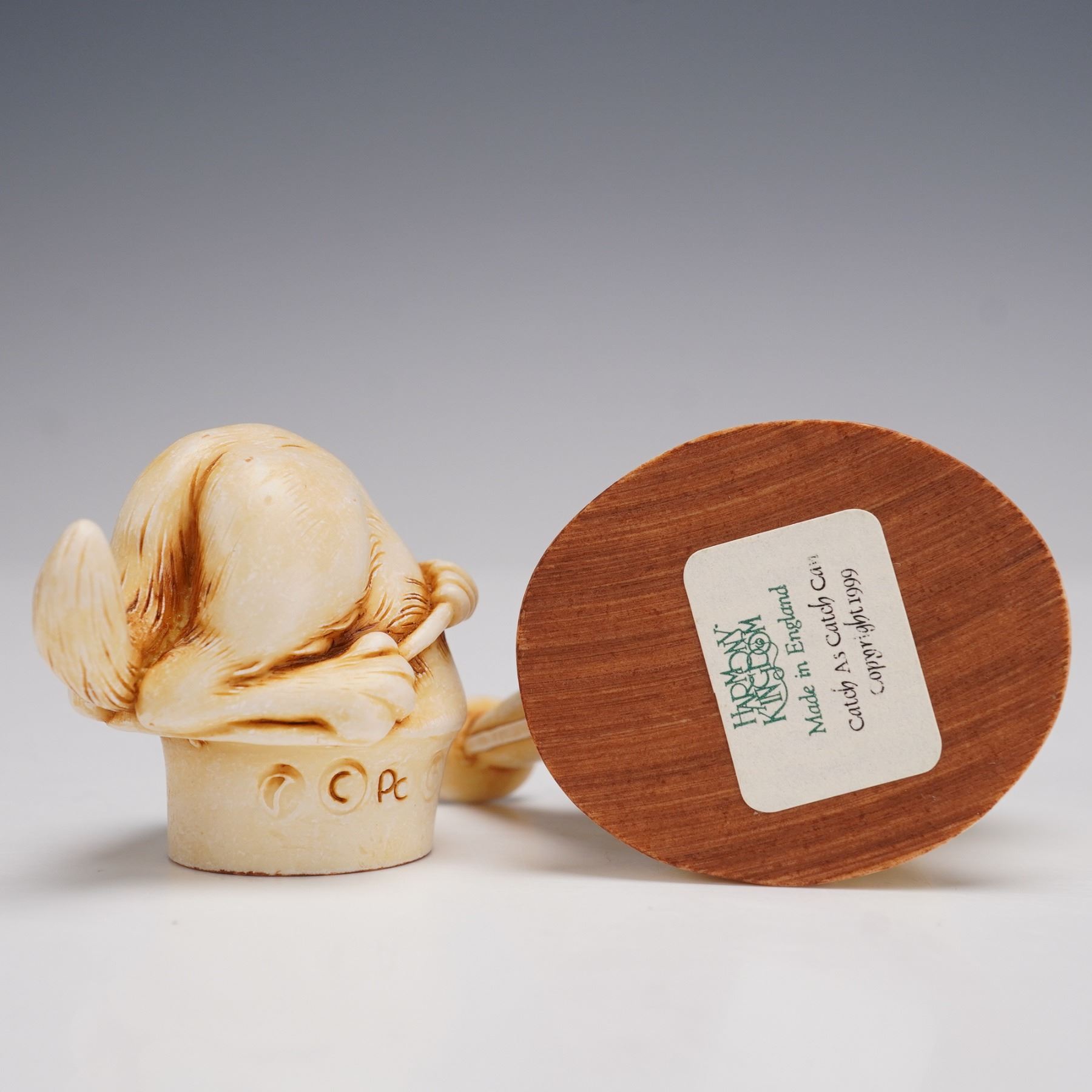 Pair of Harmony Kingdom figurines including Pillage, a pendant parrot with aquamarine plumage accompanied by a cord, complete with original box, and Tin Cats, depicting a dog with its head inside a watering can, also with box and original sticker to the underside.