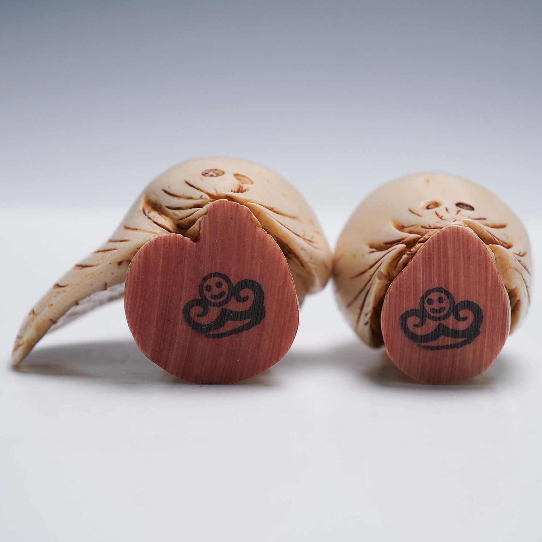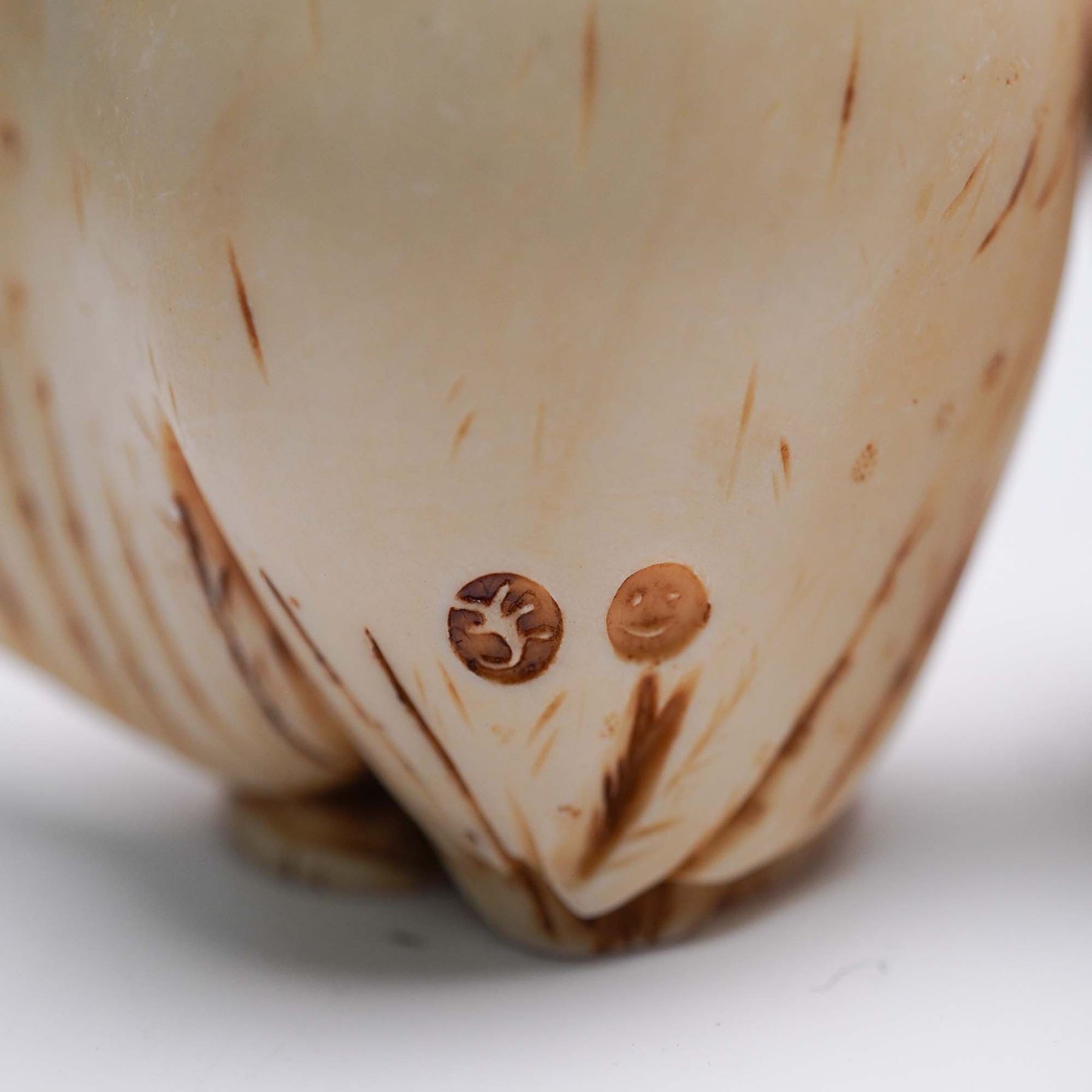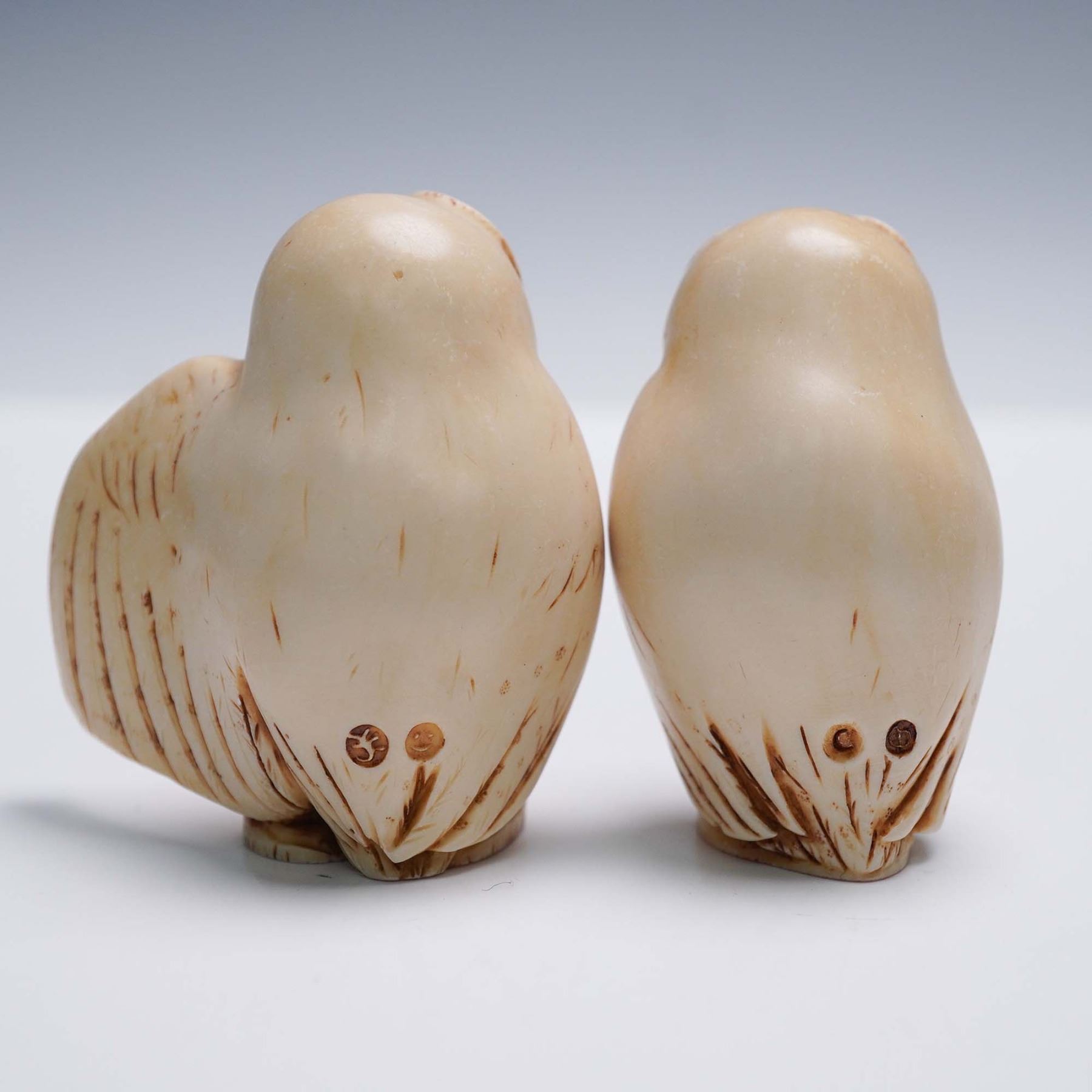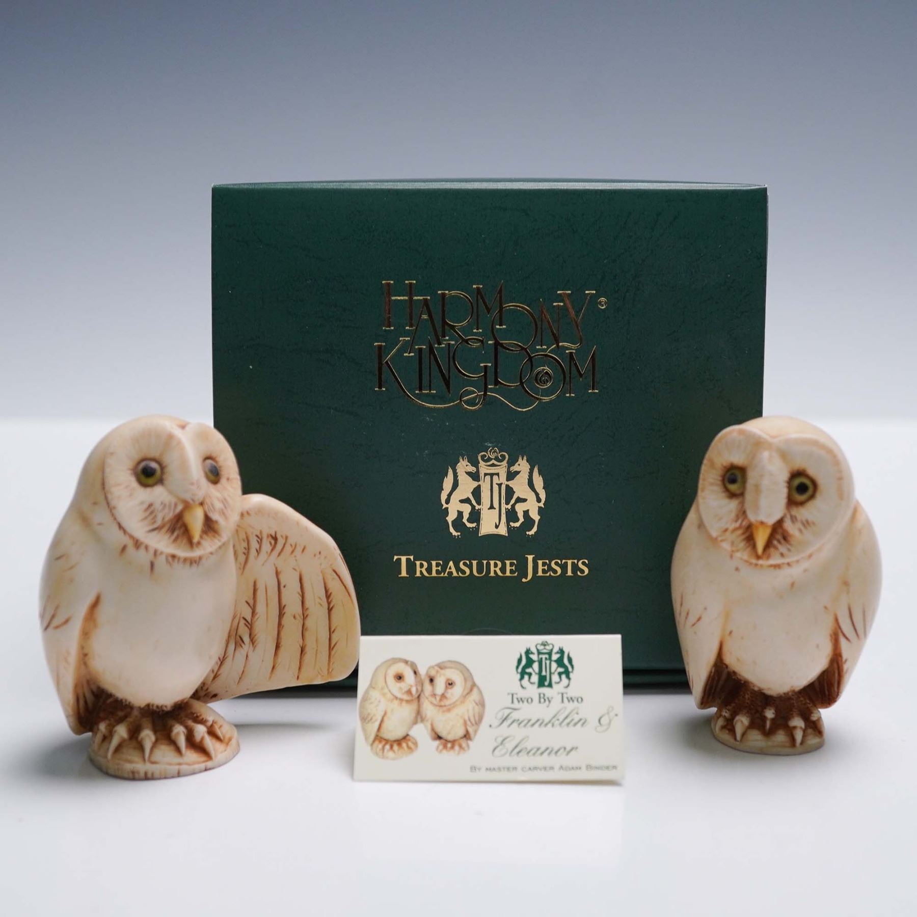 Set of two Harmony Kingdom Treasure Jests figurines titled Franklin & Eleanor, part of the "Two by Two" series sculpted by master carver Adam Binder. These intricately detailed owls are carved in the brand's signature resin style and feature hand-finished details with a smooth ivory-like appearance. Both figurines bear the Harmony Kingdom backstamp and come with the original green box and accompanying card insert.