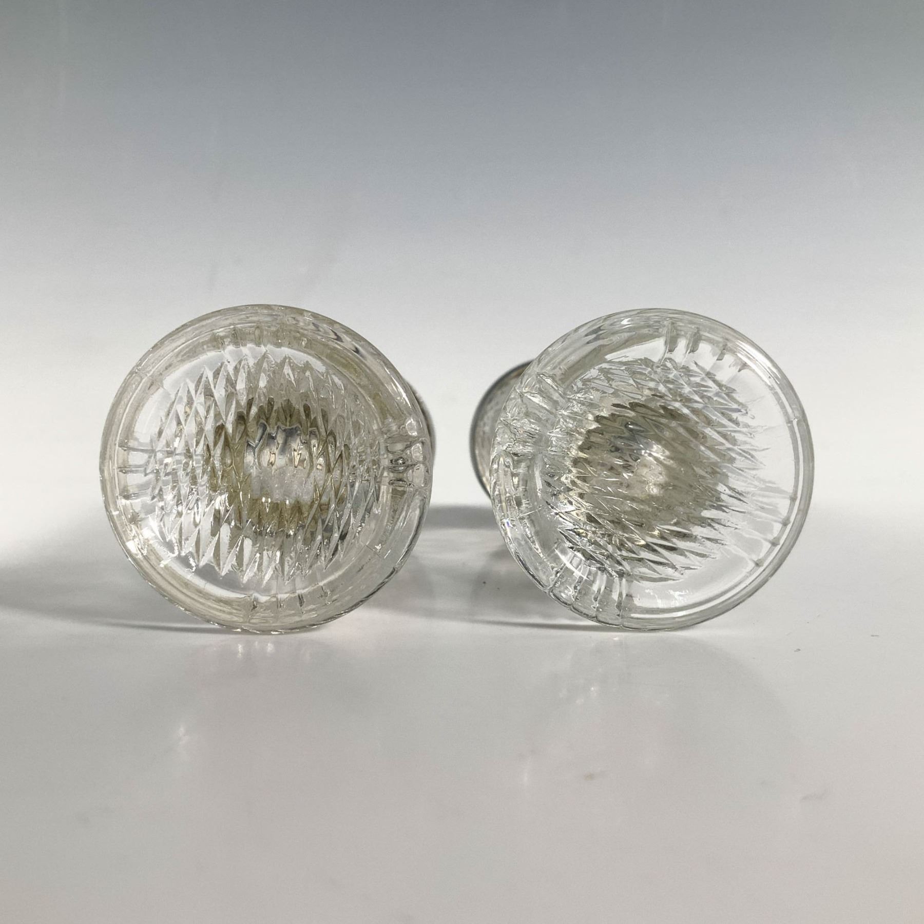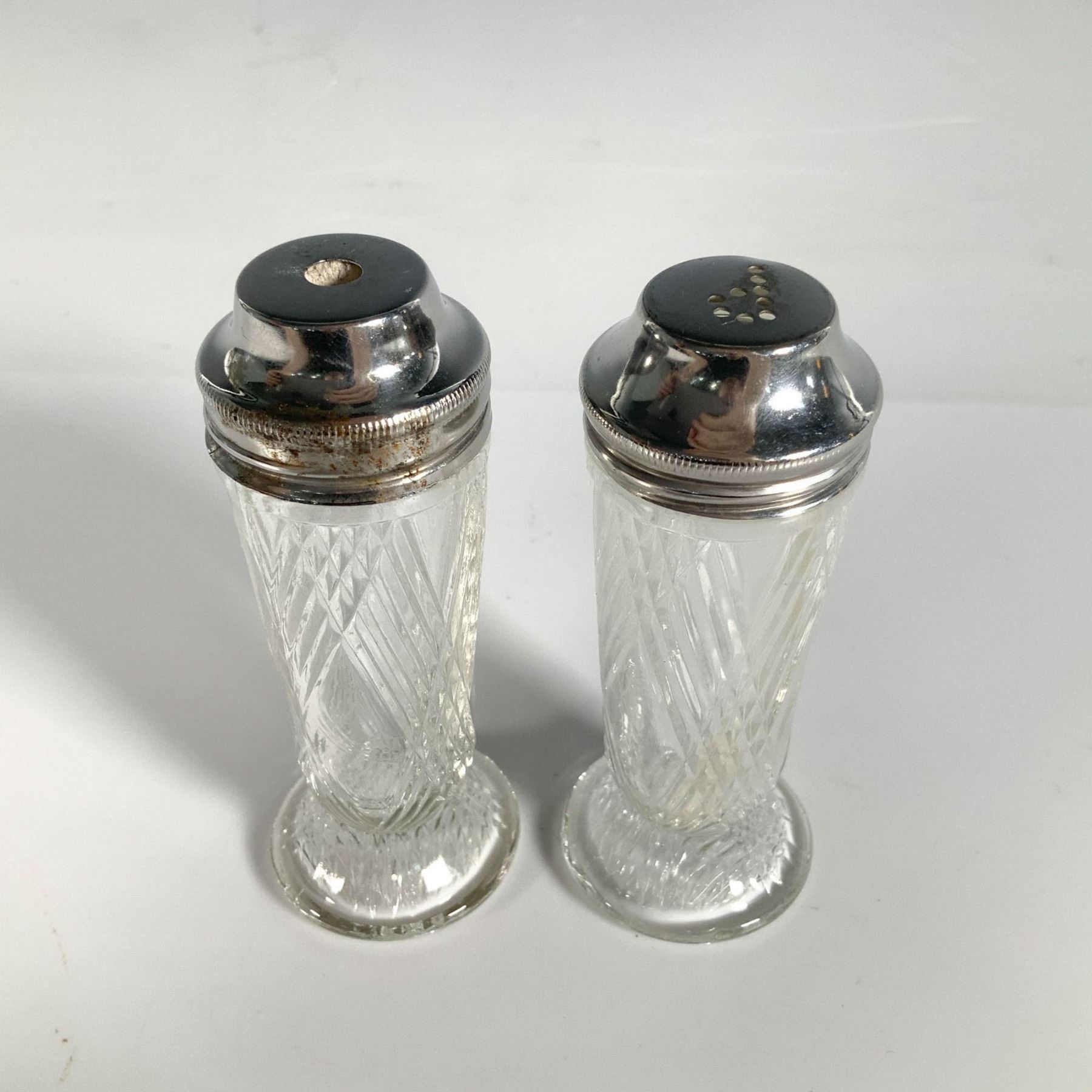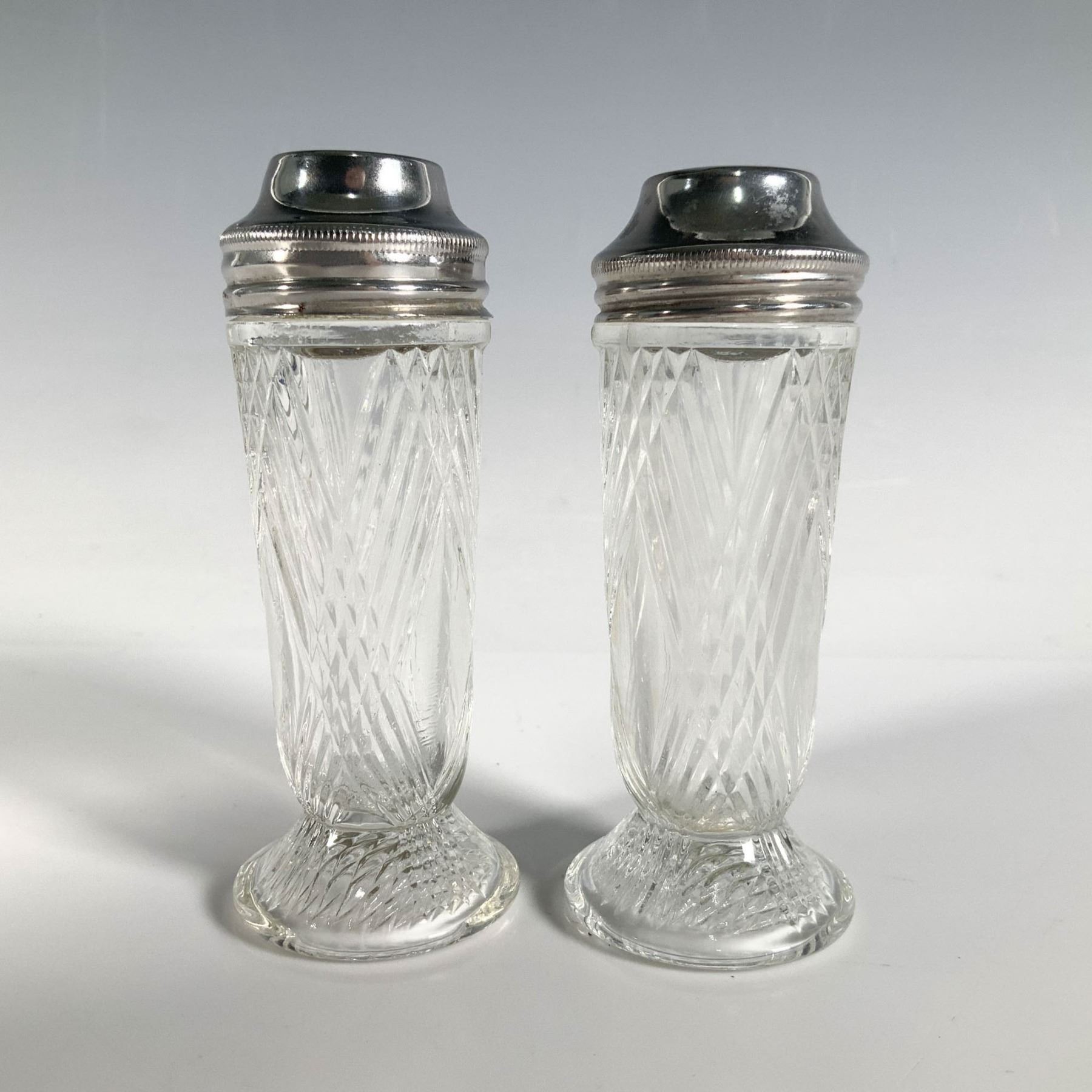 A pair of tall, clear salt and pepper shakers, intricately designed with intersecting cut lines that create a stunning pattern, topped with sleek metal caps. Dimensions of the shakers: 1.25"L x 1.25"W x 3.75"H.