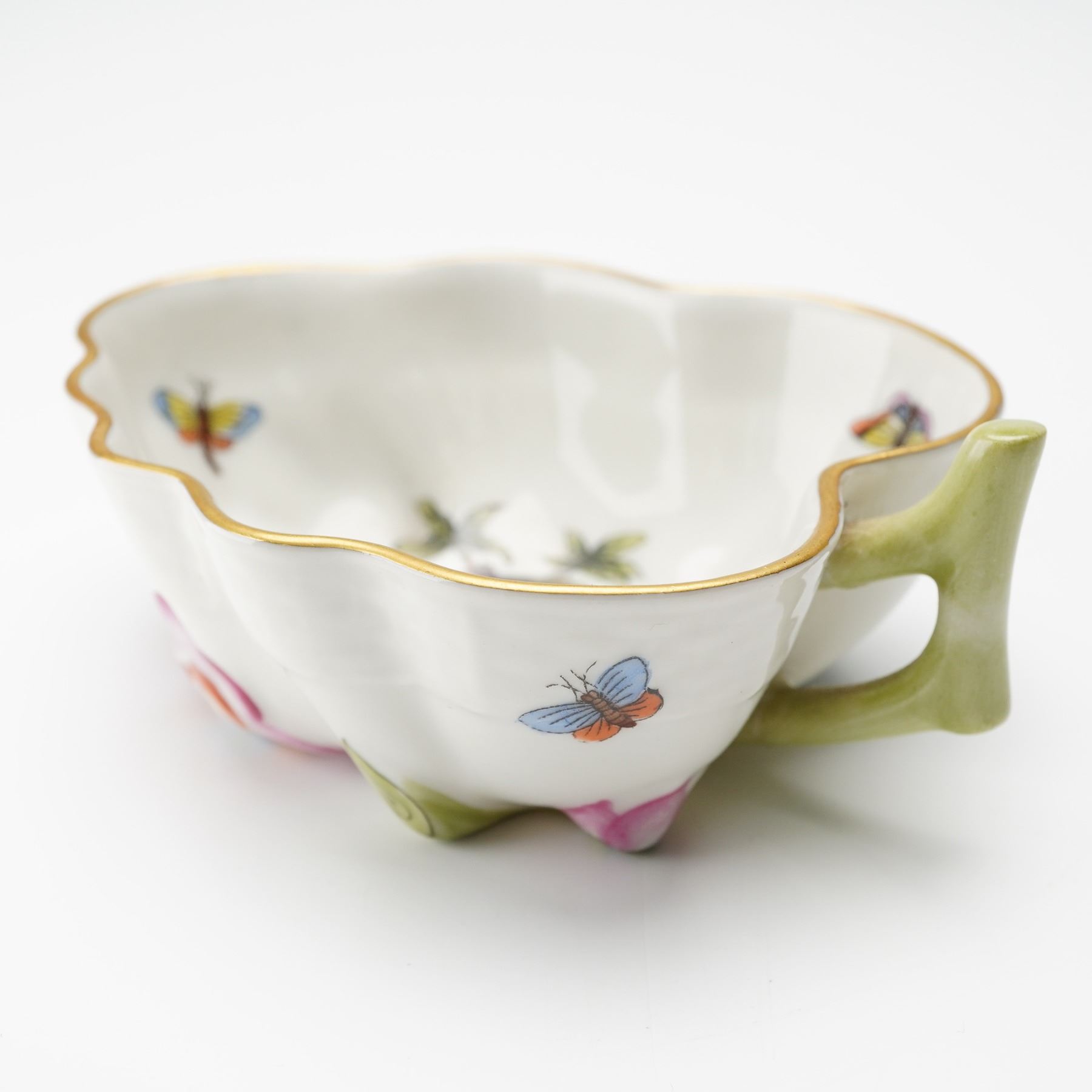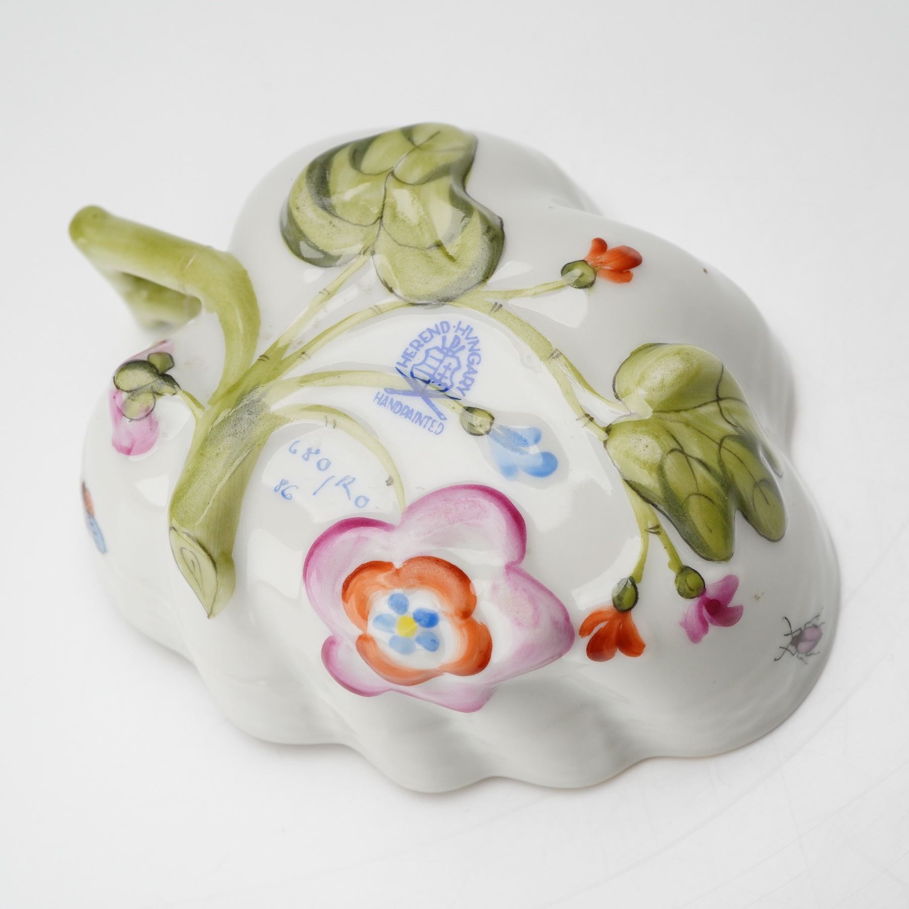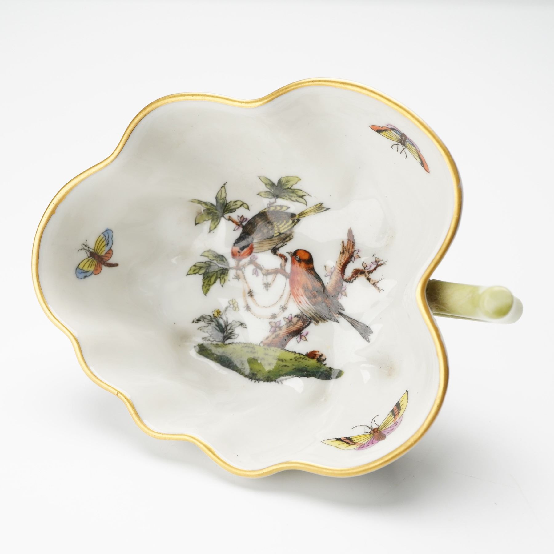 A pair of finely crafted porcelain leaf-form dishes, one by Herend Hungary and the other by Dresden Saxony. The larger Herend dish features the Rothschild Bird pattern, showcasing hand-painted songbirds perched among foliage with surrounding butterflies and gilt-edged trim, complete with a green branch-style handle. The smaller Dresden dish presents an elegant scalloped form adorned with applied polychrome flowers in vibrant hues of blue, orange, yellow, and purple, highlighted by a gilded rim. Both pieces exhibit the artistry and detail characteristic of their renowned European manufactures. Both pieces bear their manufacturer marks.