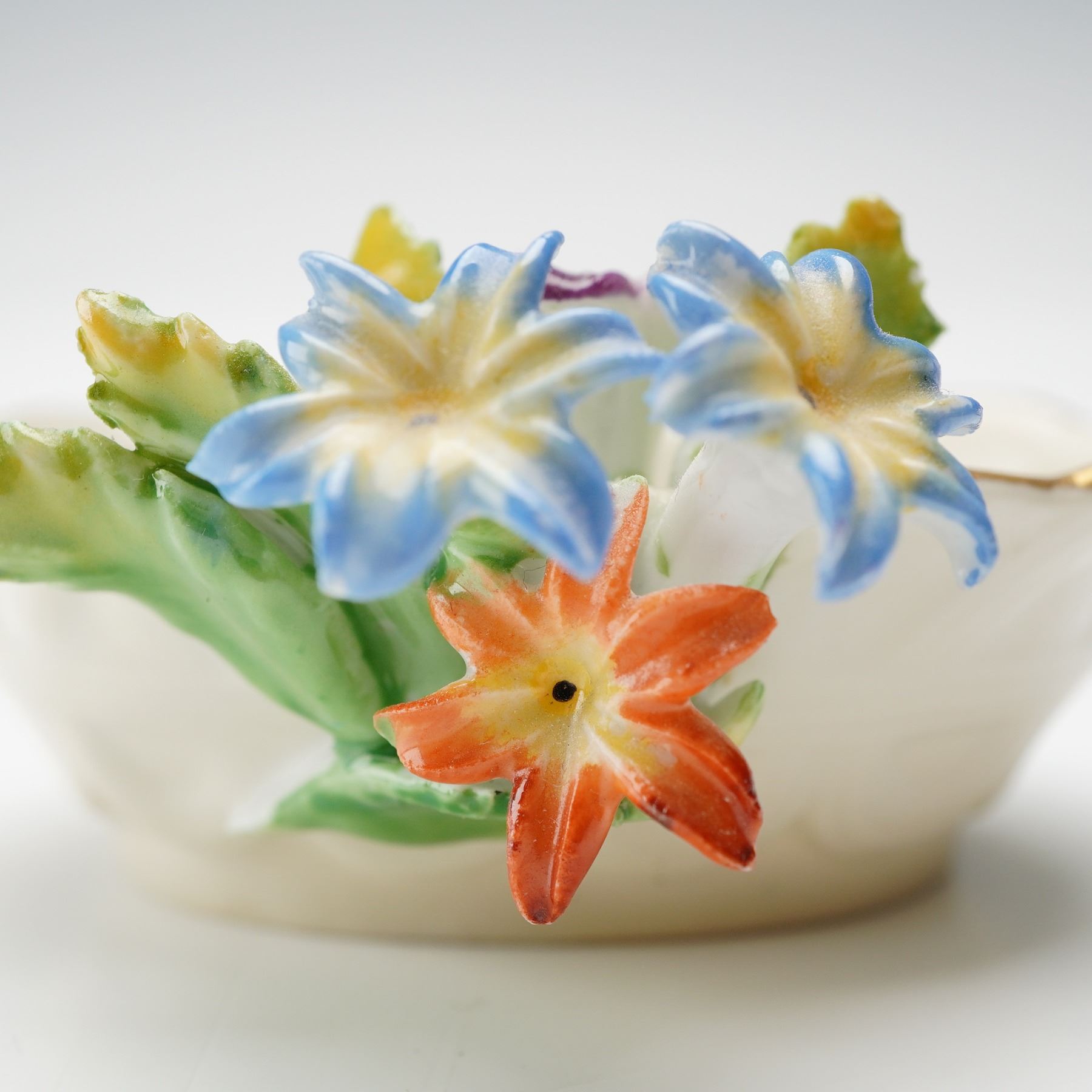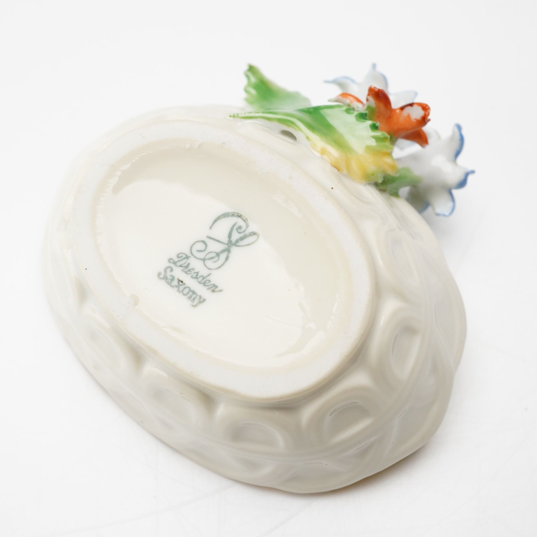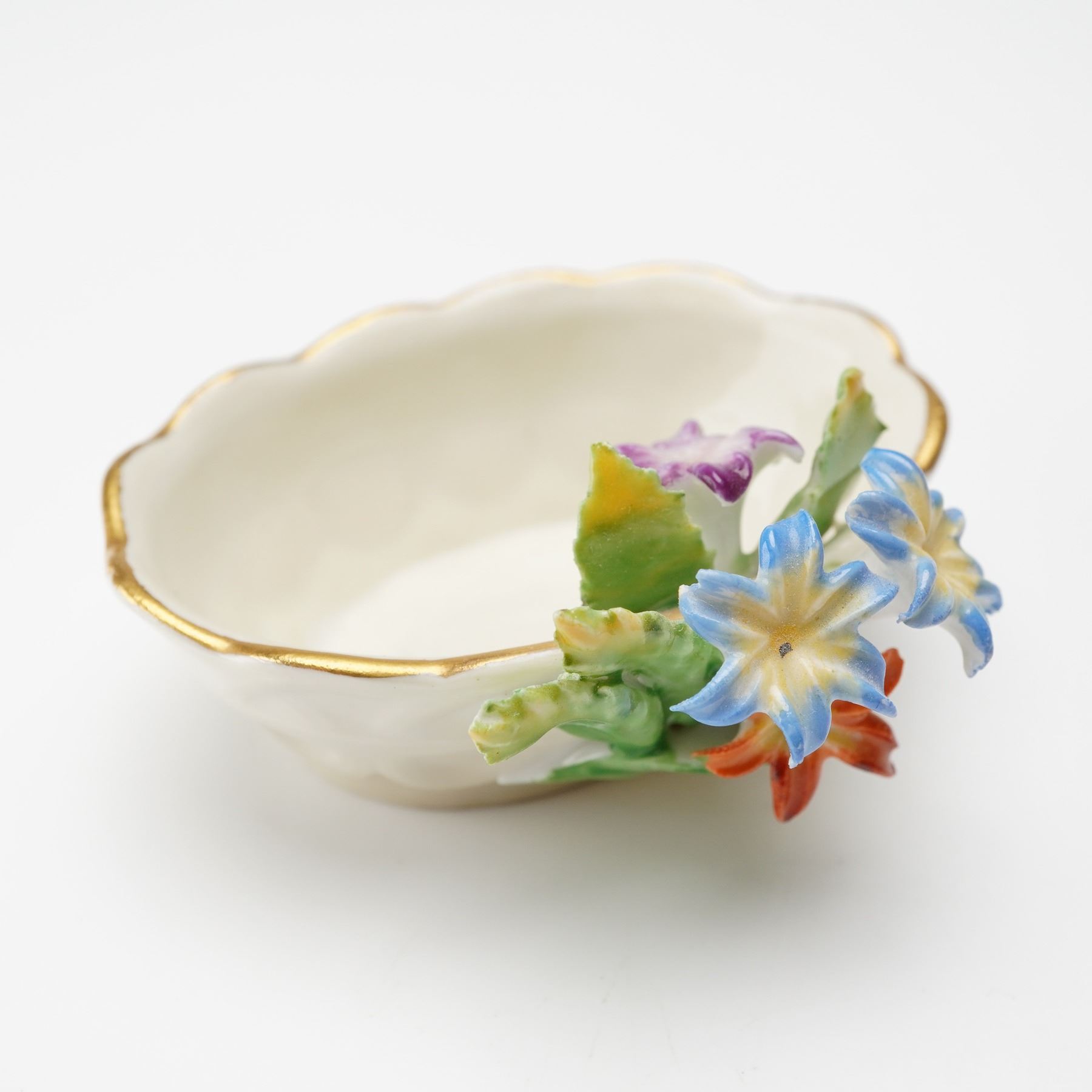 A pair of finely crafted porcelain leaf-form dishes, one by Herend Hungary and the other by Dresden Saxony. The larger Herend dish features the Rothschild Bird pattern, showcasing hand-painted songbirds perched among foliage with surrounding butterflies and gilt-edged trim, complete with a green branch-style handle. The smaller Dresden dish presents an elegant scalloped form adorned with applied polychrome flowers in vibrant hues of blue, orange, yellow, and purple, highlighted by a gilded rim. Both pieces exhibit the artistry and detail characteristic of their renowned European manufactures. Both pieces bear their manufacturer marks.
