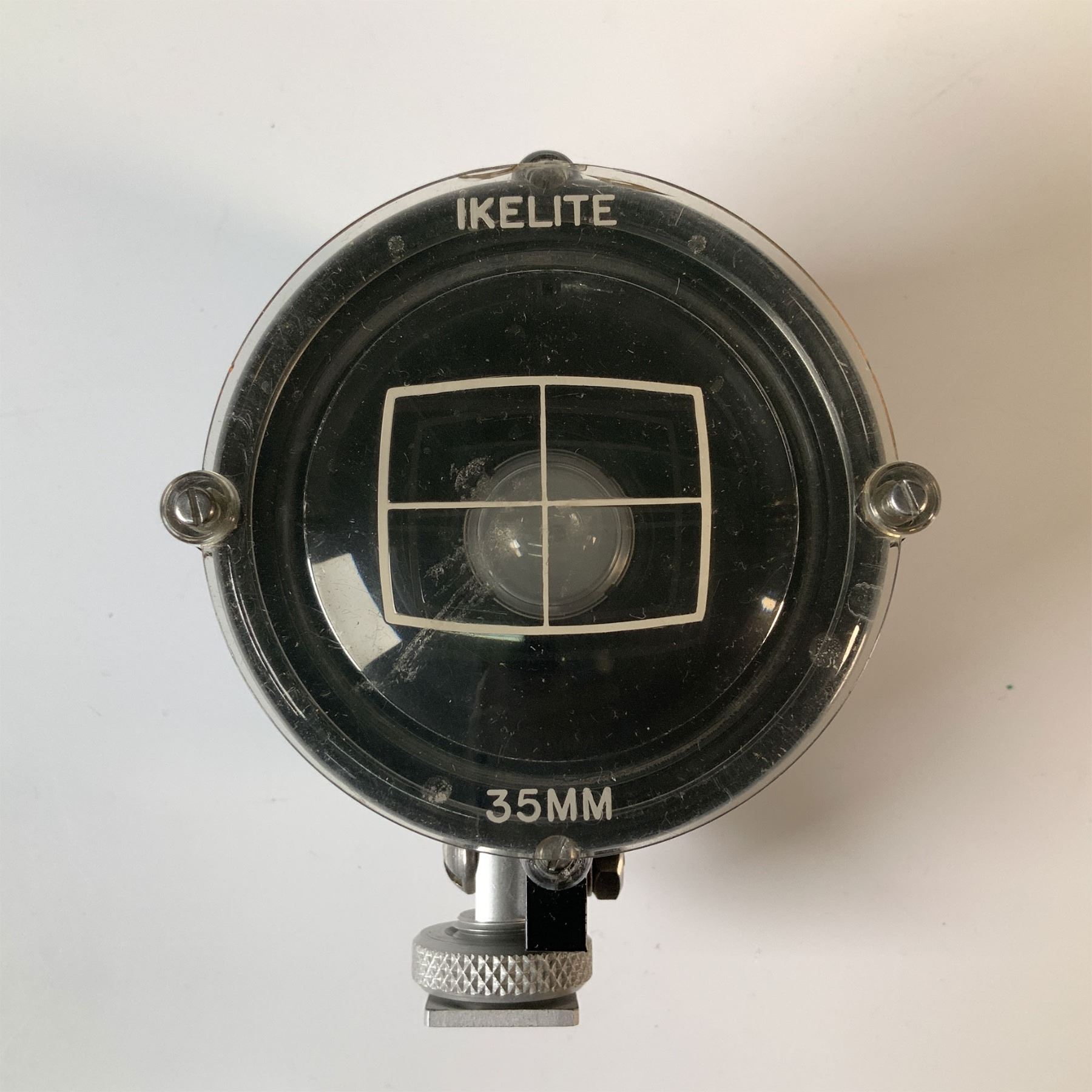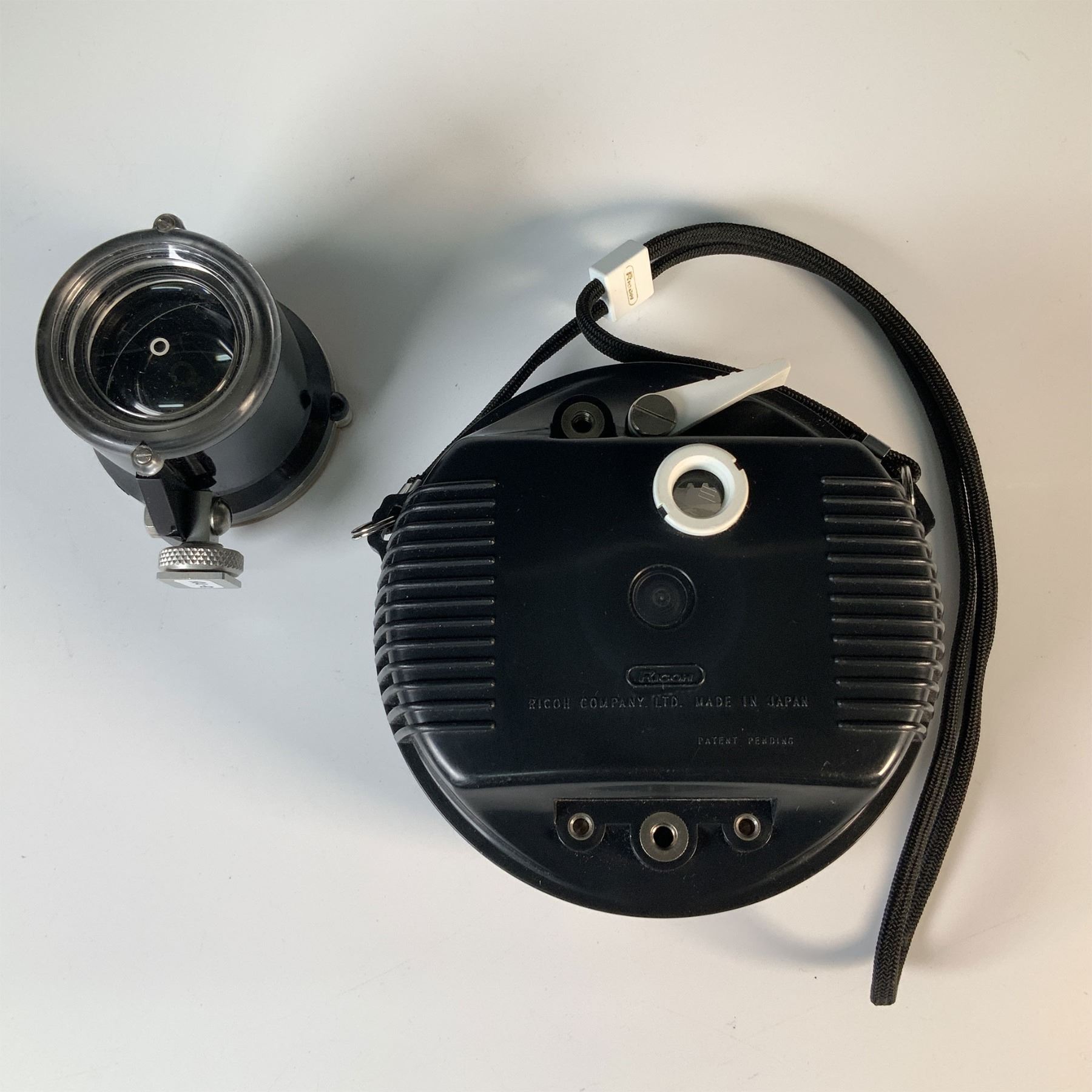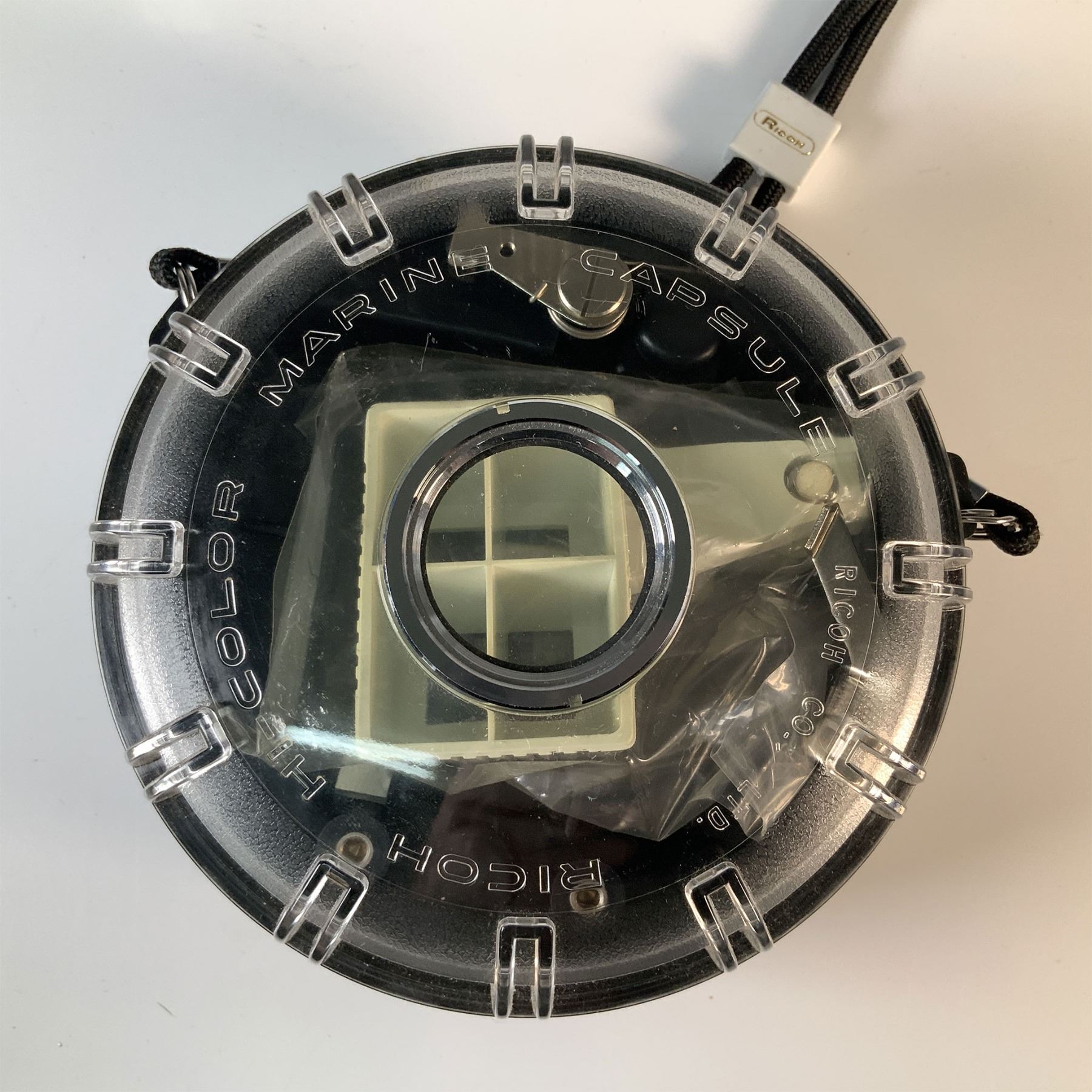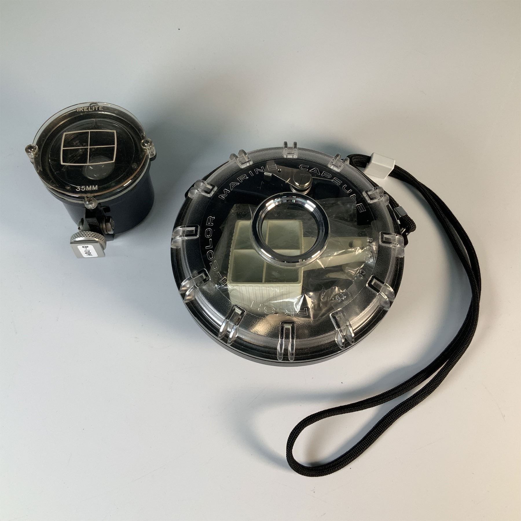 A pair of vintage underwater photography accessories including an Ikelite 35mm underwater camera housing and a Hi-Color Marine Capsule. The Ikelite housing features a robust clear acrylic design for underwater use, accommodating 35mm cameras with a secure mounting system. The Hi-Color Marine Capsule, produced by Ricoh in Japan, is designed for underwater protection of cameras or similar devices, with clear viewing panels and multiple attachment points. Both pieces highlight the ingenuity of underwater imaging equipment from the late 20th century.