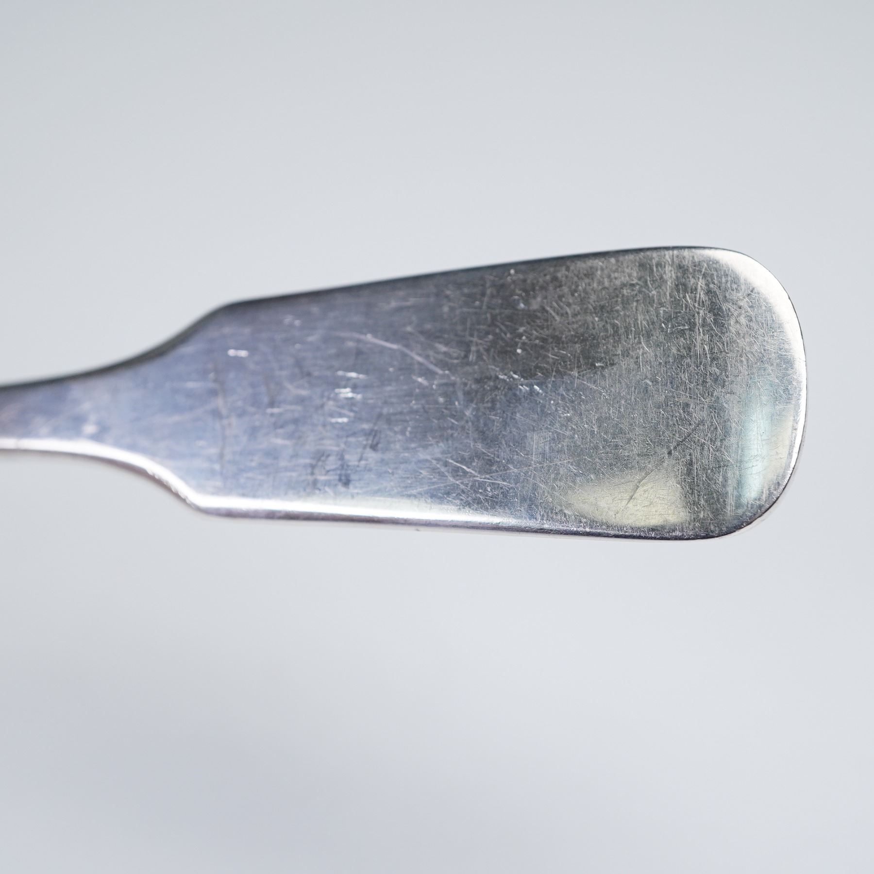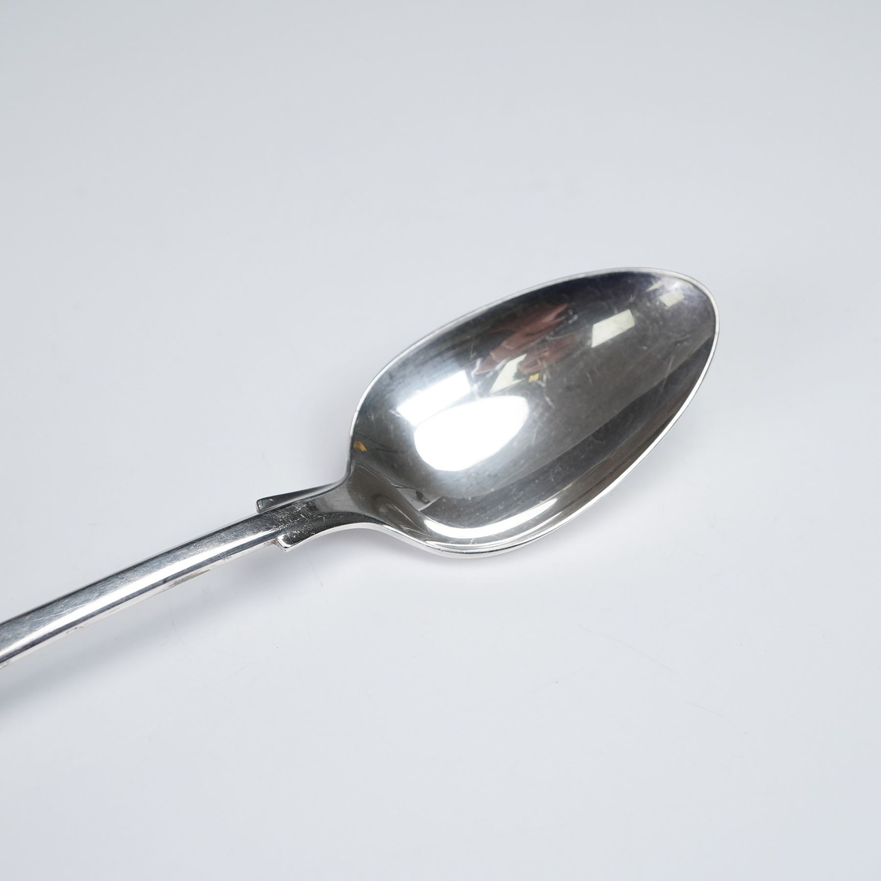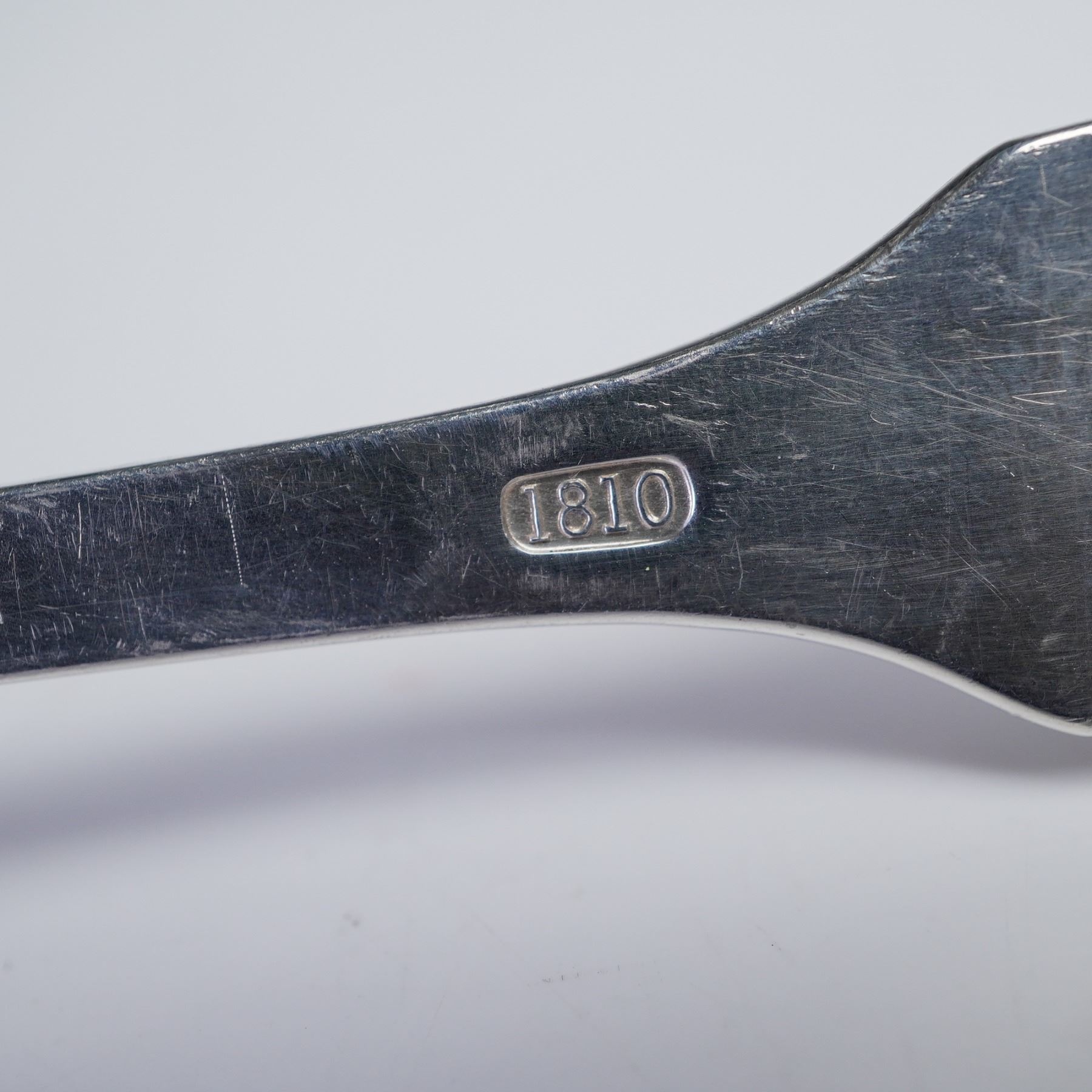Offered here are two sterling silver dessert or oval soup spoons by International Silver, designed in the 1810 pattern. With their understated colonial-inspired design and flat squared handles, these spoons embody timeless simplicity. Both pieces are marked International Sterling and 1810. A useful and collectible pair, well-suited for everyday dining or special occasions. Combined Net Silver 3 troy oz.