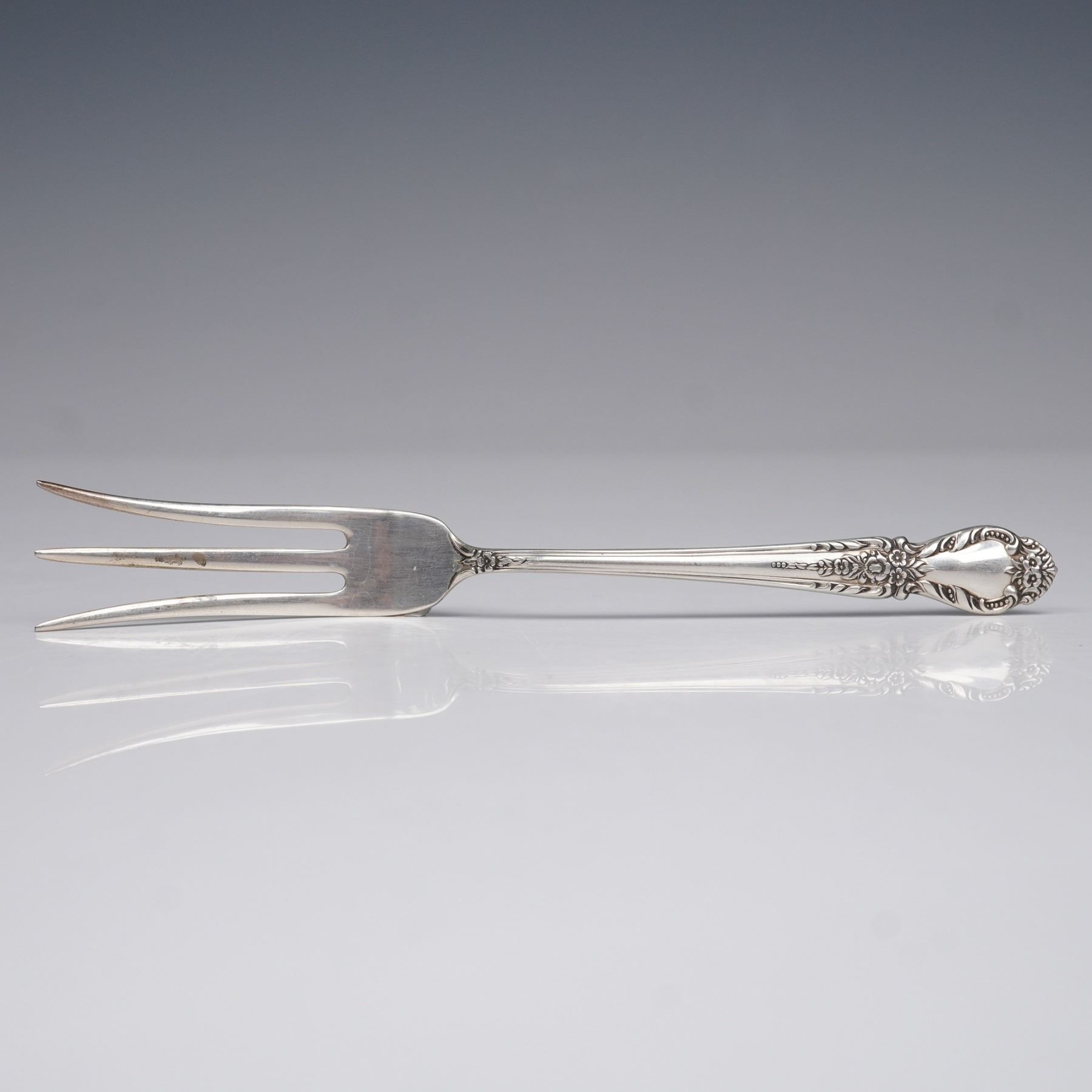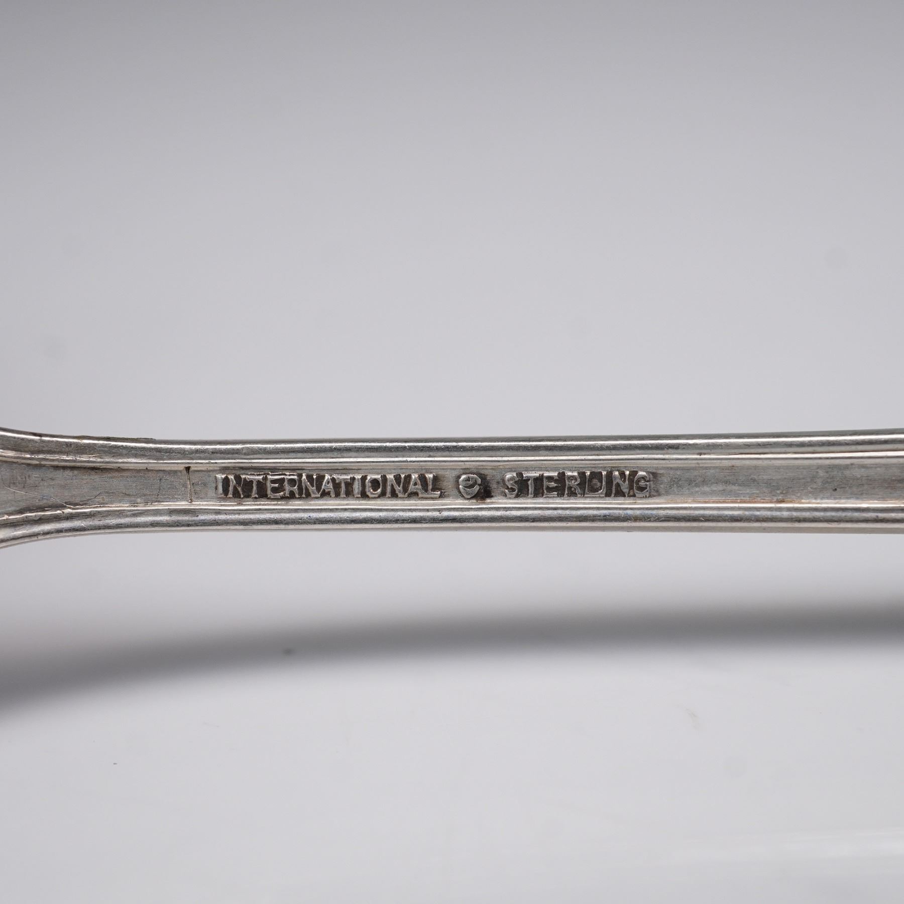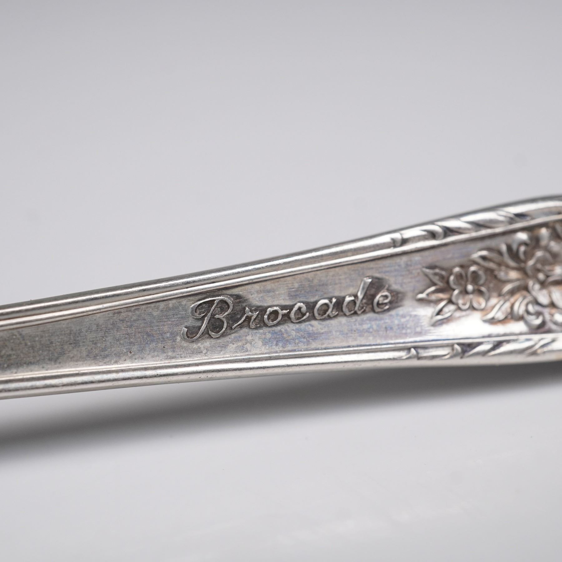 Pair of International Sterling silver lemon forks in the Brocade pattern, introduced in 1950 and discontinued in 1996. Each piece is finely crafted in sterling silver and marked International Sterling on the reverse. The handles feature a raised floral and scroll motif characteristic of the Brocade design. Included are one standard lemon fork and one large lemon fork, both well-suited for serving citrus or garnishes. Net silver .09 troy oz.