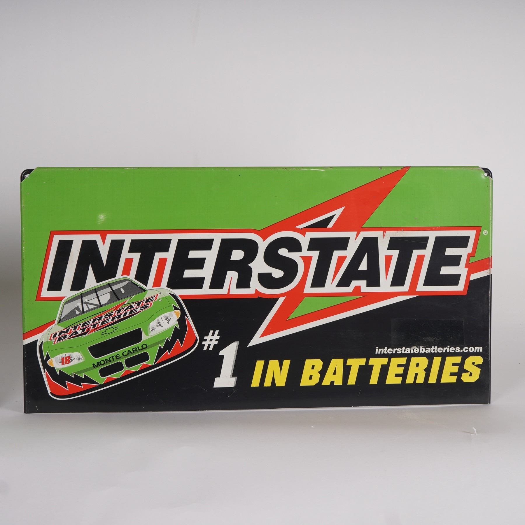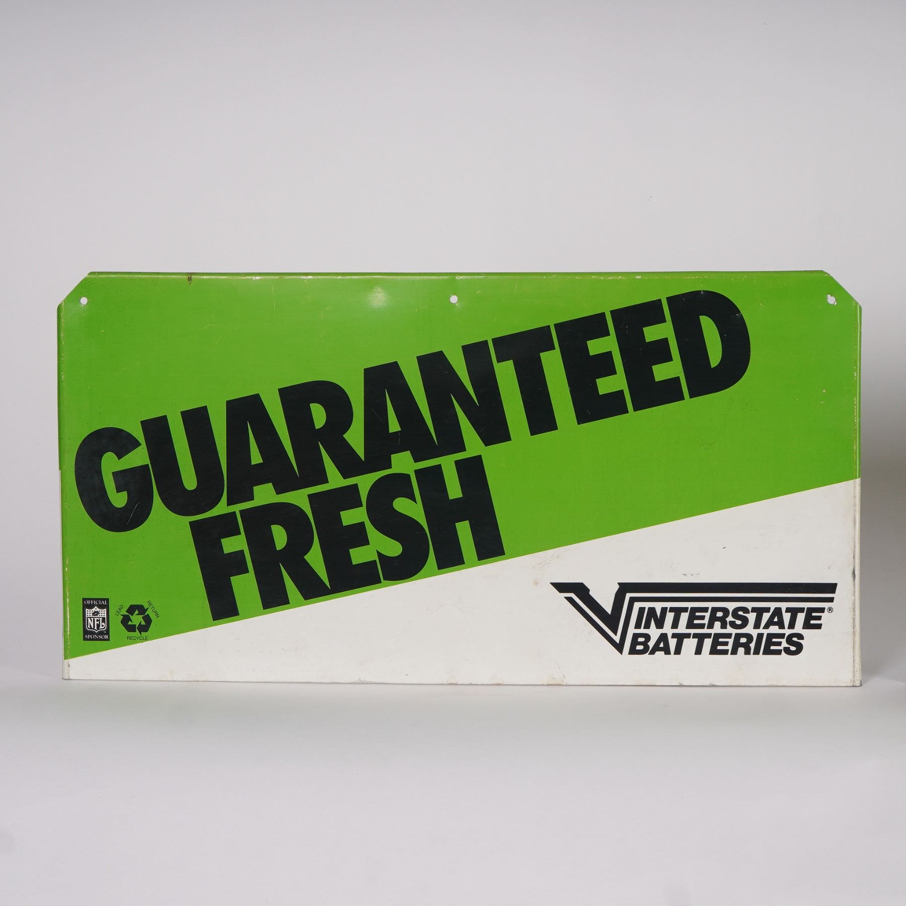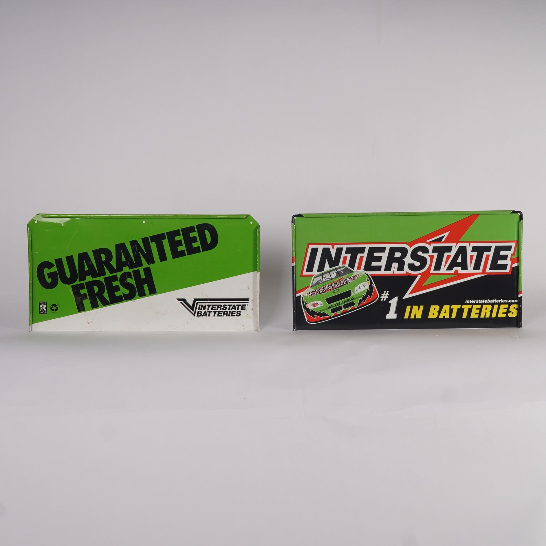 Pair of rectangular metal advertising signs for Interstate Batteries. One sign features the slogan Guaranteed Fresh in bold black lettering on a bright green and white background, complete with recycling symbol and NFL sponsor logo. The second sign showcases a vivid racing theme with the #18 Interstate Batteries Monte Carlo NASCAR car and reads Interstate #1 in Batteries, accented with a lightning bolt graphic and company web address. Both signs are embossed with mounting holes and show vibrant commercial display graphics typical of late 20th-century advertising.