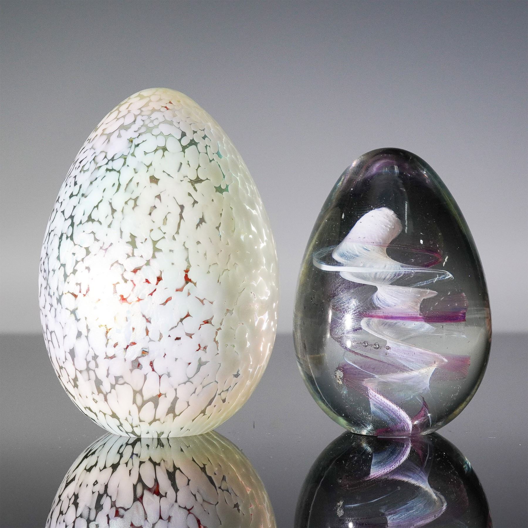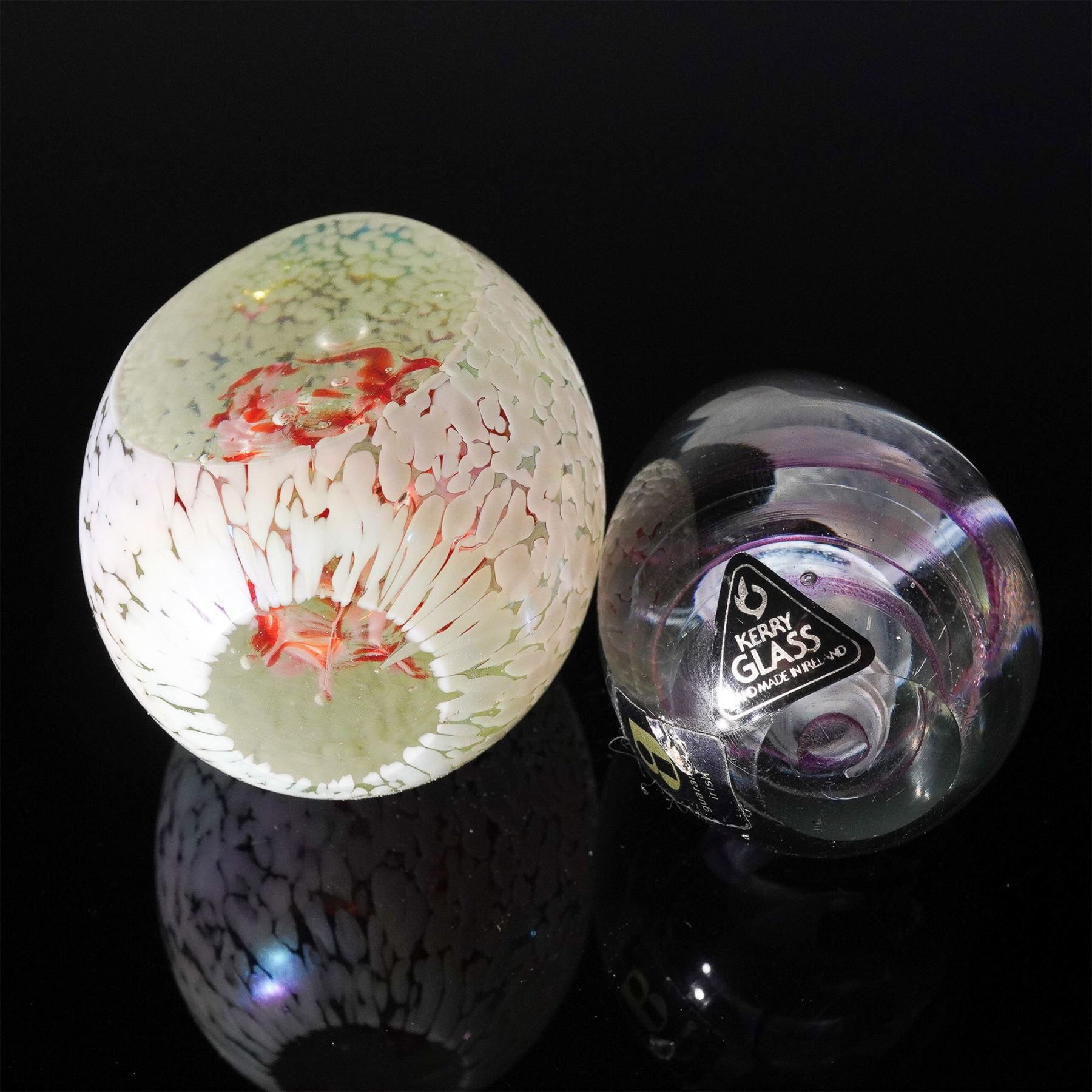 Enchanting set of two hand-blown art glass paperweights, each showcasing distinctive craftsmanship and color. One piece, bearing the original Kerry Glass label, was handmade in Ireland and features graceful swirling ribbons in shades of purple and white suspended within a clear dome. The second paperweight boasts a larger, more organic form with a textured speckled shell in soft iridescent tones, enclosing a fiery red center and subtle trapped bubbles. Together, these sculptural pieces highlight the variety and artistry of studio glass, making a vibrant addition to any paperweight or art glass collection. Largest paperweight measures 3.25"H.