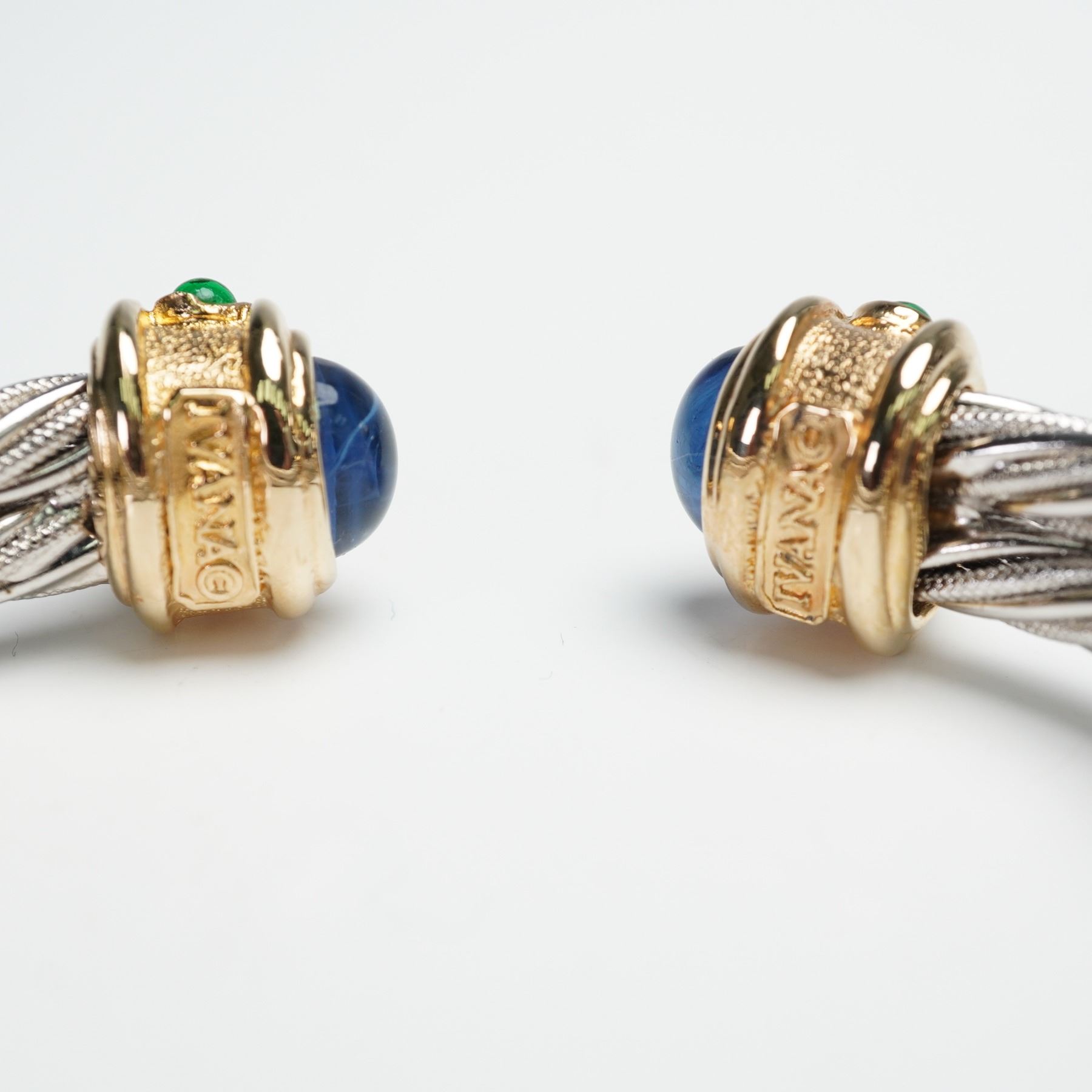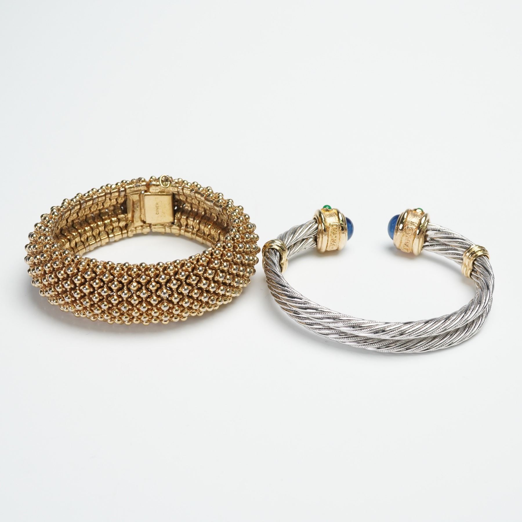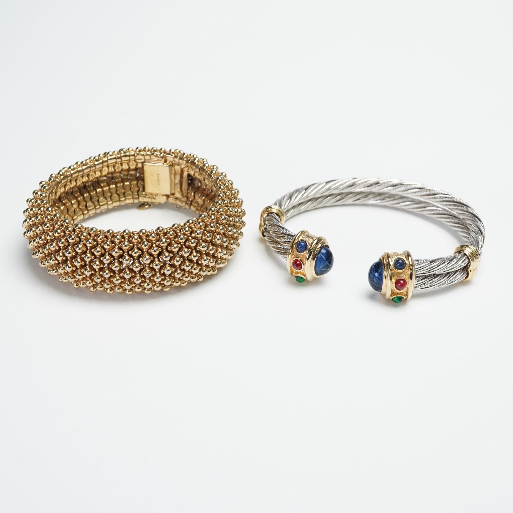 This elegant two-piece collection of bracelets include a Ciner gold plated bracelet. with raised rows of beads and finished with a type of slide catch clasp. Also included is a IVANA cabochon glass two tone cable cuff bracelet, designed in twisted metalwork and capped at each end with gilt mounts inset. IVANA marked to the end of silver bracelet. Ciner marked to the clasp of the gold bracelet.