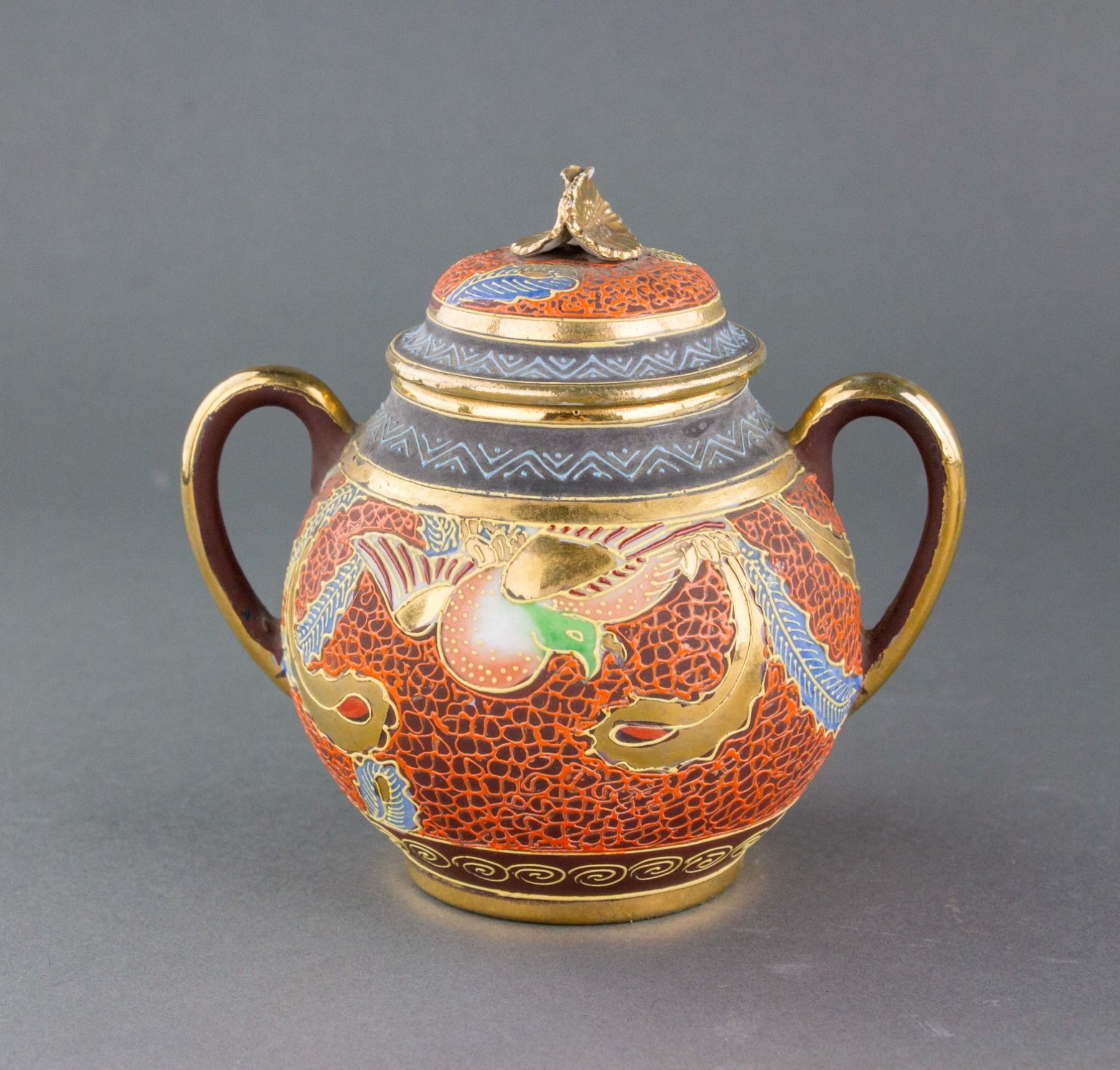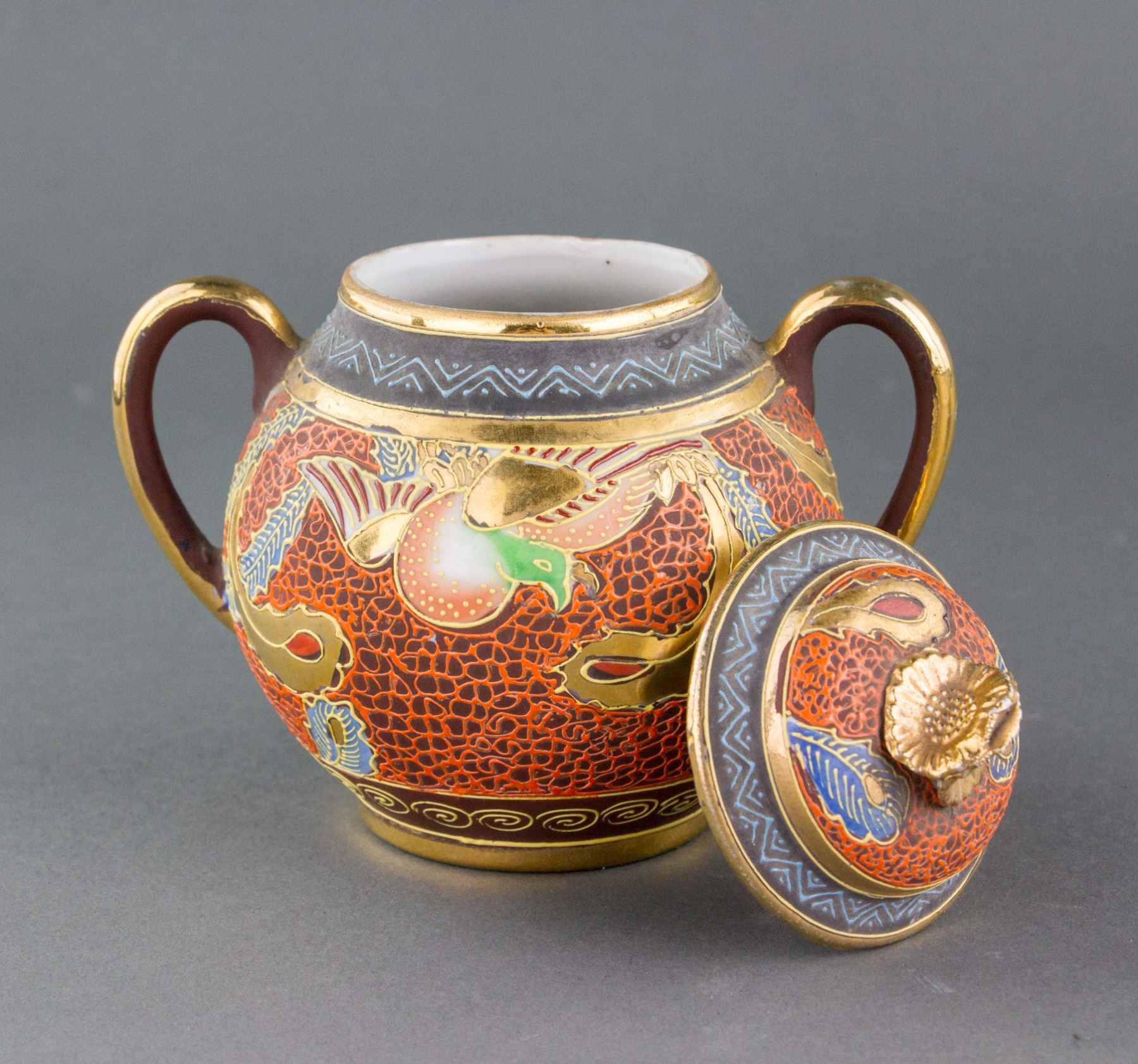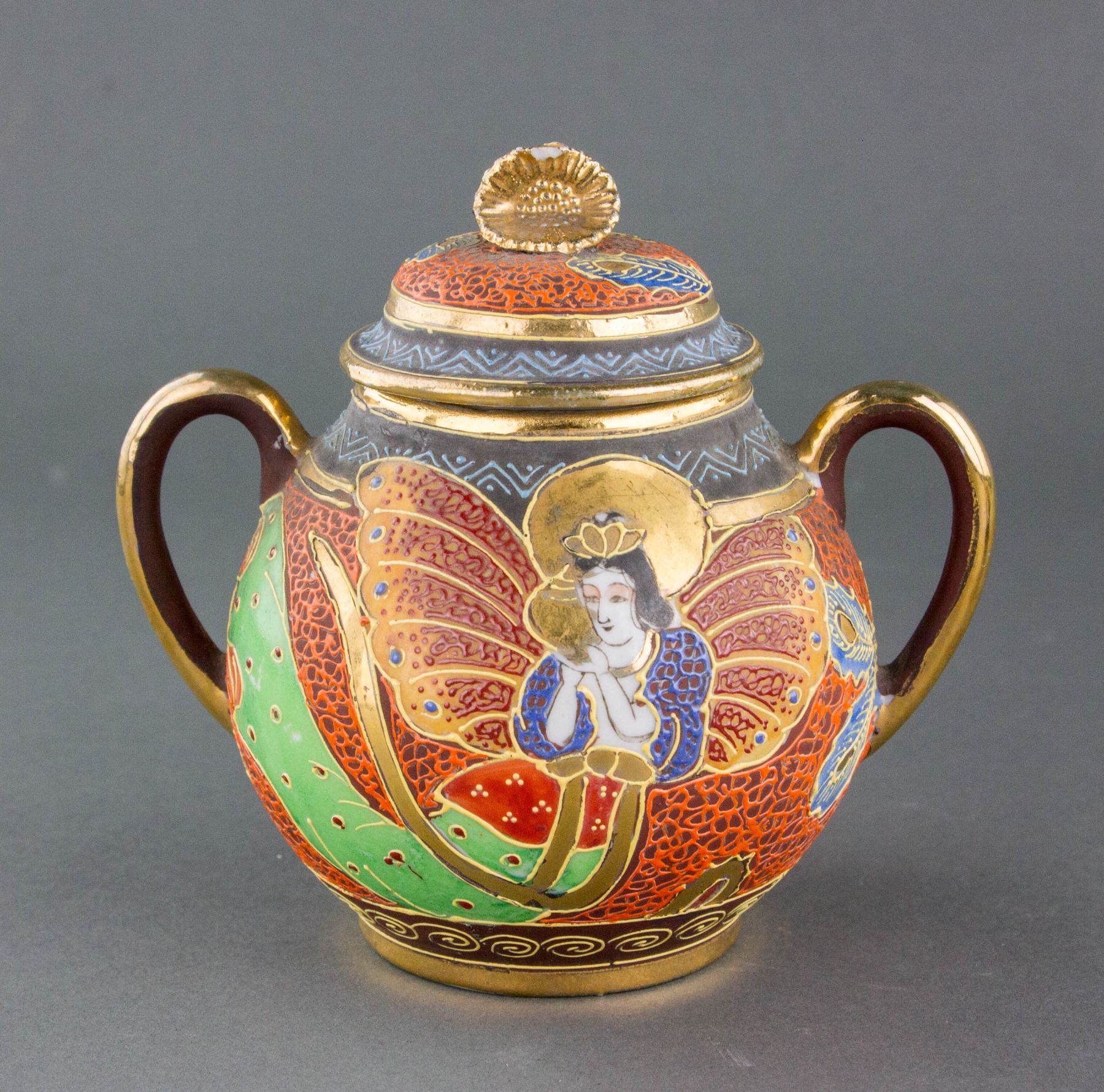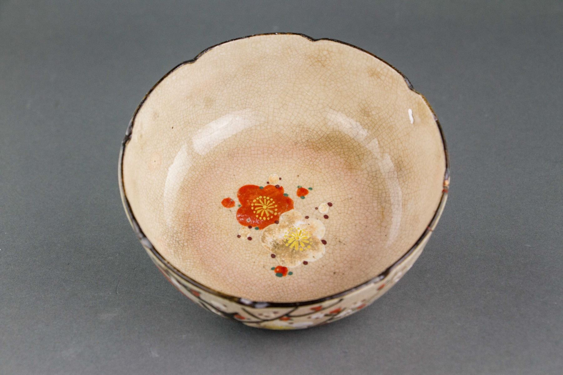Two (2) pieces of Japanese gilt porcelain items; jar of globular body; flanked with two curved handles; with flower pedal form knobbed cover; painted with birds and flowers; maker's mark on base; bowl of foliated edge, tapering to bottom; supported on short foot rim; painted with sakura; 14 cm x 11 cm/12 cm x 5 cm, 240 grams/225 grams