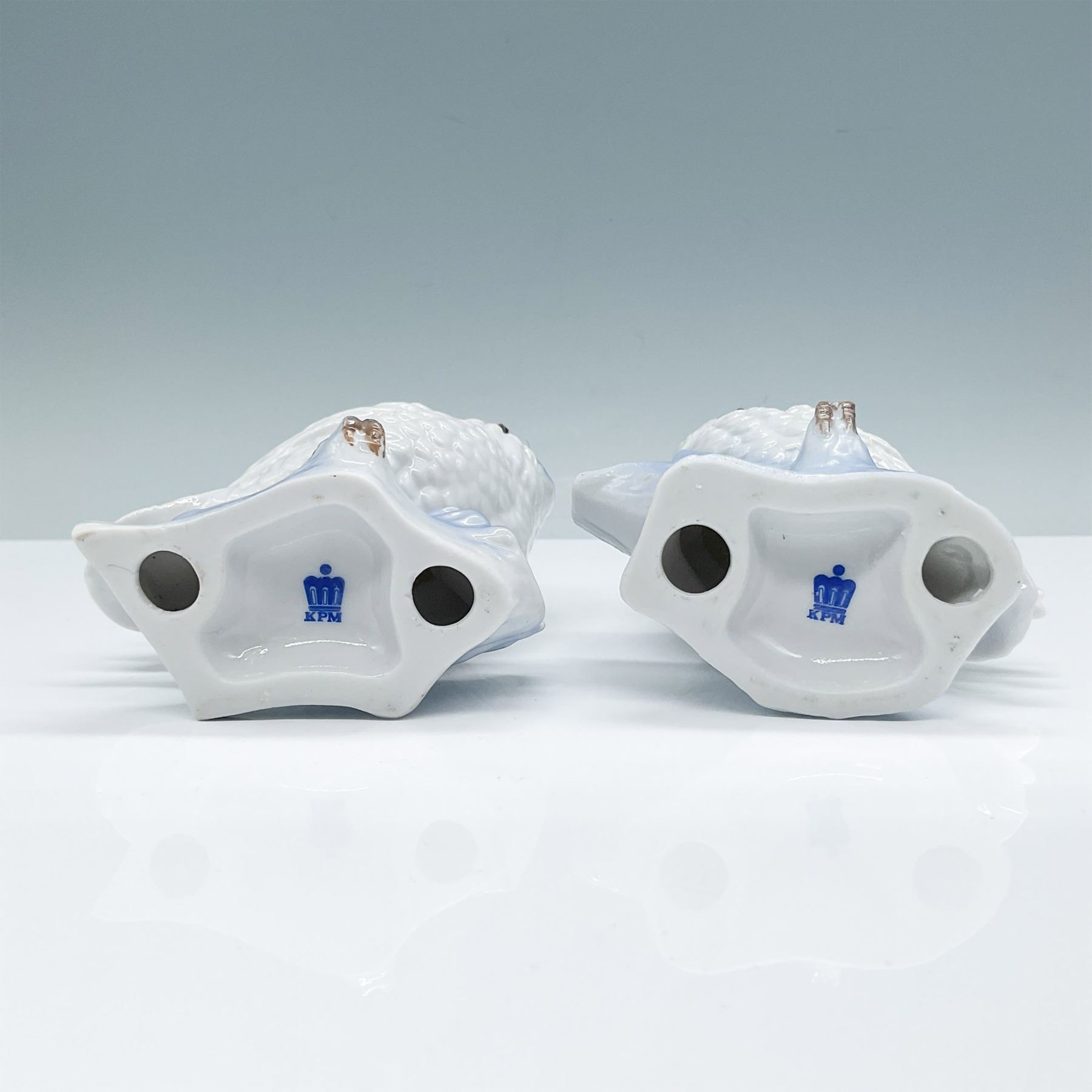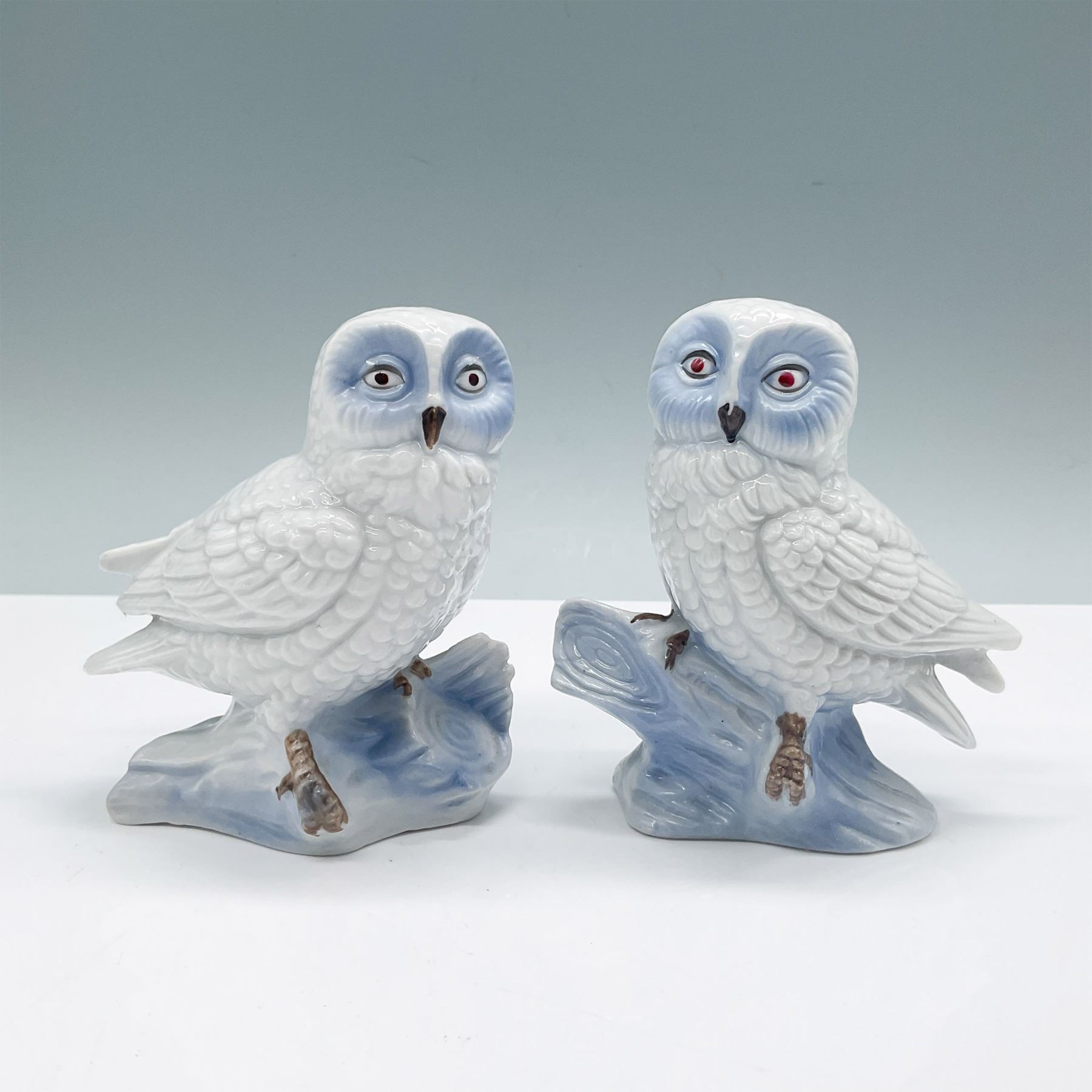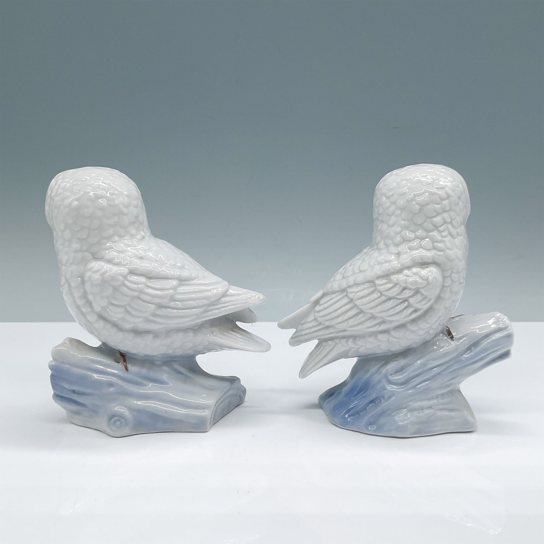 A pair of Japanese KPM figurines featuring snowy owls perched on tree stumps, crafted in porcelain with detailed hand-painted accents in white, blue, and brown. These figurines bear the KPM crown mark. Each measures 4"H, offering a charming decorative appeal for collectors or enthusiasts of whimsical porcelain items.