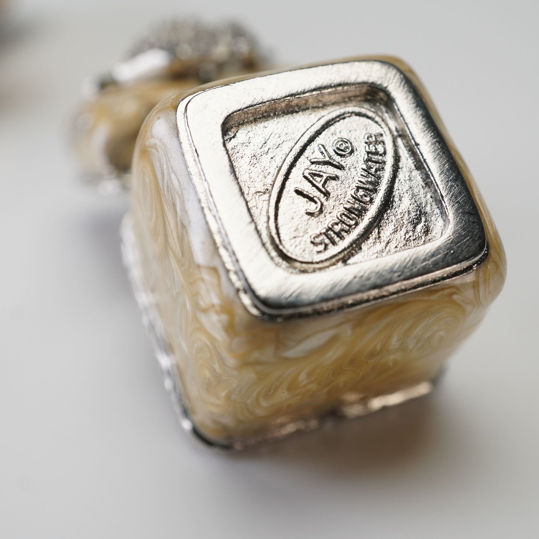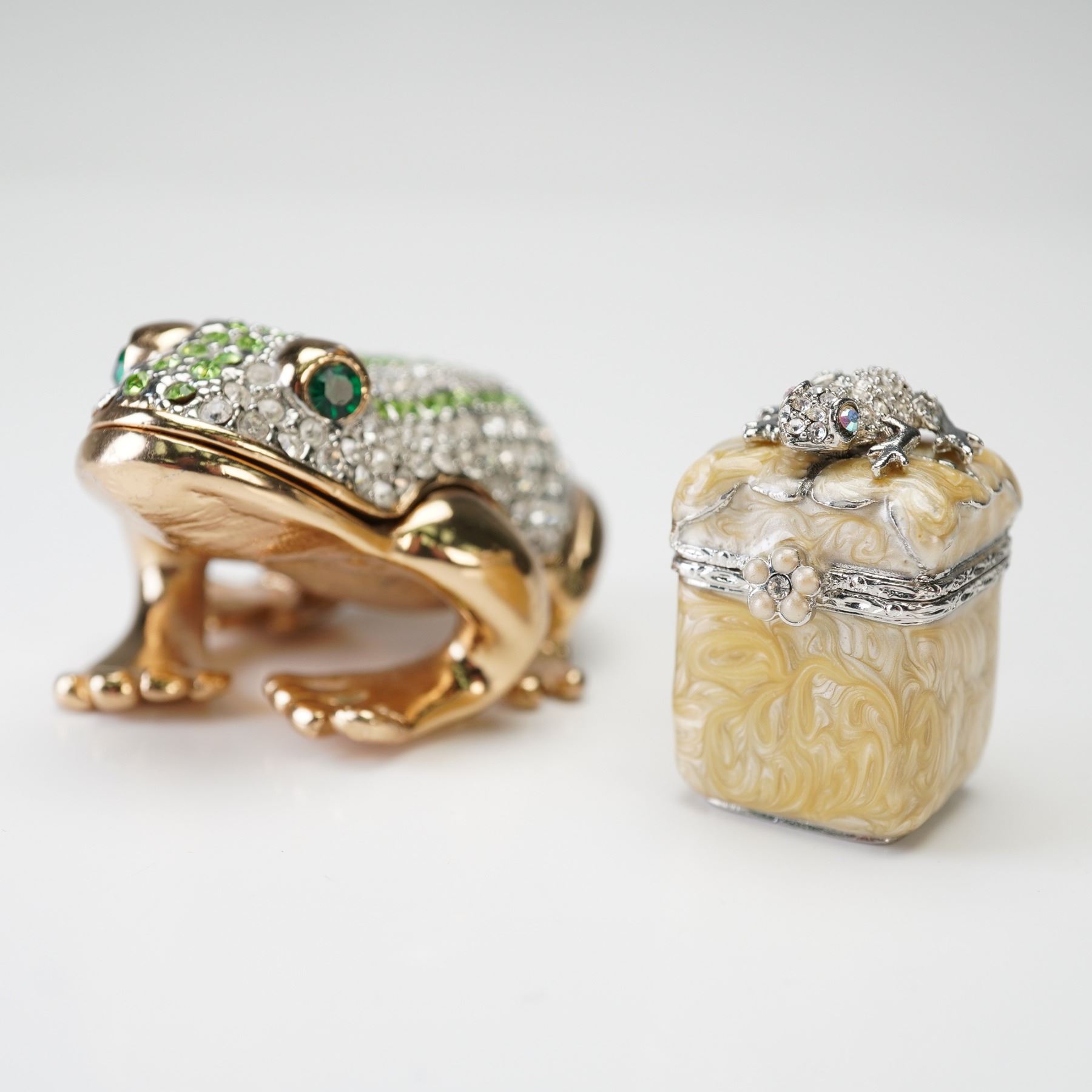 Comprising of one square miniature cream-colored enameled box with silver-tone mounts, floral detailing, and a jeweled frog finial, marked underside "Jay Strongwater." A gold-tone and green jeweled frog-form enameled keepsake box with crystal accents and hinged opening, unmarked.