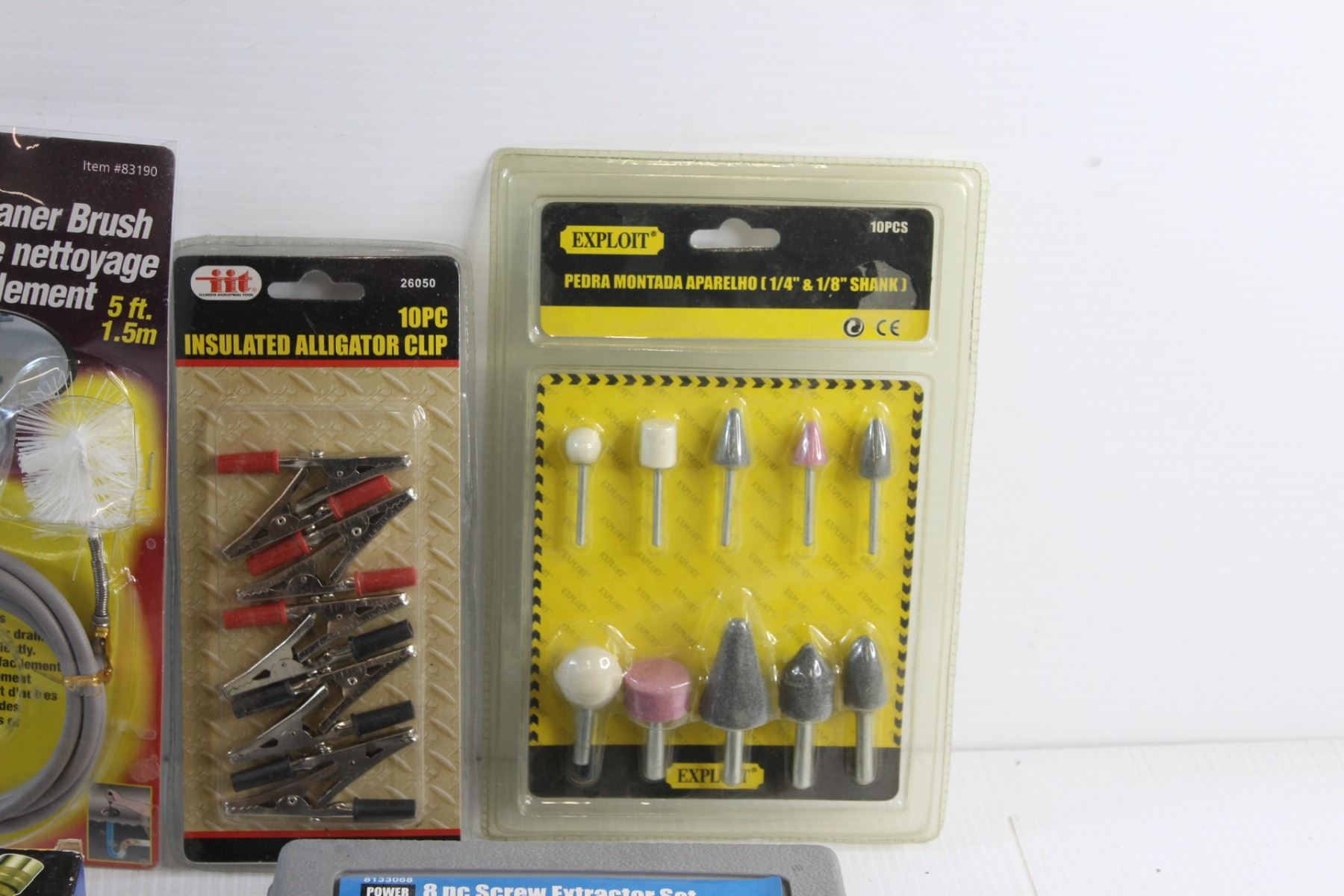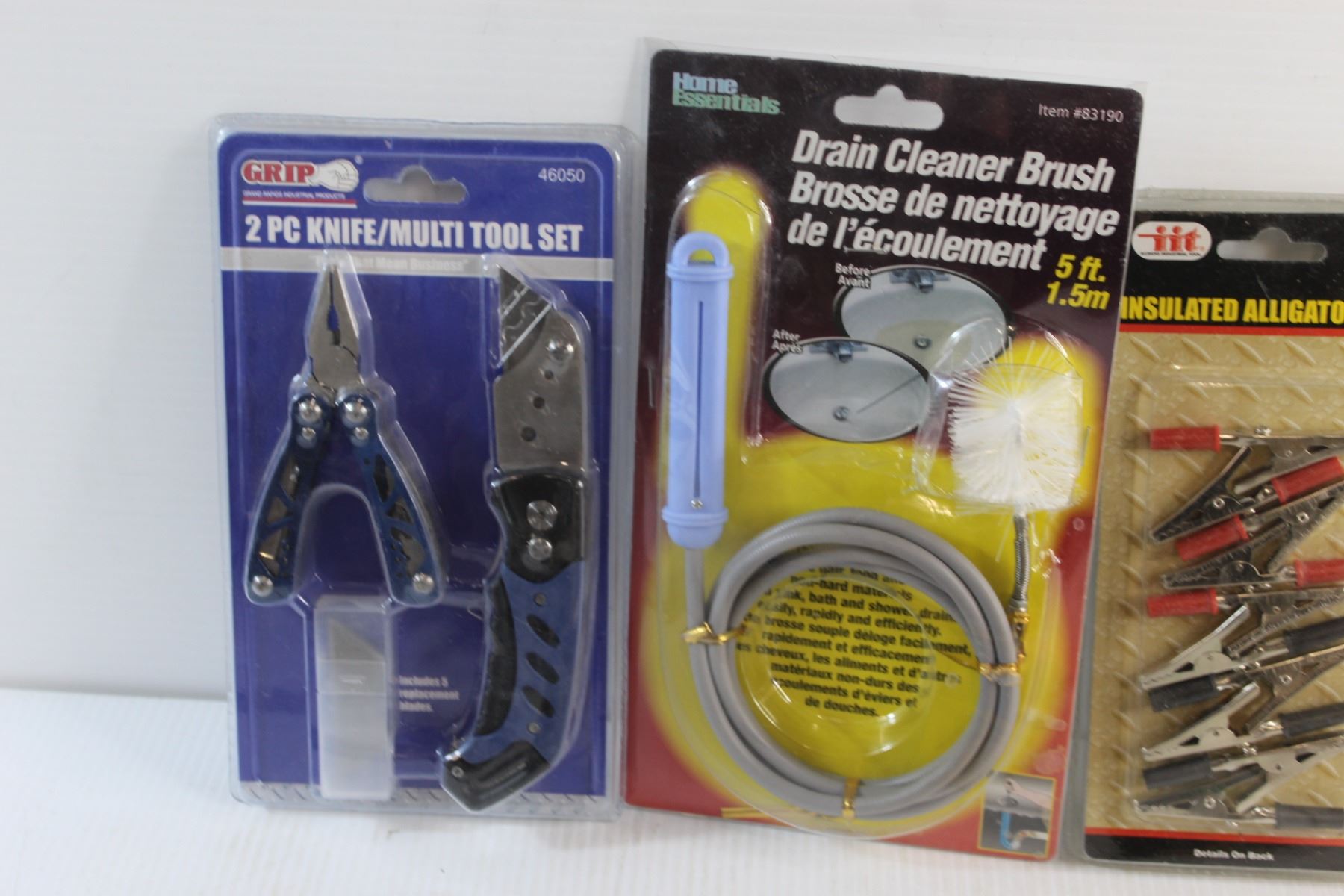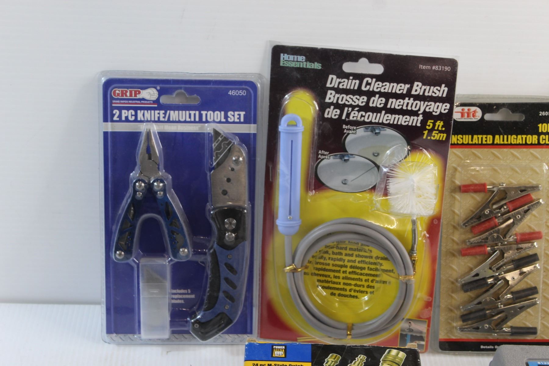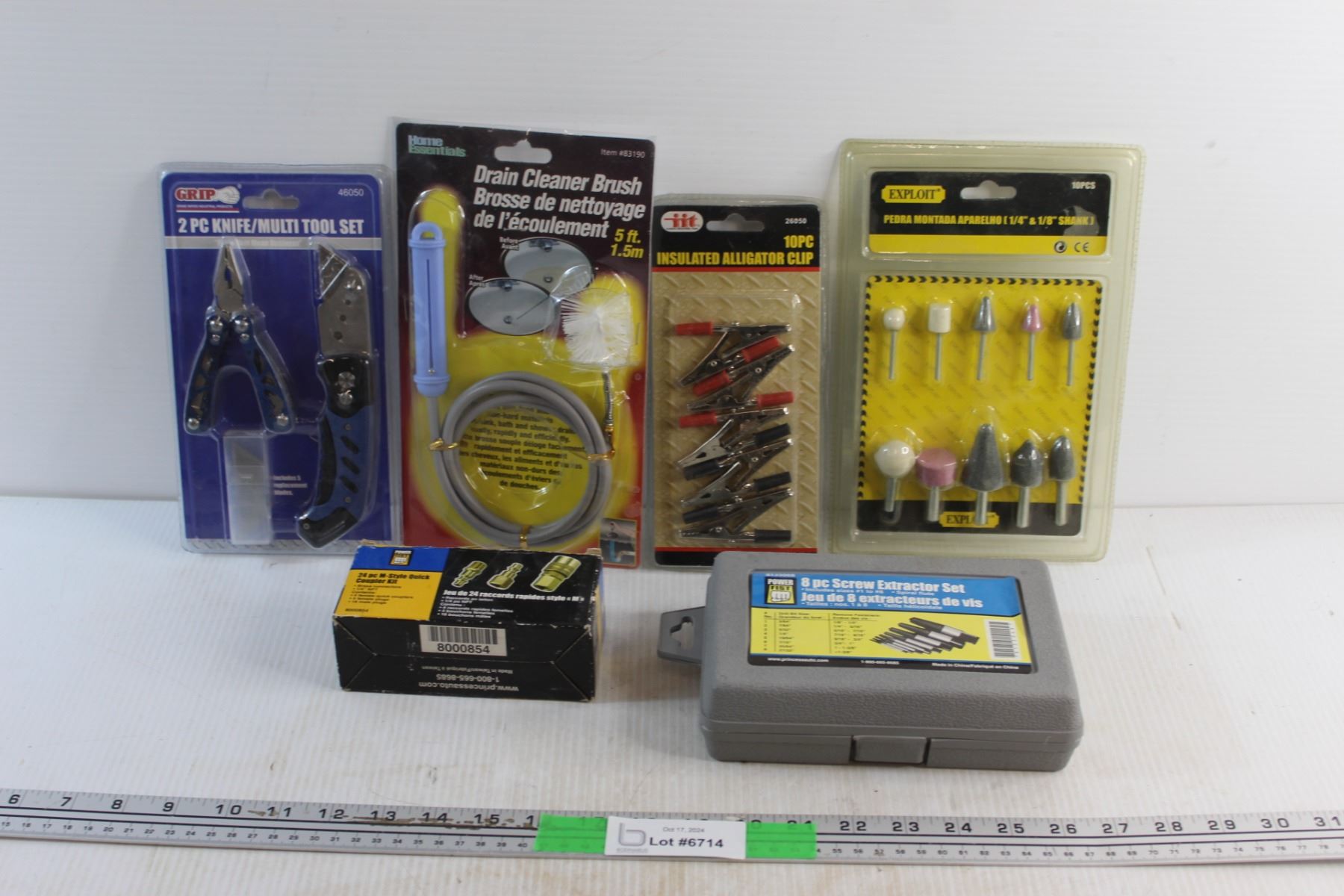 2pc Knife/Multi Tool Set, Drain Cleaner Brush. 8pc Screw Extractor Set, 24 pc M Style Quick Coupler Kit and Assorted Items
