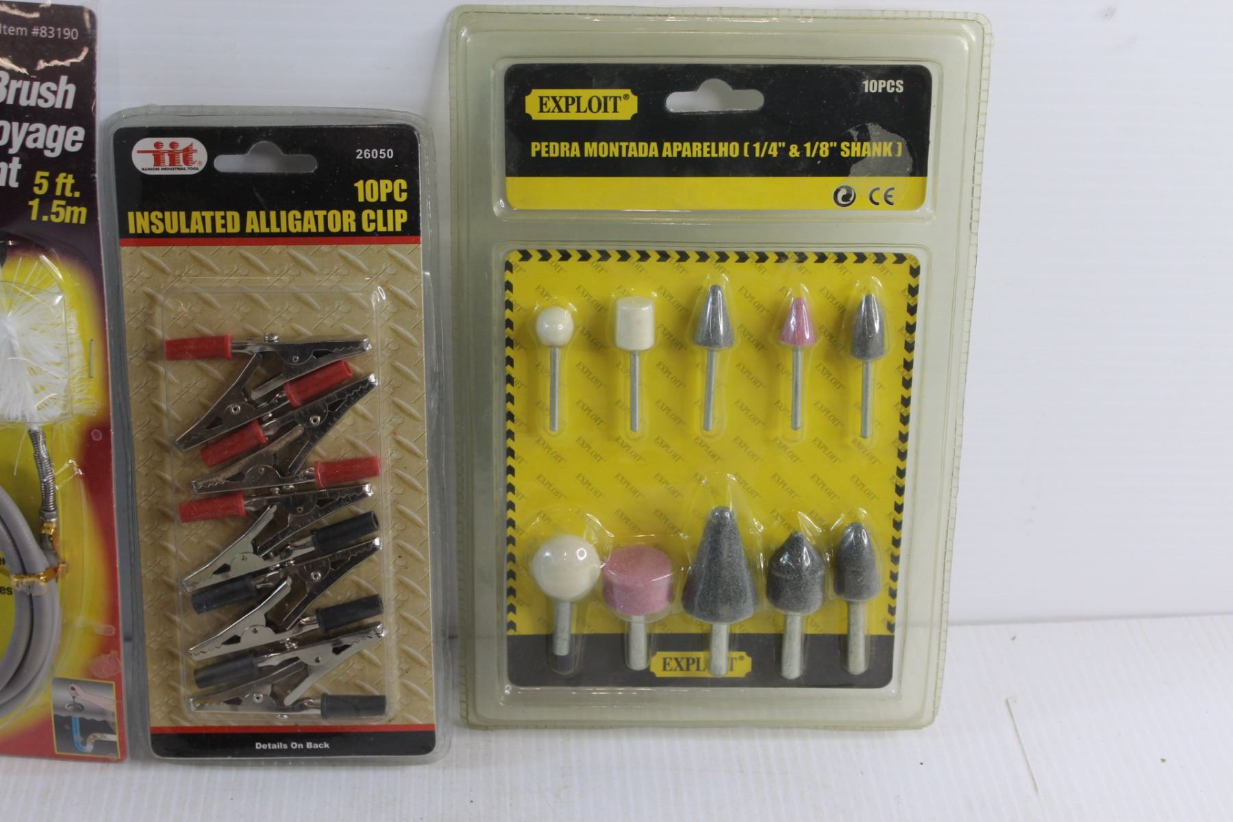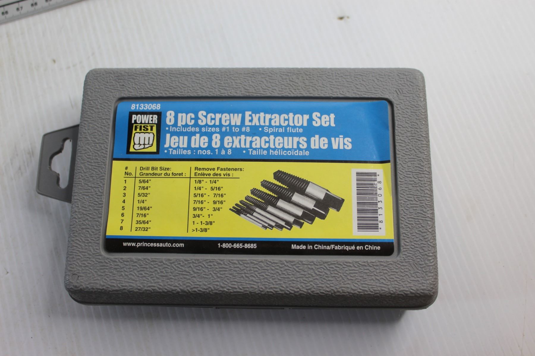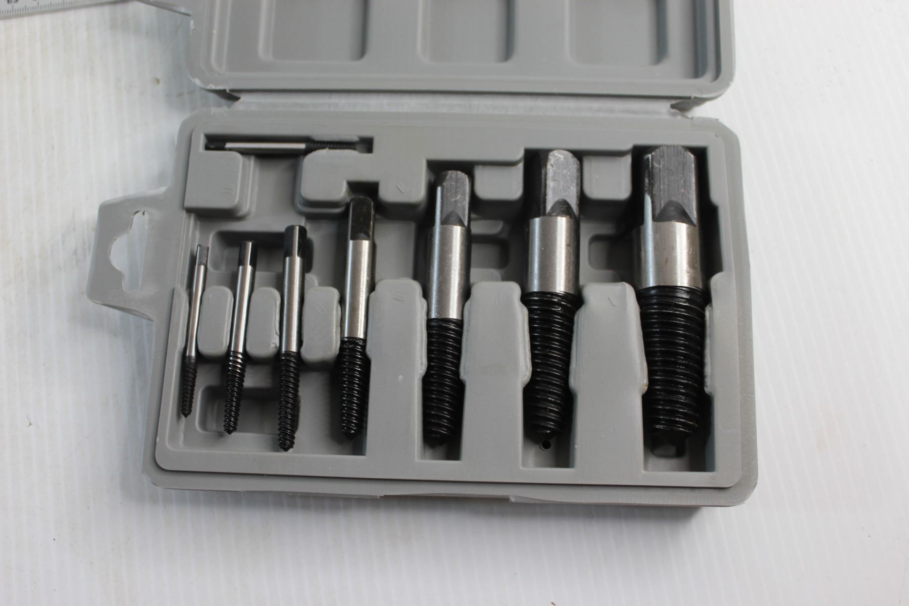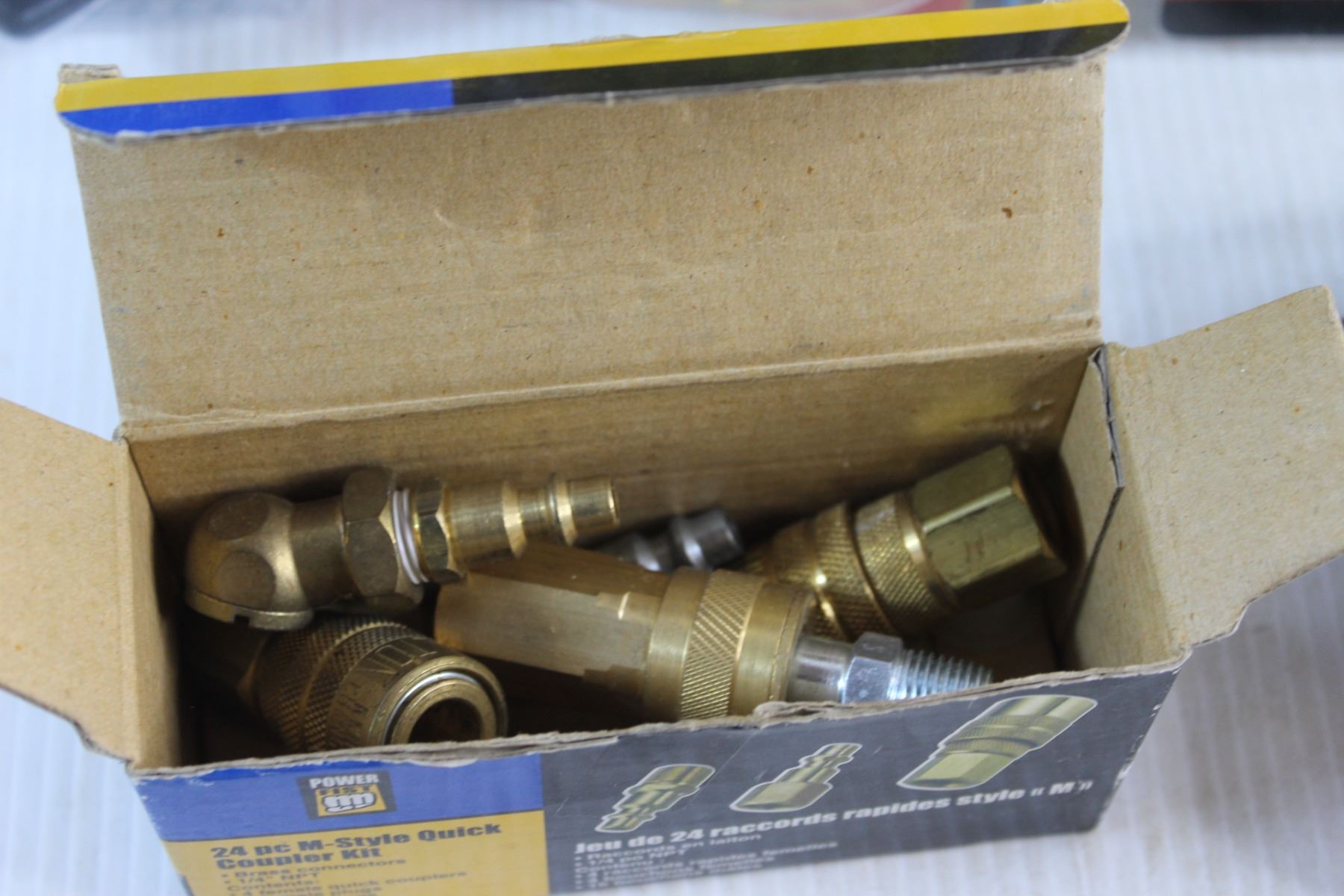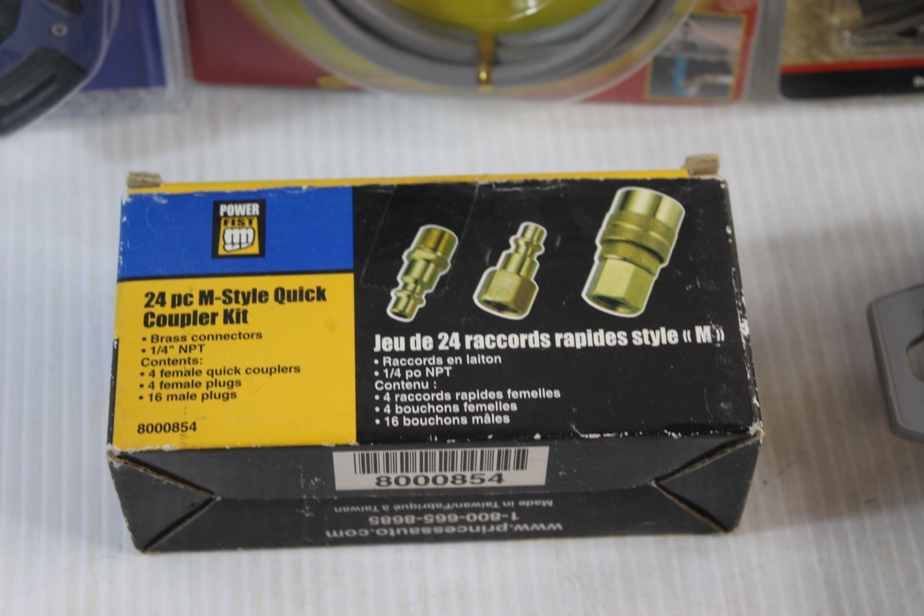 2pc Knife/Multi Tool Set, Drain Cleaner Brush. 8pc Screw Extractor Set, 24 pc M Style Quick Coupler Kit and Assorted Items