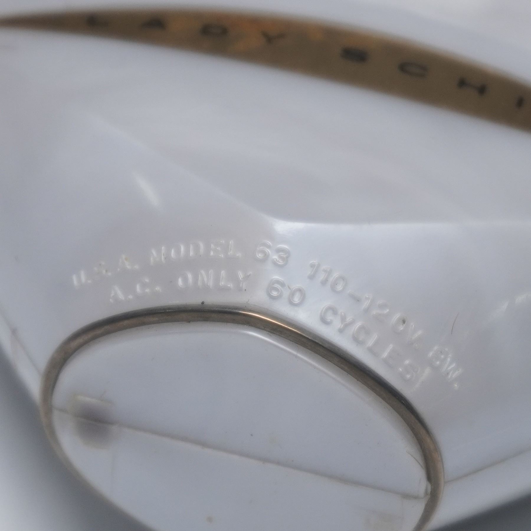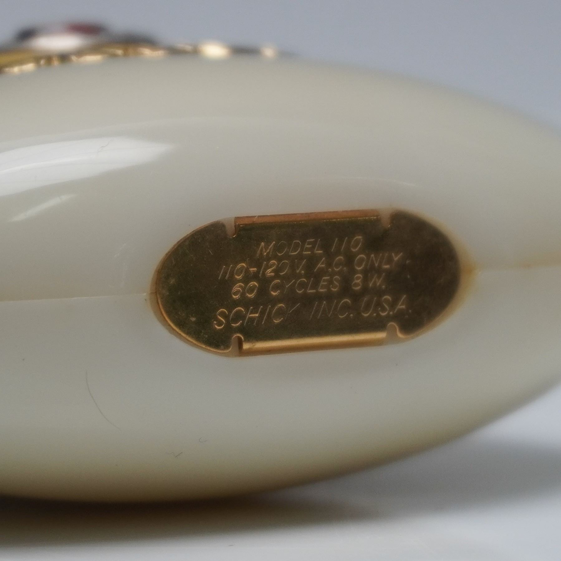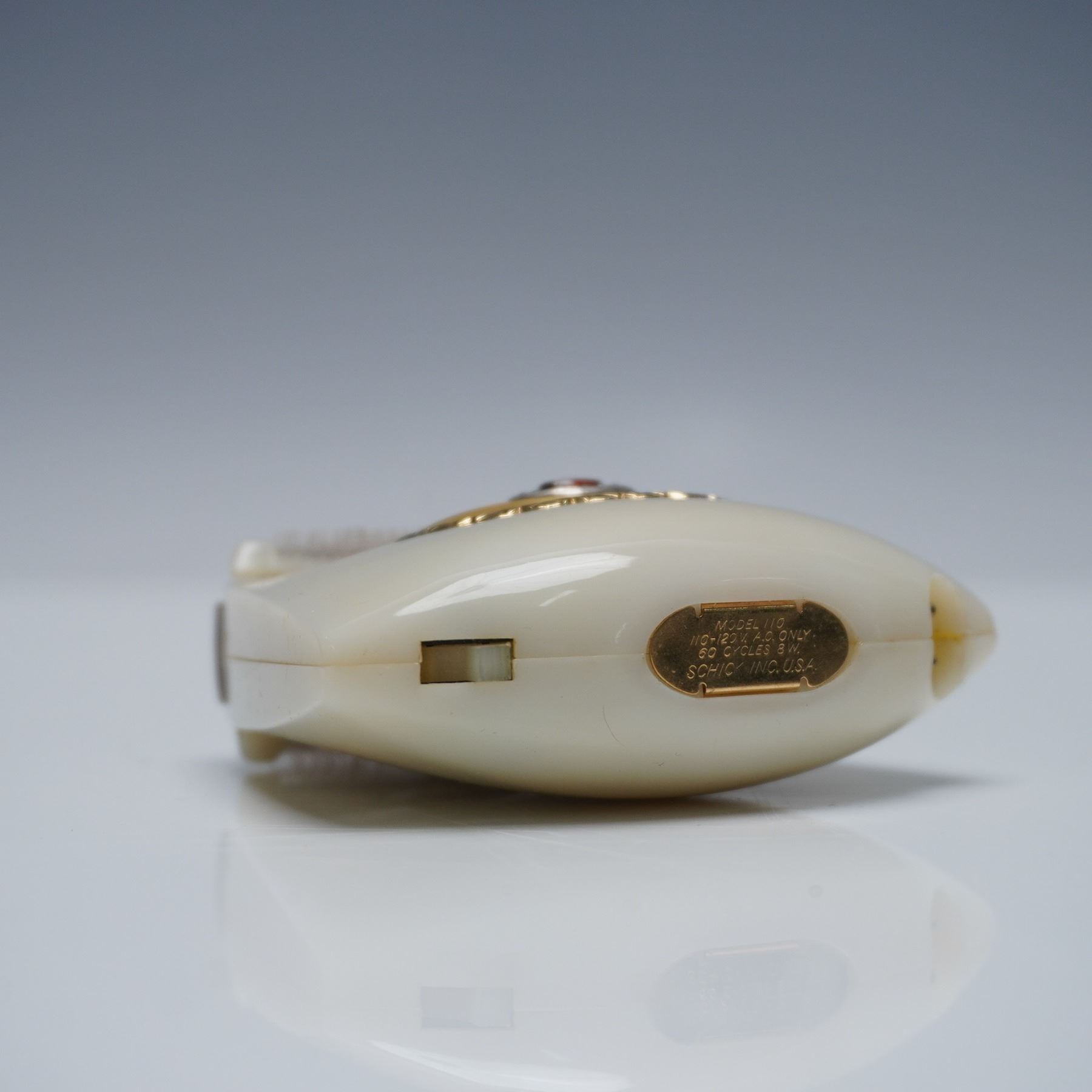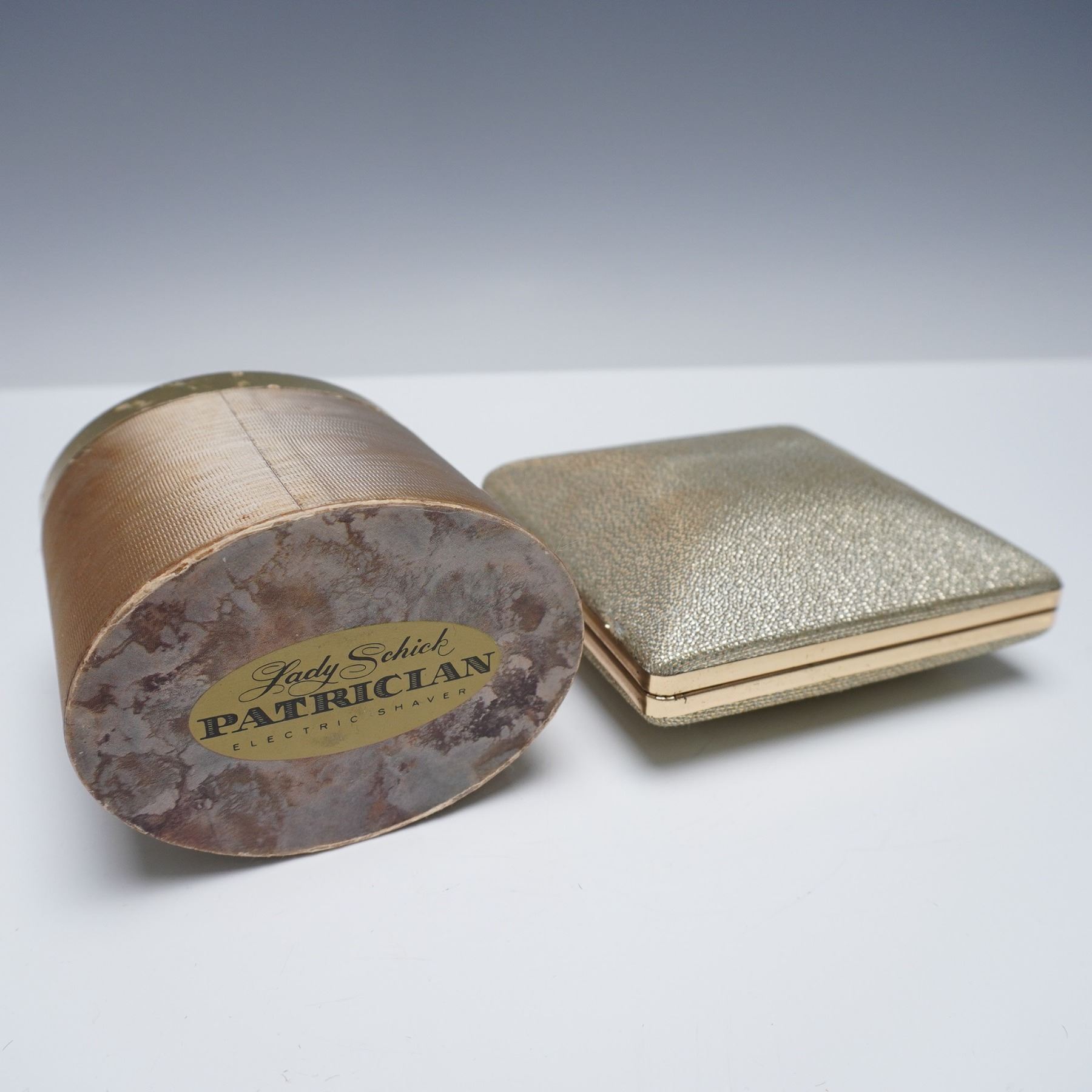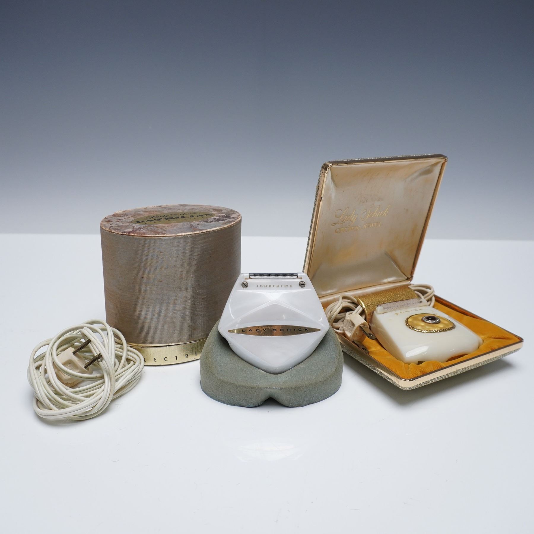 This lot features two vintage Lady Schick electric shavers, including the Patrician and Crown Jewel models. The Lady Schick Patrician shaver, model 63, operates on 110-120V A.C. only at 60 cycles, with 8W power. It includes its original gold-toned cylindrical case. The second item, the Lady Schick Crown Jewel, model 110, shaver features an ornate circular gold-tone accent on its body. It also runs on 110-120V A.C. only at 60 cycles and 8W, and comes housed in its original clamshell-style textured gold case. Both pieces are marked 'Schick Inc., U.S.A.' and include their original cords. Patrician box: 4"L x 3"W x 4"H. Crown Jewel box: 4.75"L x 4.75"W x 1.75"H.