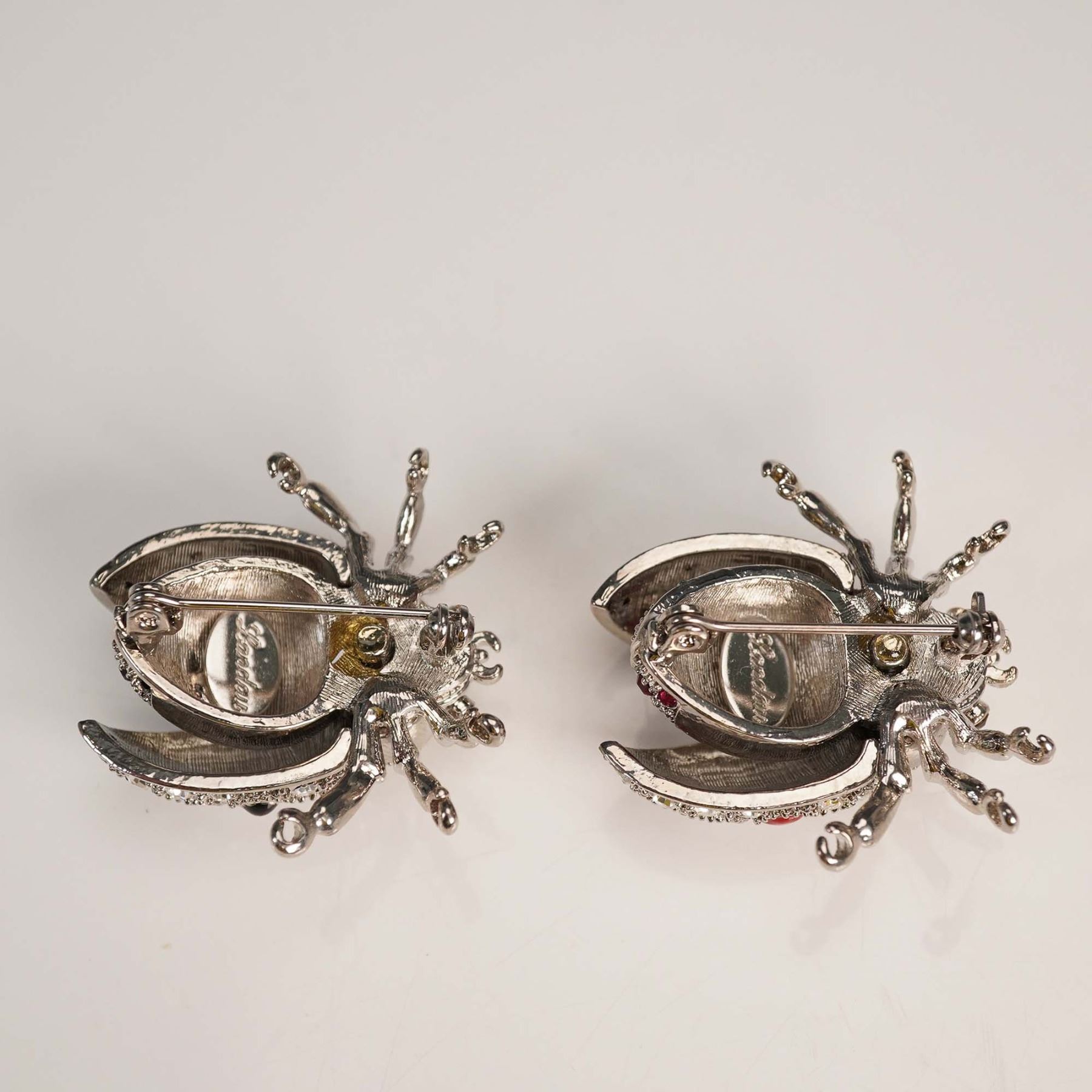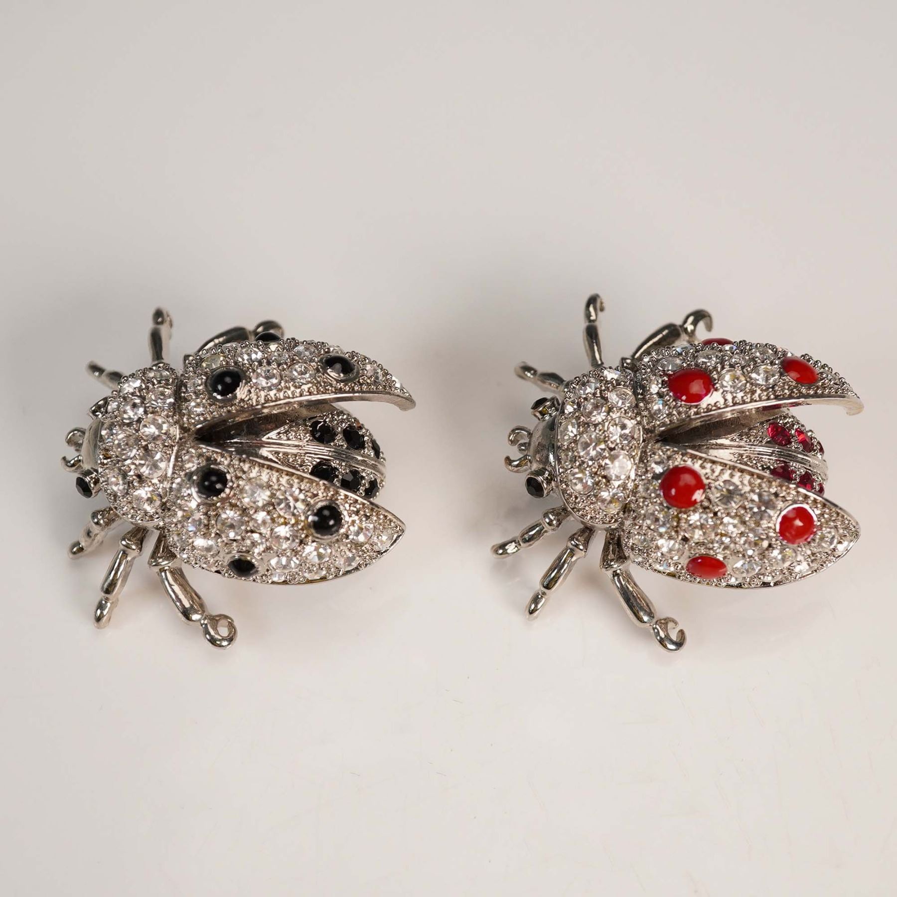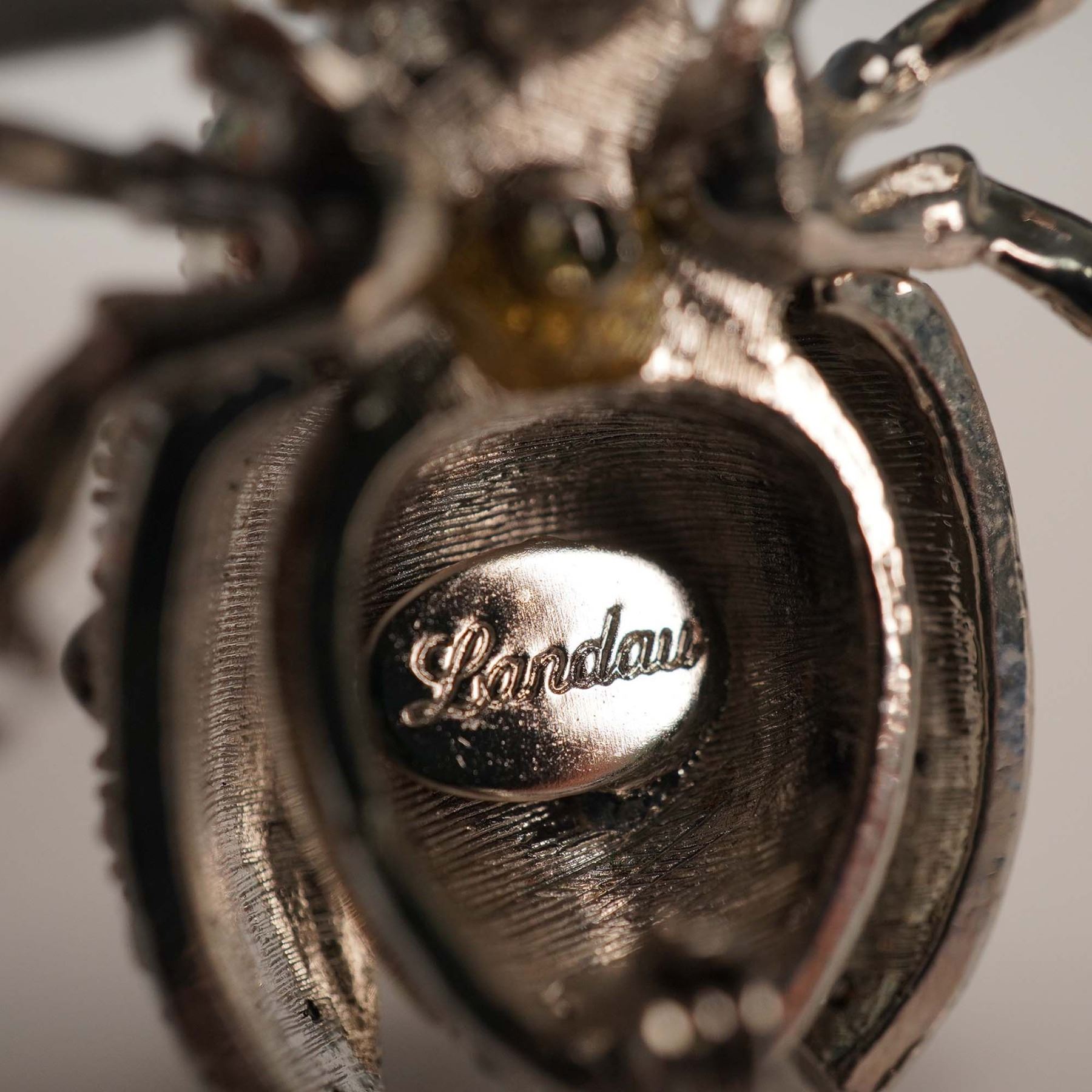 Pair of detailed ladybug brooches by Landau, each featuring hinged wings set with sparkling clear rhinestones and colored enamel spots-one in black and one in red. Crafted in silver-tone metal with sculptural legs and bodies, each brooch is signed Landau on the reverse and measures approximately 1.25"L. The articulated wing design adds dynamic charm to these collectible figural pins.