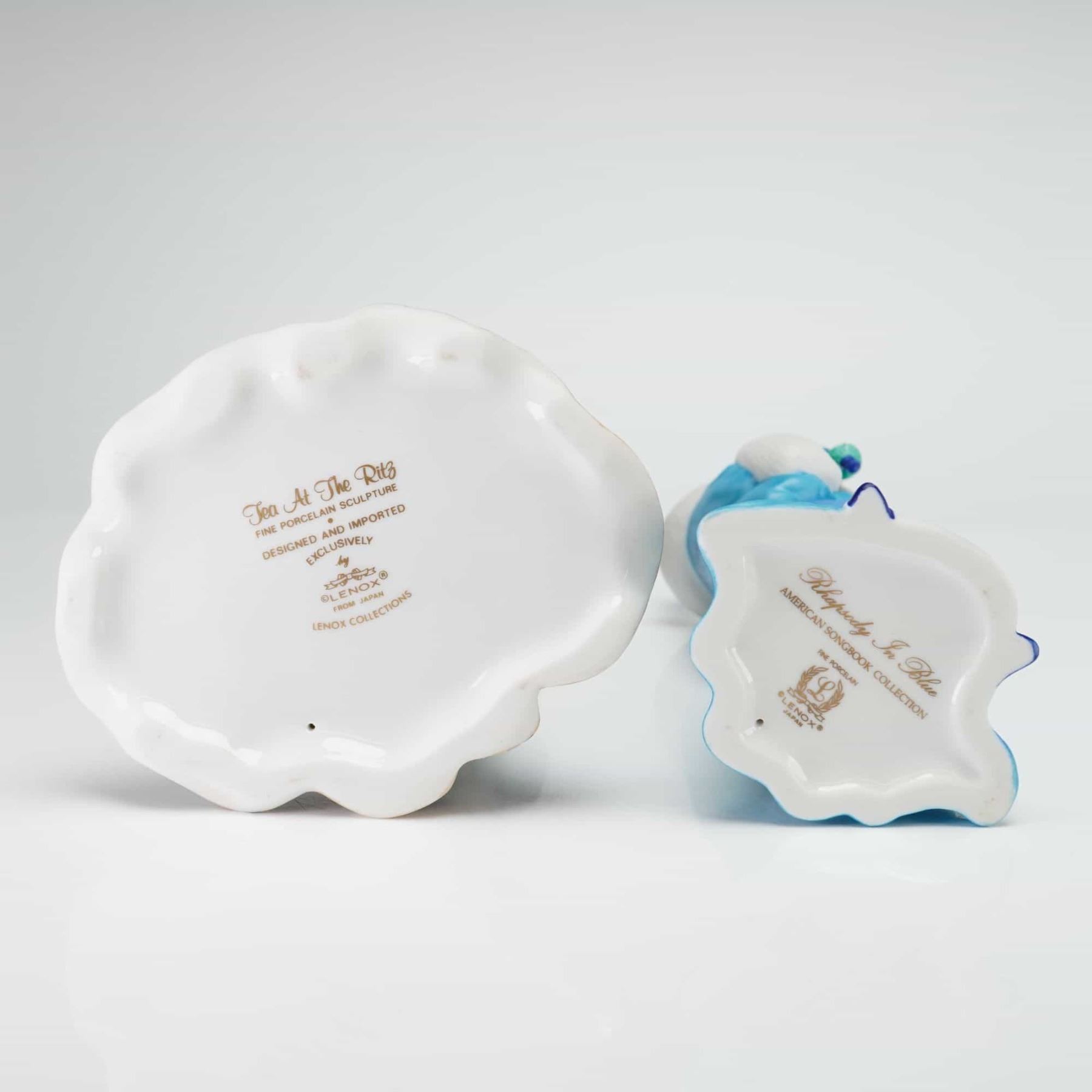 This lot features two hand-painted fine porcelain figurines produced for Lenox and manufactured in Japan. The first figurine, titled Tea At The Ritz, depicts a woman in Edwardian-style attire. She wears a cream-colored gown decorated with black and grey stylized organic motifs and red accents at the hem, paired with a dark fur-trimmed collar, matching muff, and a wide-brimmed hat accented with a feather and flower. The base is marked with Tea At The Ritz, Fine Porcelain Sculpture, and Lenox Collections. The second figurine, titled Rhapsody In Blue, is from the American Songbook Collection and depicts a woman in 1920s Art Deco-style dress. She is dressed in a layered blue gown with floral embroidery on the back panel, a white fur wrap, and a blue turban-style hat. The base is marked with Rhapsody In Blue, American Songbook Collection, Fine Porcelain, and Lenox Japan.