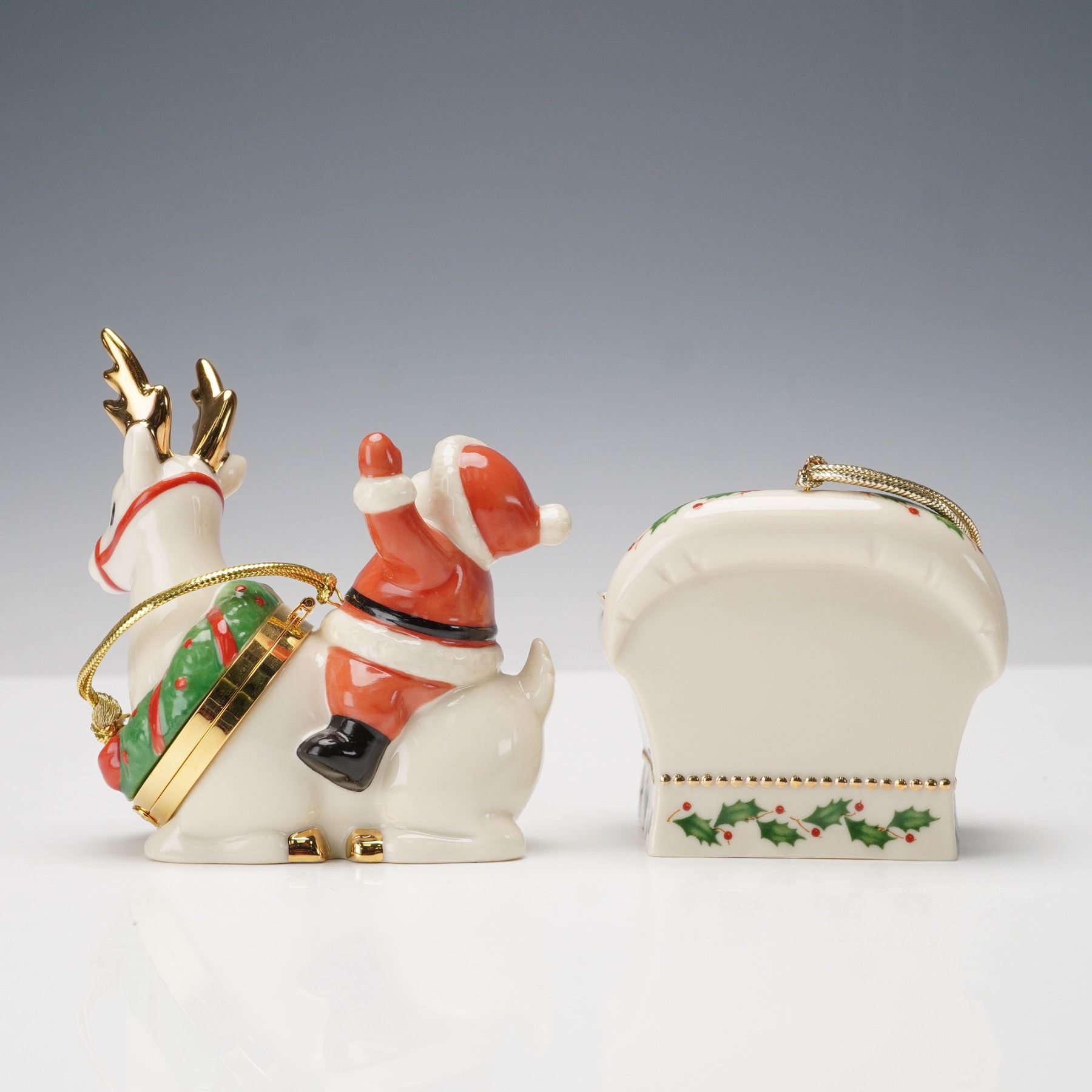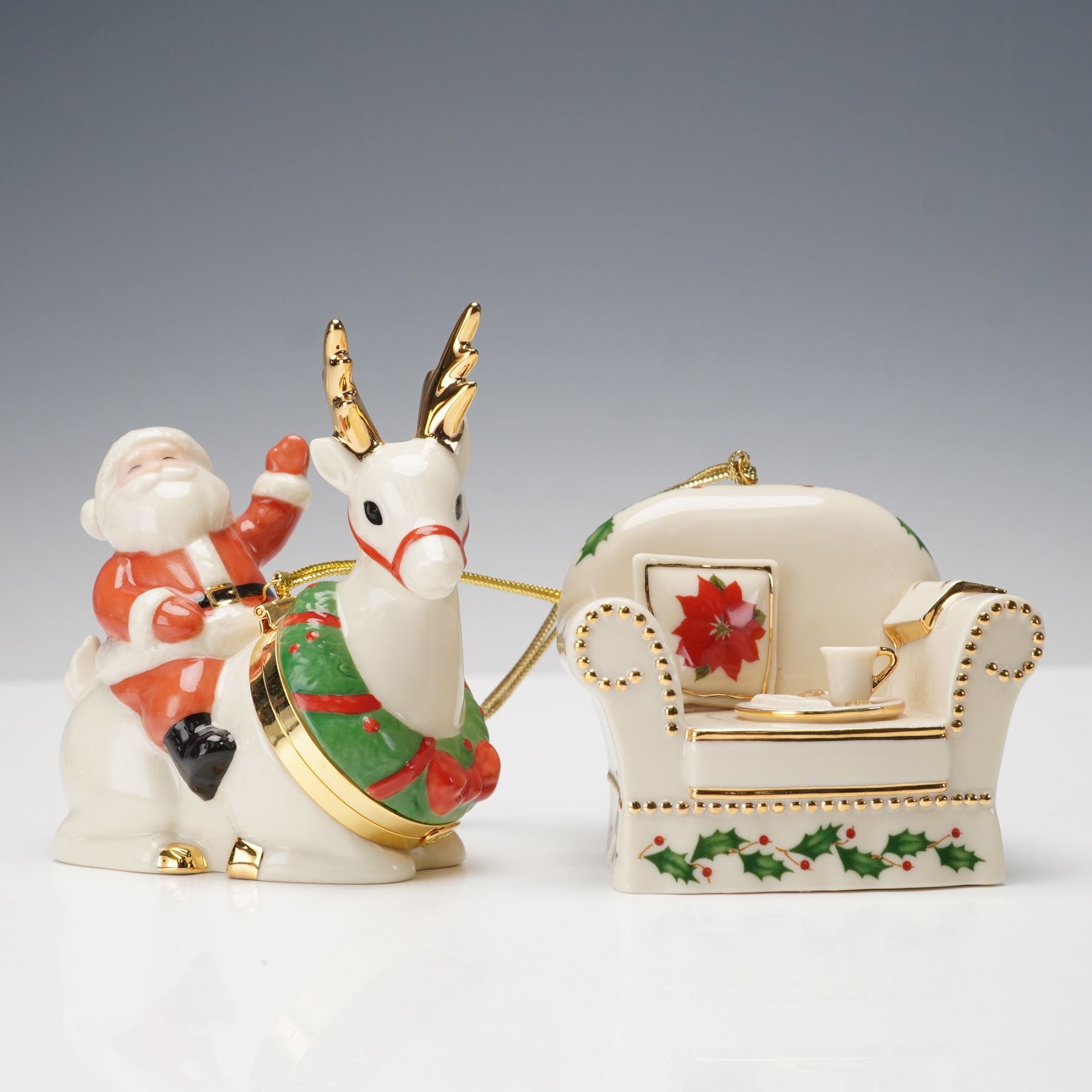 2pc Lenox Porcelain Ornaments. Santa and Reindeer Hinged Box, Chair
