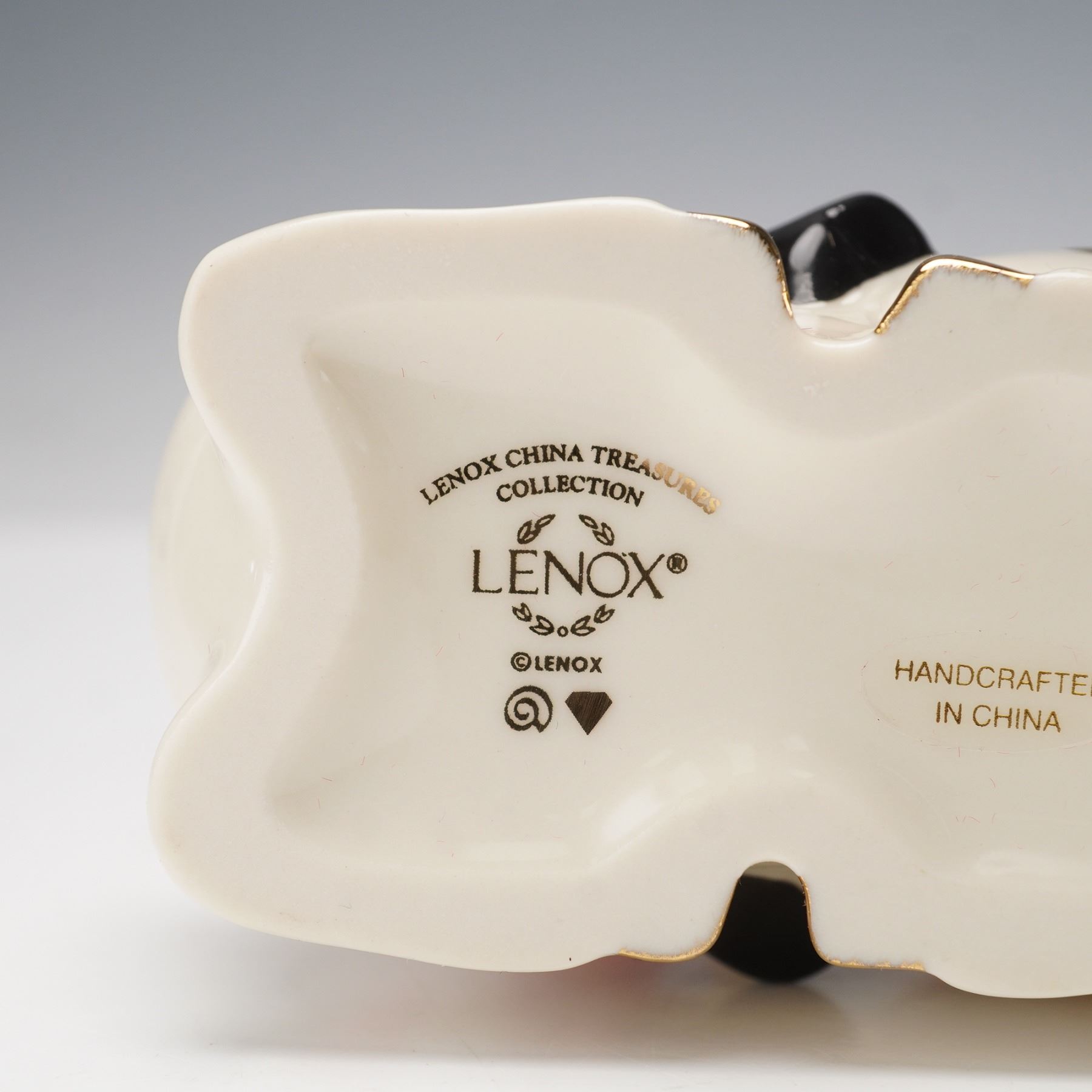 Pair of Porcelain Christmas figurine ornaments by Lenox, featuring Santa Claus riding a white reindeer with gold accents and an armchair decorated with holly and poinsettia motifs. Lenox backstamp.