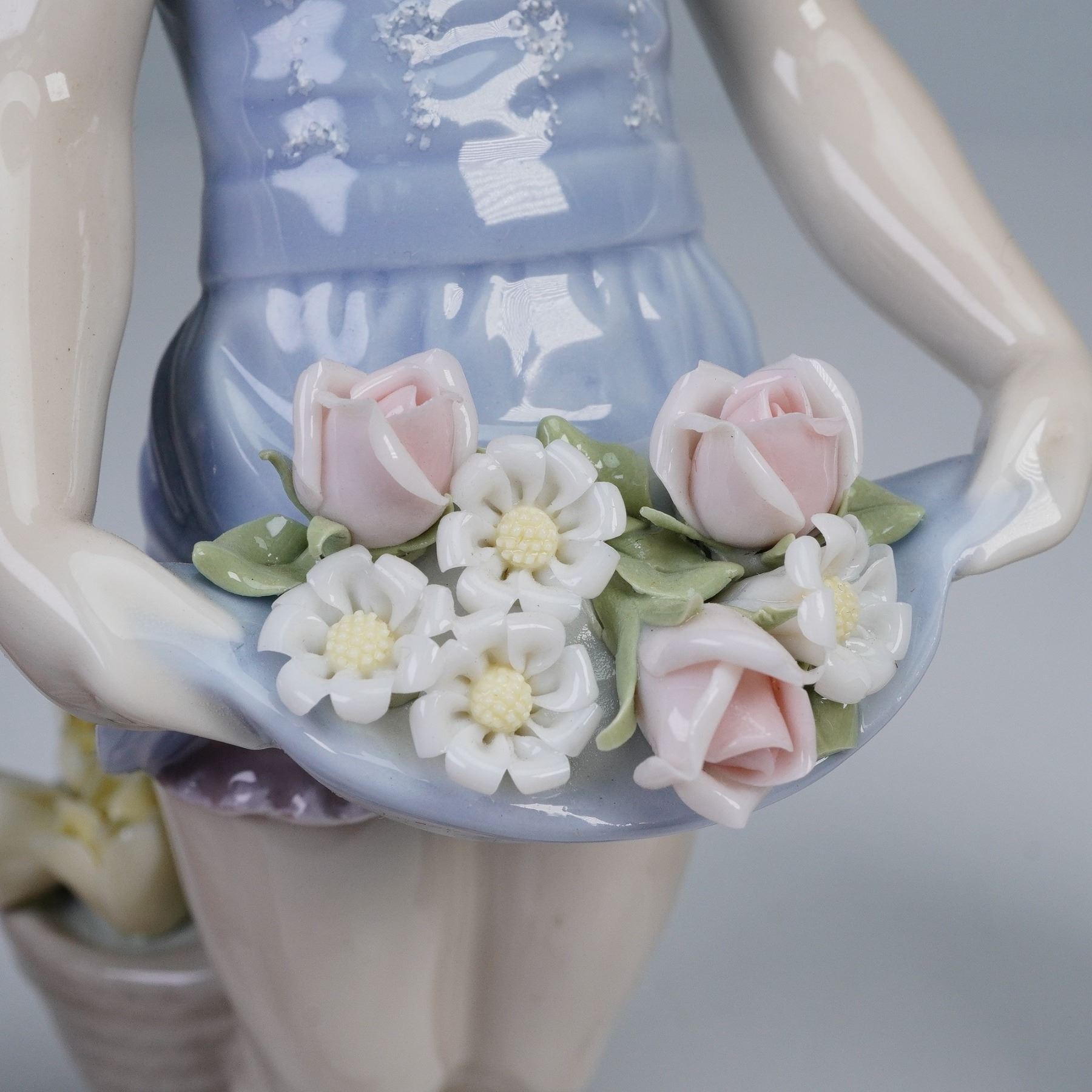 A charming pair of hand-crafted Lladro porcelain figurines, both with original boxes. The first, titled Girl with Candle (#01014868), depicts a serene young girl in a simple gown holding a candlestick with a softly glowing flame, executed in Lladro's signature matte finish. The second, My Flowers (#01001284), portrays a sweet young girl in a sunhat and pastel dress, carefully holding a skirt filled with delicate flowers, with a basket of tulips at her feet. Both pieces feature finely modeled details and the delicate pastel palette that has made Lladro world-renowned. Each figurine is marked with the Lladro stamp on the underside, ensuring authenticity. Both retain their original blue Lladro boxes, showing storage wear, while the figurines themselves remain in very good condition with no visible chips or repairs noted. This item has its original box. Larger box measures 12.25"L x 7.5"W x 5.75"H.