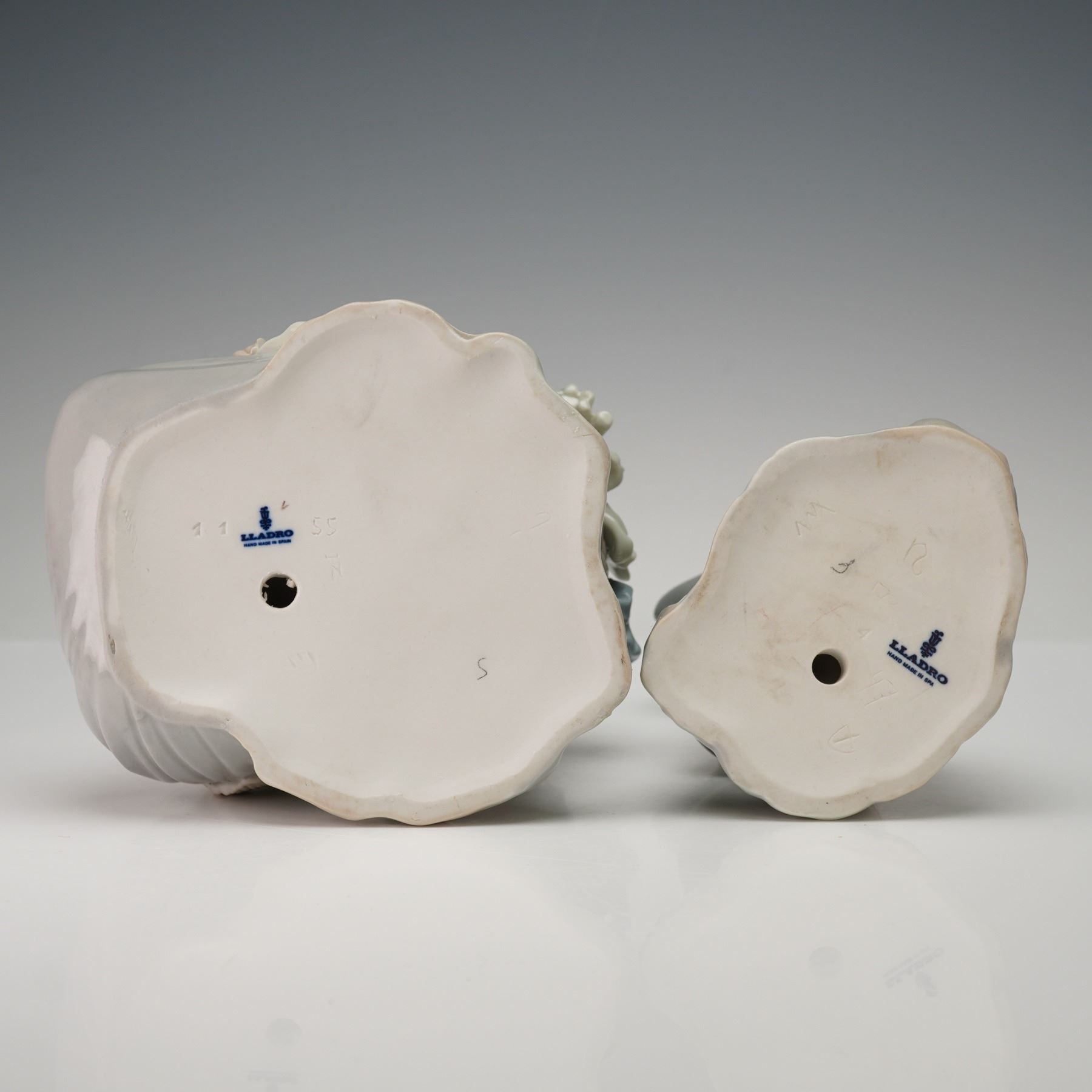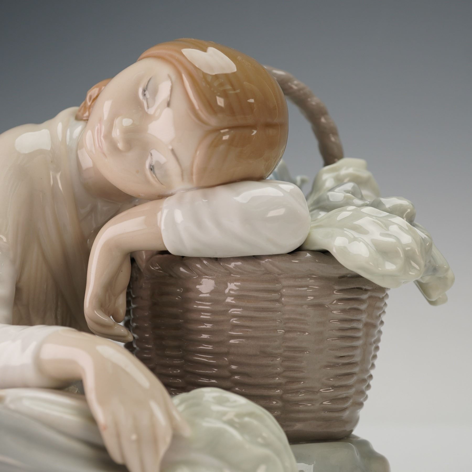 A pair of finely detailed porcelain figurines, each showcasing the brand's signature soft pastel palette and serene expression. One figure portrays a young girl resting peacefully beside a woven basket filled with freshly washed linens, her head gently leaning on her arm in quiet repose. The second depicts a farm girl standing confidently beside a wooden pail, gazing down at a curious goose at her feet, her posture conveying both grace and rural charm. Both pieces bear the classic Lladro hallmark and impressed model numbers beneath the base: Green Grocer 01001087 and Girl with Milk Pail 01004682.