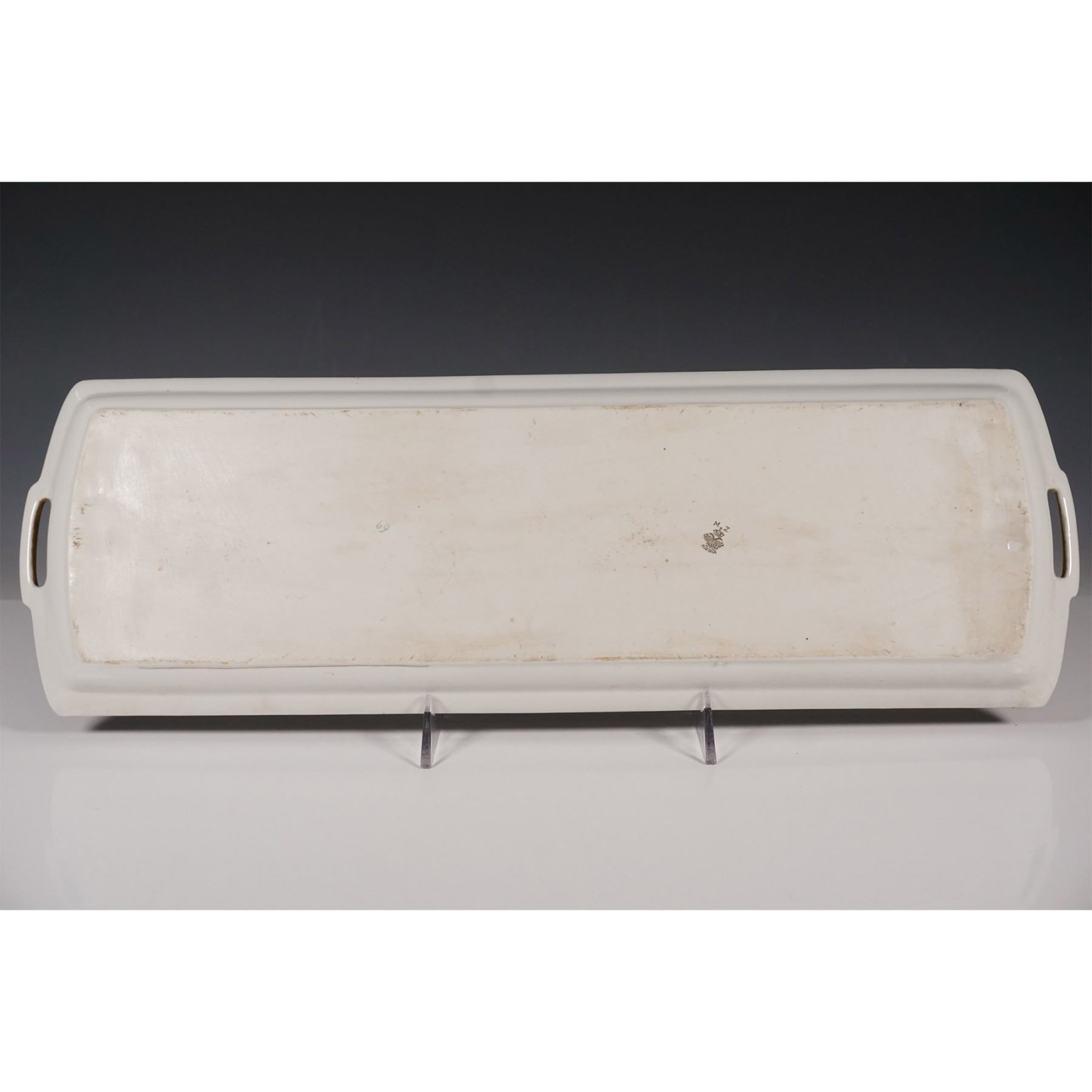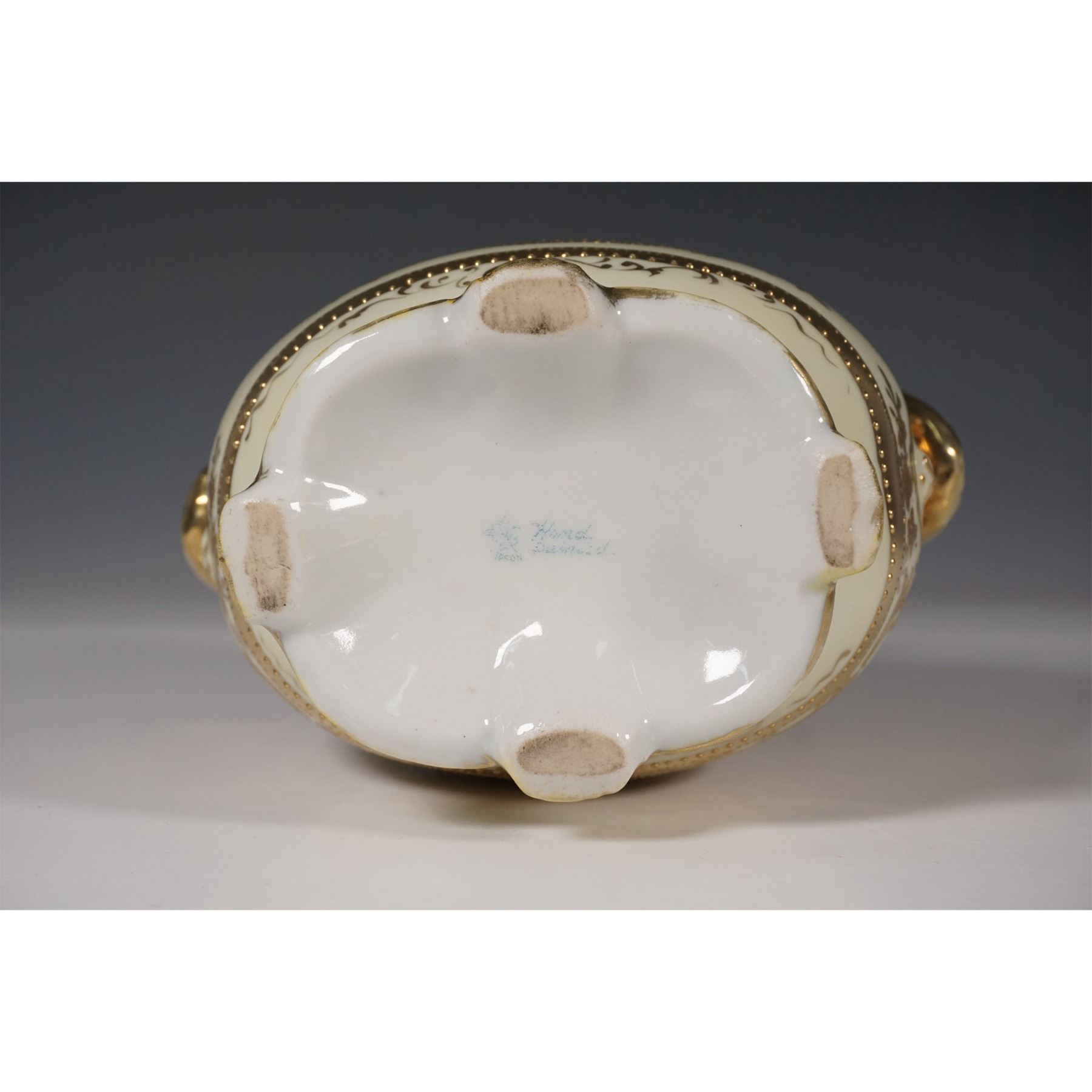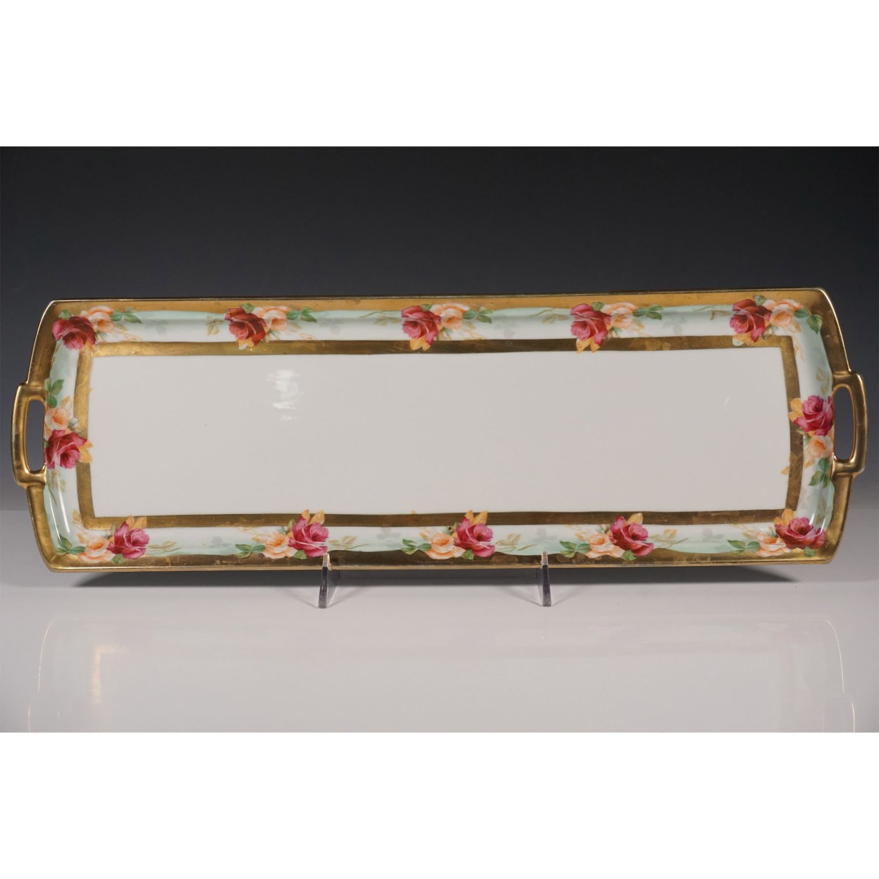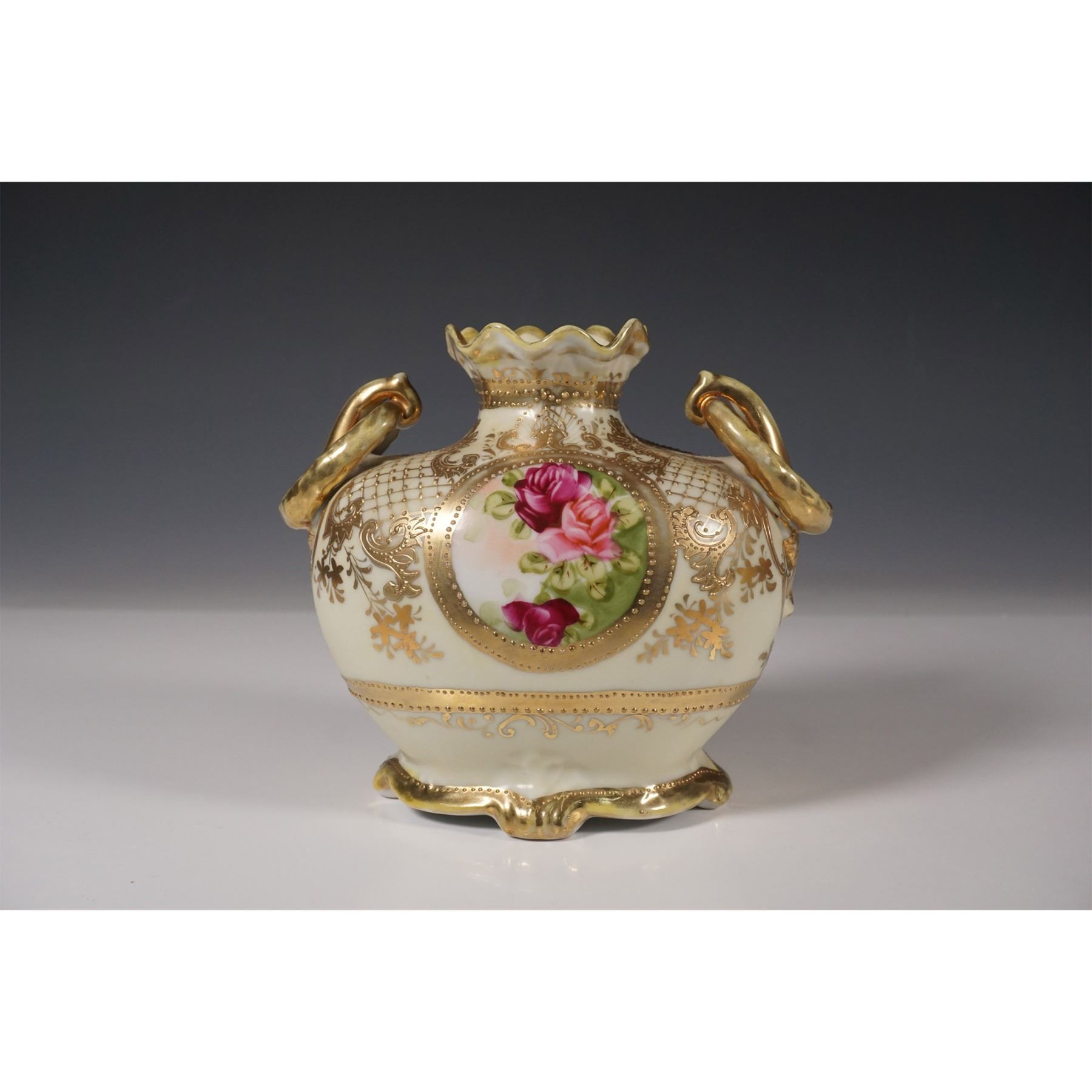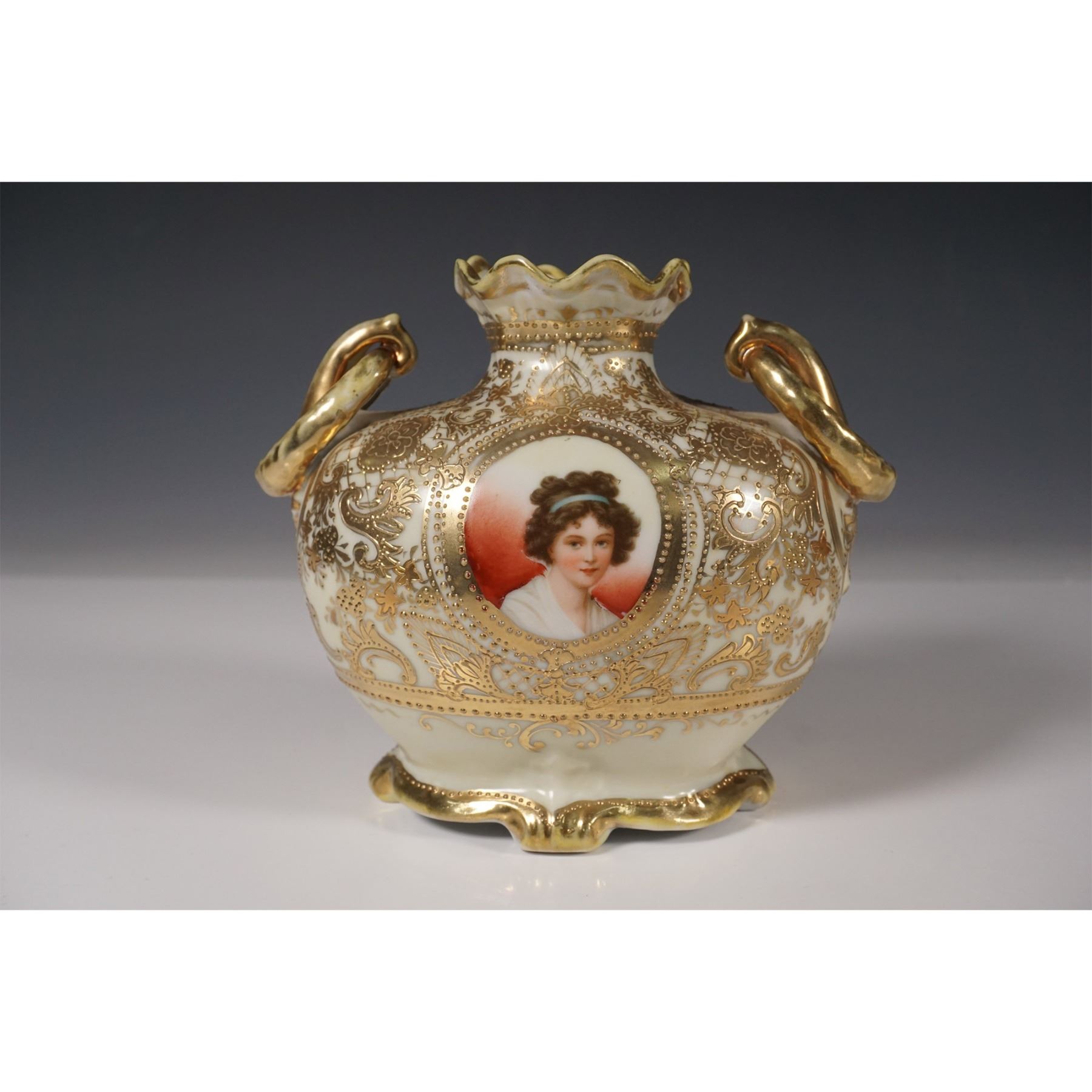 Elegant 2pc porcelain set featuring a hand-painted MZ Austria rectangular tray adorned with a floral motif, gold trim, and integrated handles. The set also includes a Nippon double-handled portrait vase with elaborate gold detailing, intricate raised beading, and a central hand-painted portrait of a lady framed in gilt. The reverse of the vase features a floral medallion. Both pieces showcase exquisite craftsmanship. The tray is marked MZ Austria, while the vase bears the Nippon mark. Tallest item: 5.25"H.
