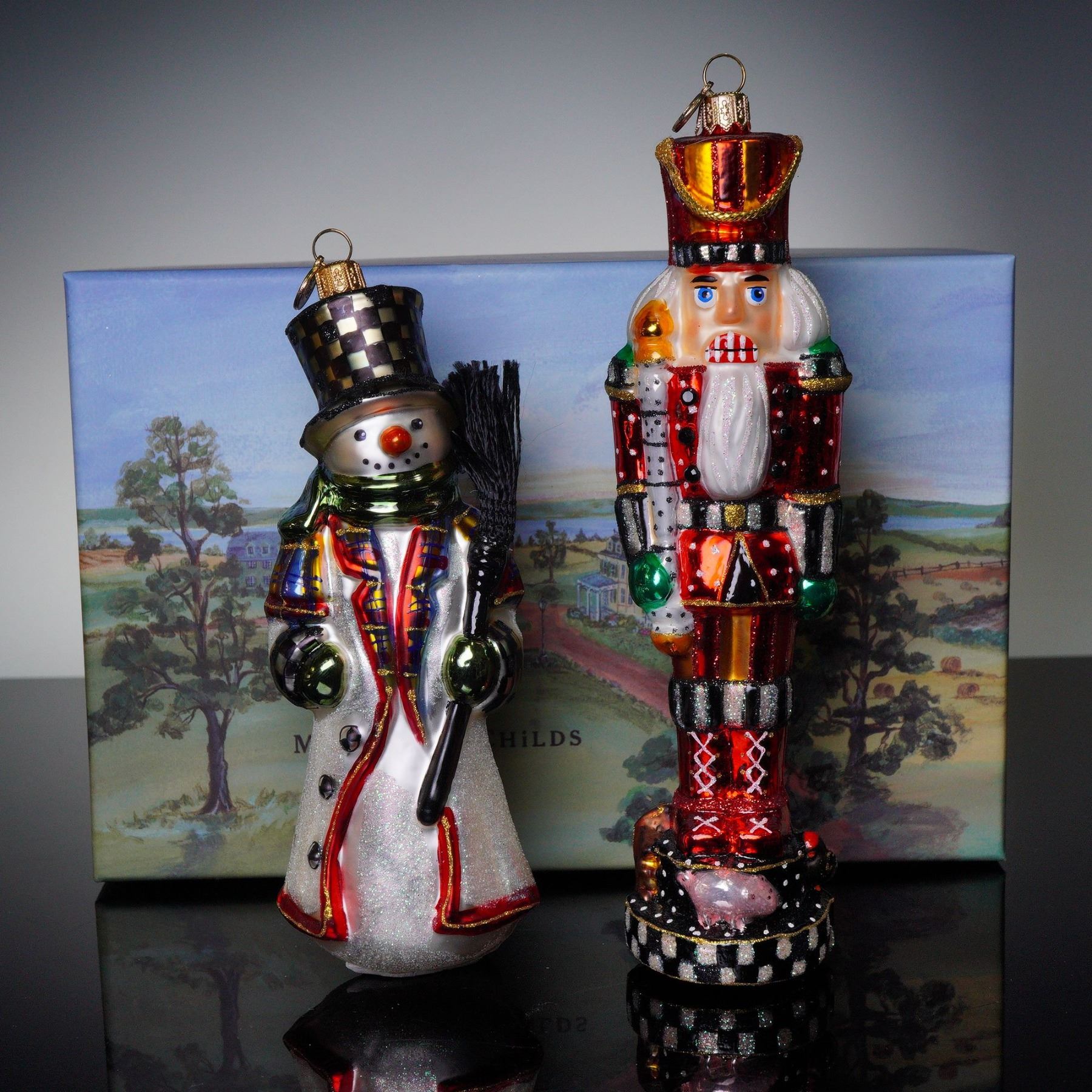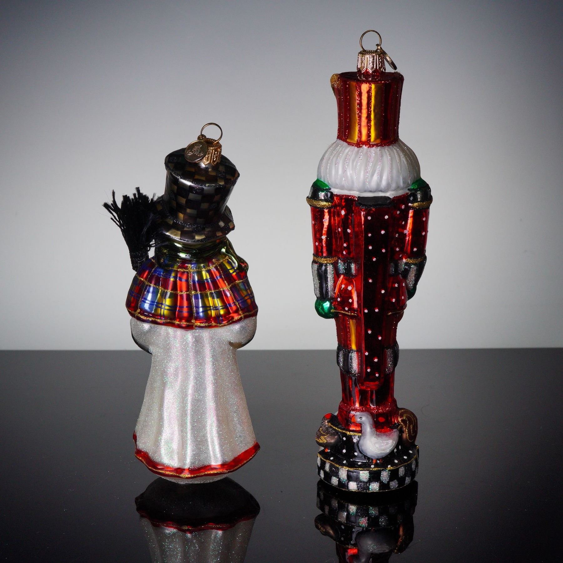 A set of two hand-painted glass Christmas ornaments by Mackenzie-Childs, comprising a nutcracker and a snowman. Each ornament features the brand's signature whimsical styling with vibrant colors, metallic accents, and distinctive checkered patterns. The snowman holds a broom and wears a top hat and plaid coat, while the nutcracker is detailed in red, green, and gold with a tall hat and painted base.