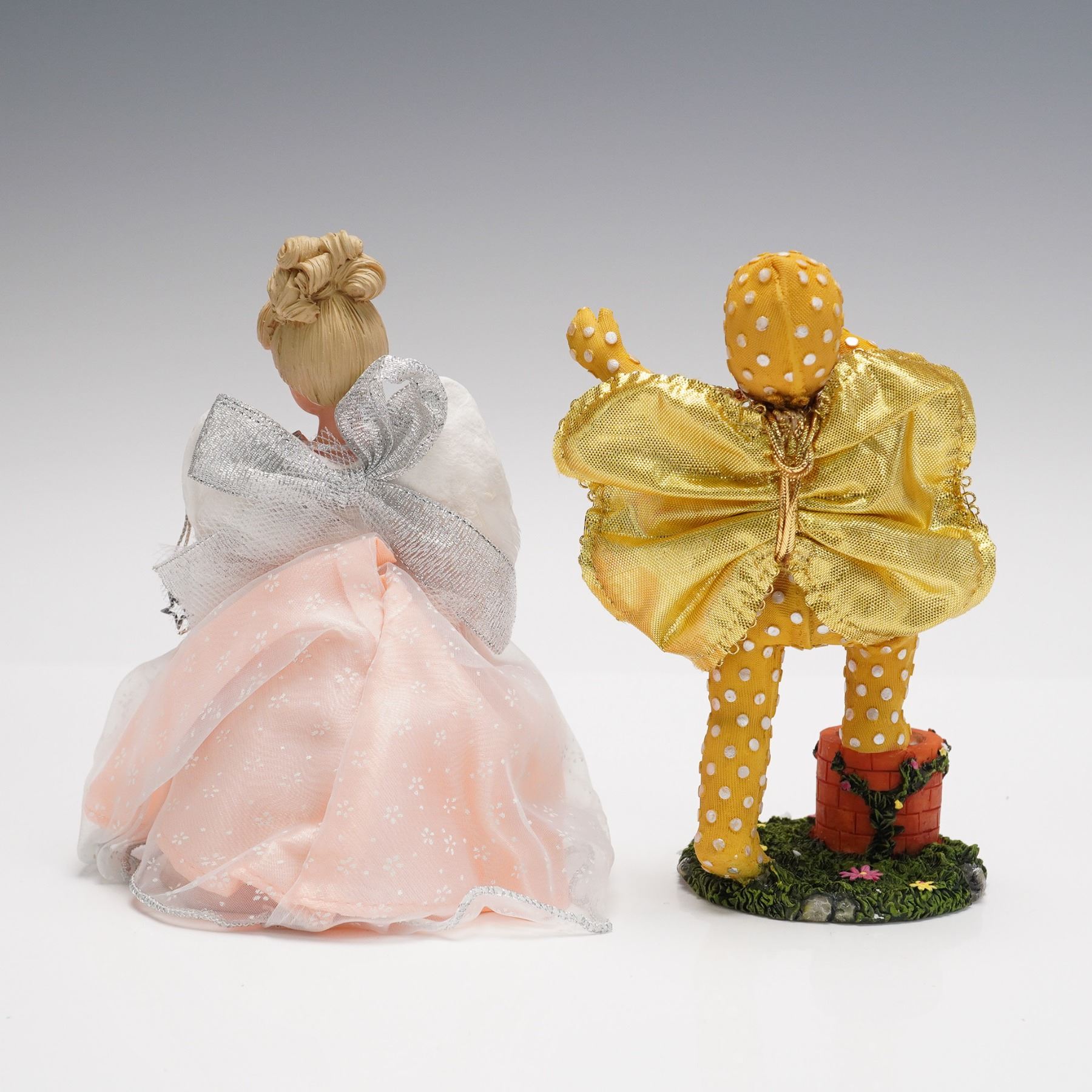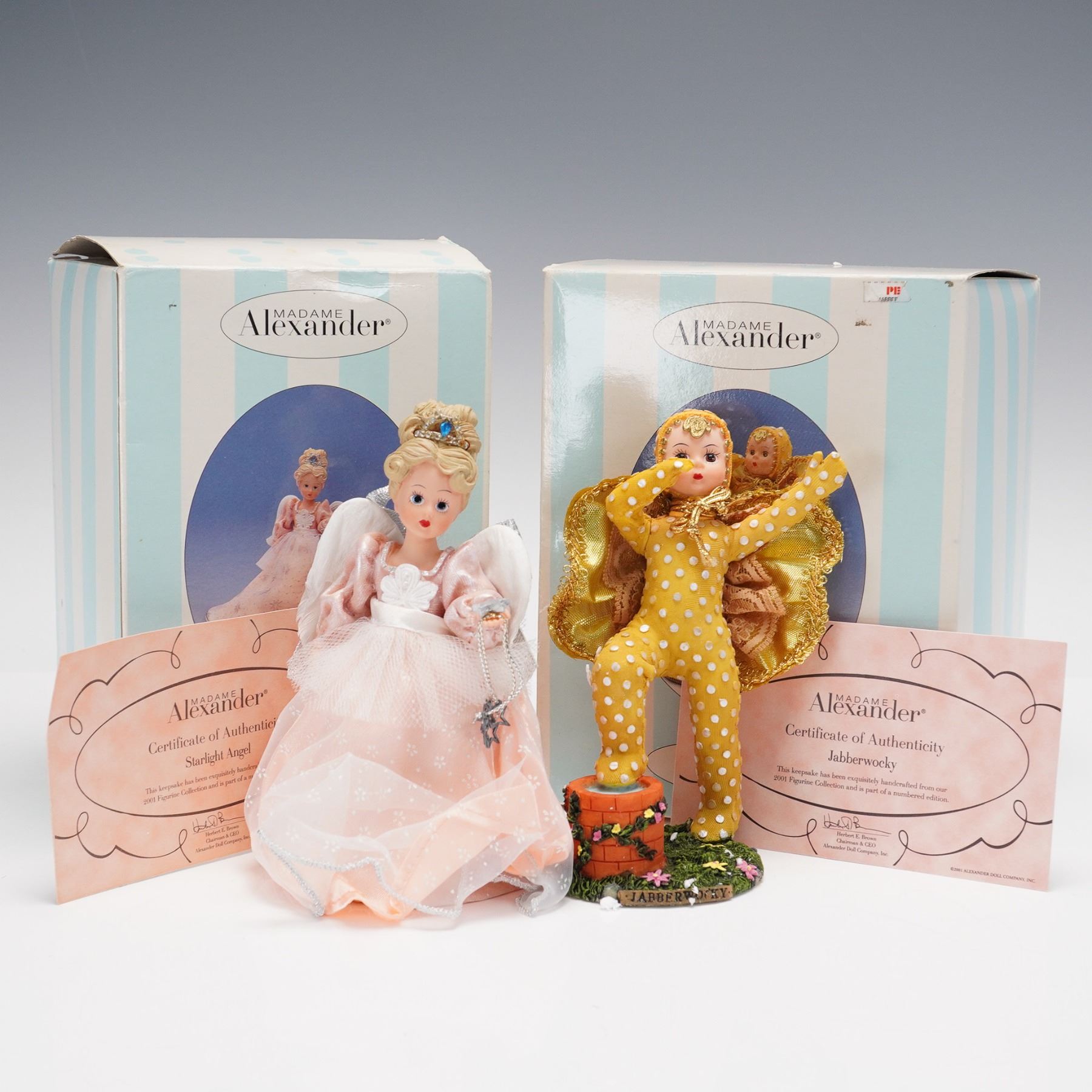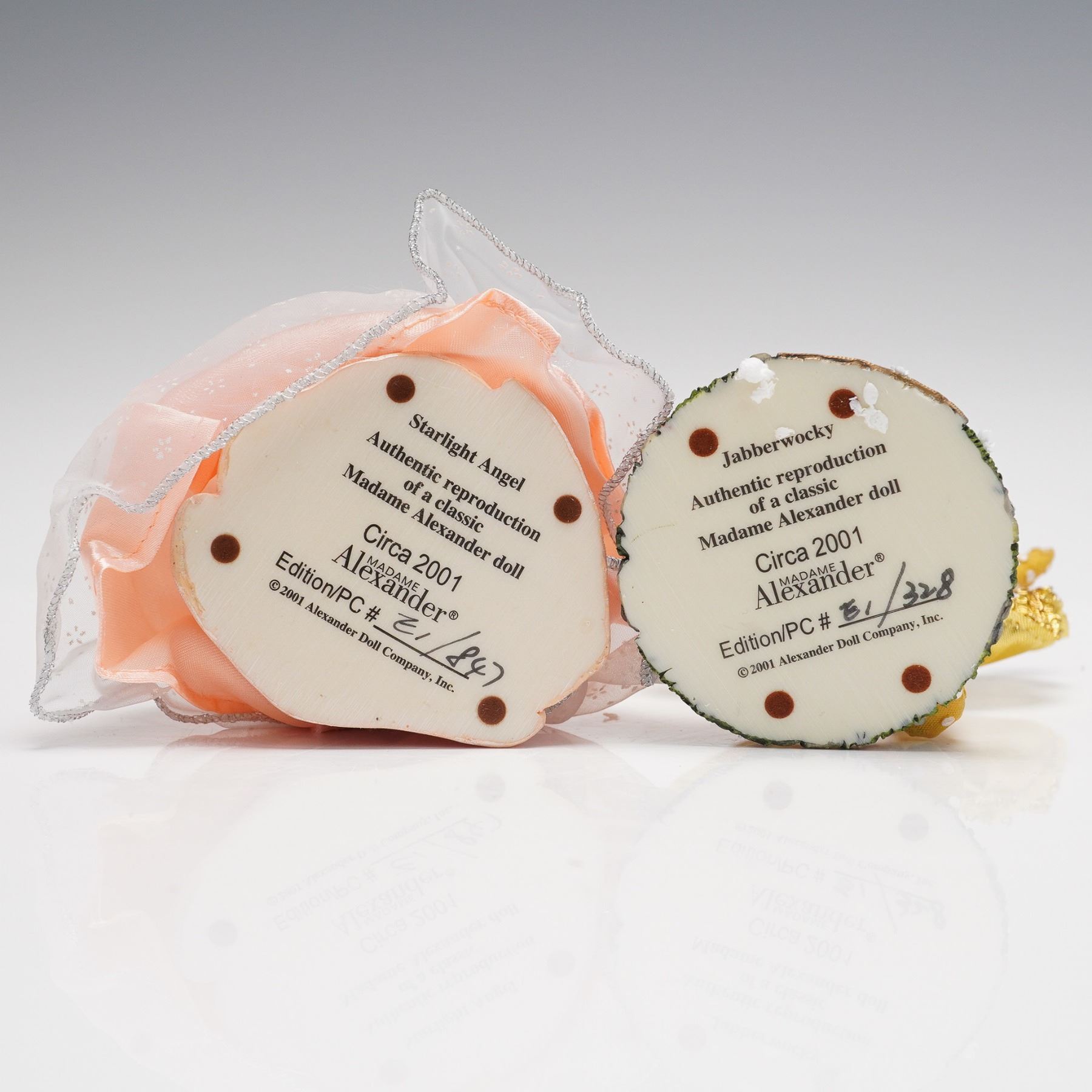 This lot features two Madame Alexander figurines: Jabberwocky and Starlight Angel. Both are authentic reproductions of classic Madame Alexander dolls, produced as limited editions. Each figurine includes its original box and certificate of authenticity. The figures are presented in detailed outfits and are marked with edition details on their bases. The tallest measures approximately : 4"L x 3"W x 5.75"H.