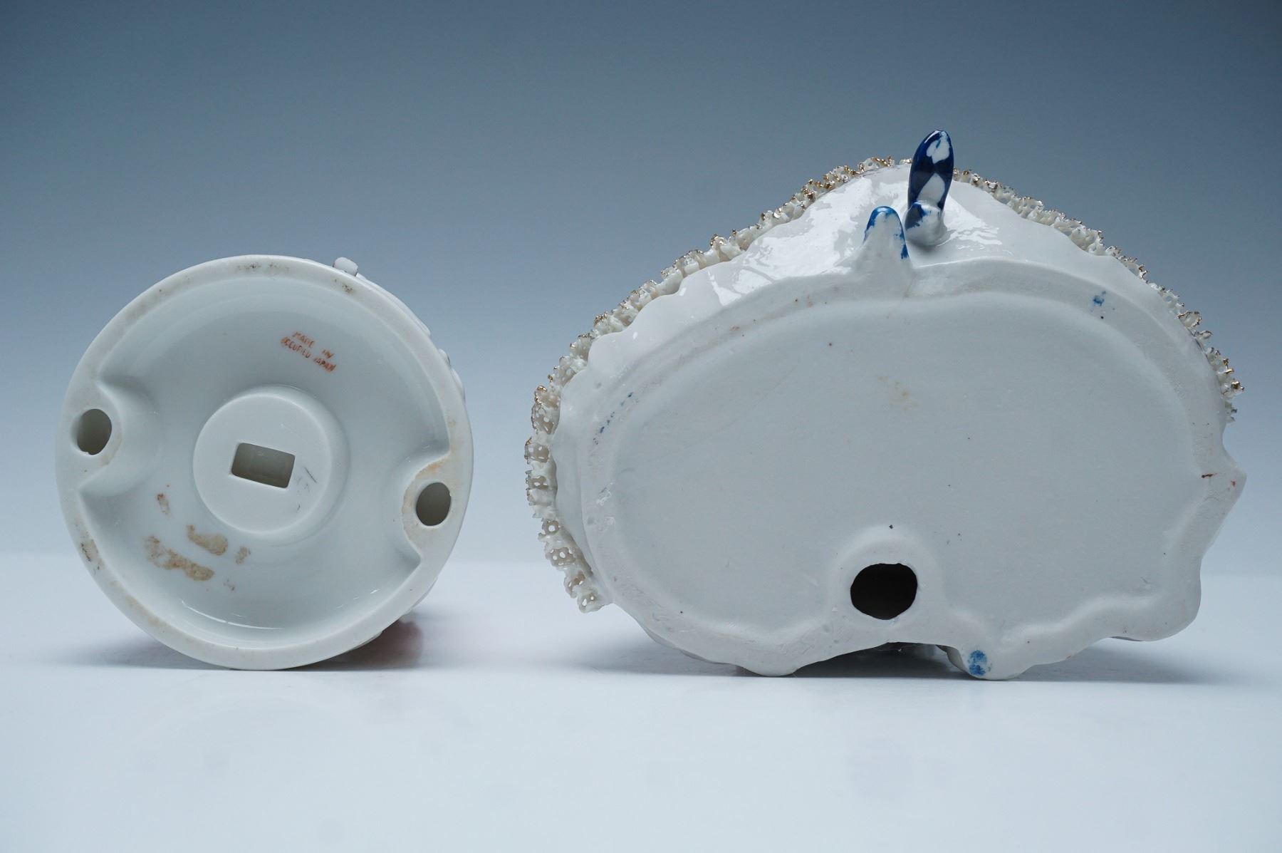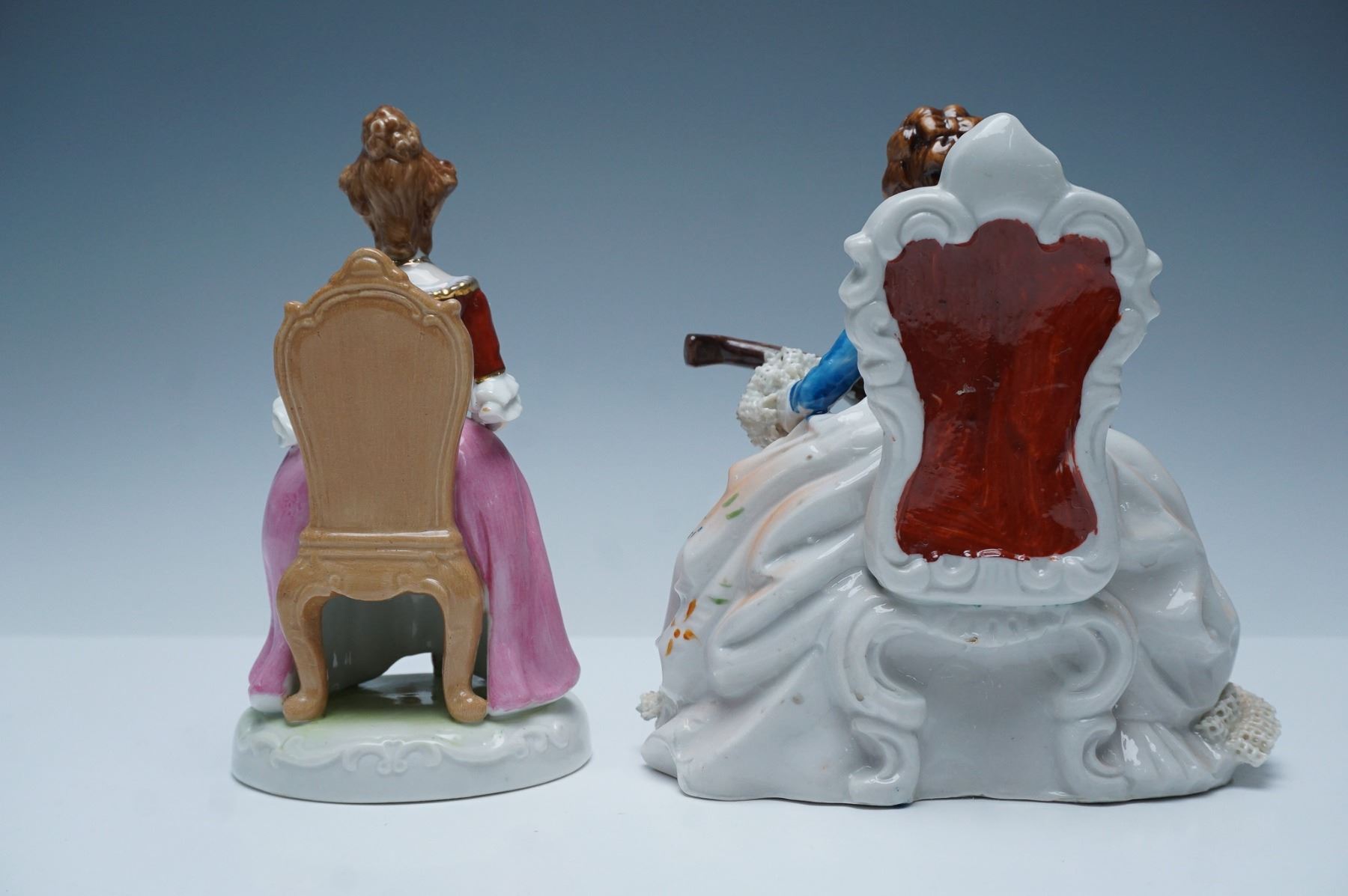 A pair of vintage "Made in Occupied Japan" porcelain figurines, dating to the post-WWII period (1945-1952). This elegant duo features finely detailed women in 18th-century-inspired attire, one seated with an open book and the other playing a stringed instrument. The figurines are hand-painted with floral patterns, gilded accents, and lace-like porcelain trim, showcasing the refined craftsmanship characteristic of Occupied Japan ceramics.