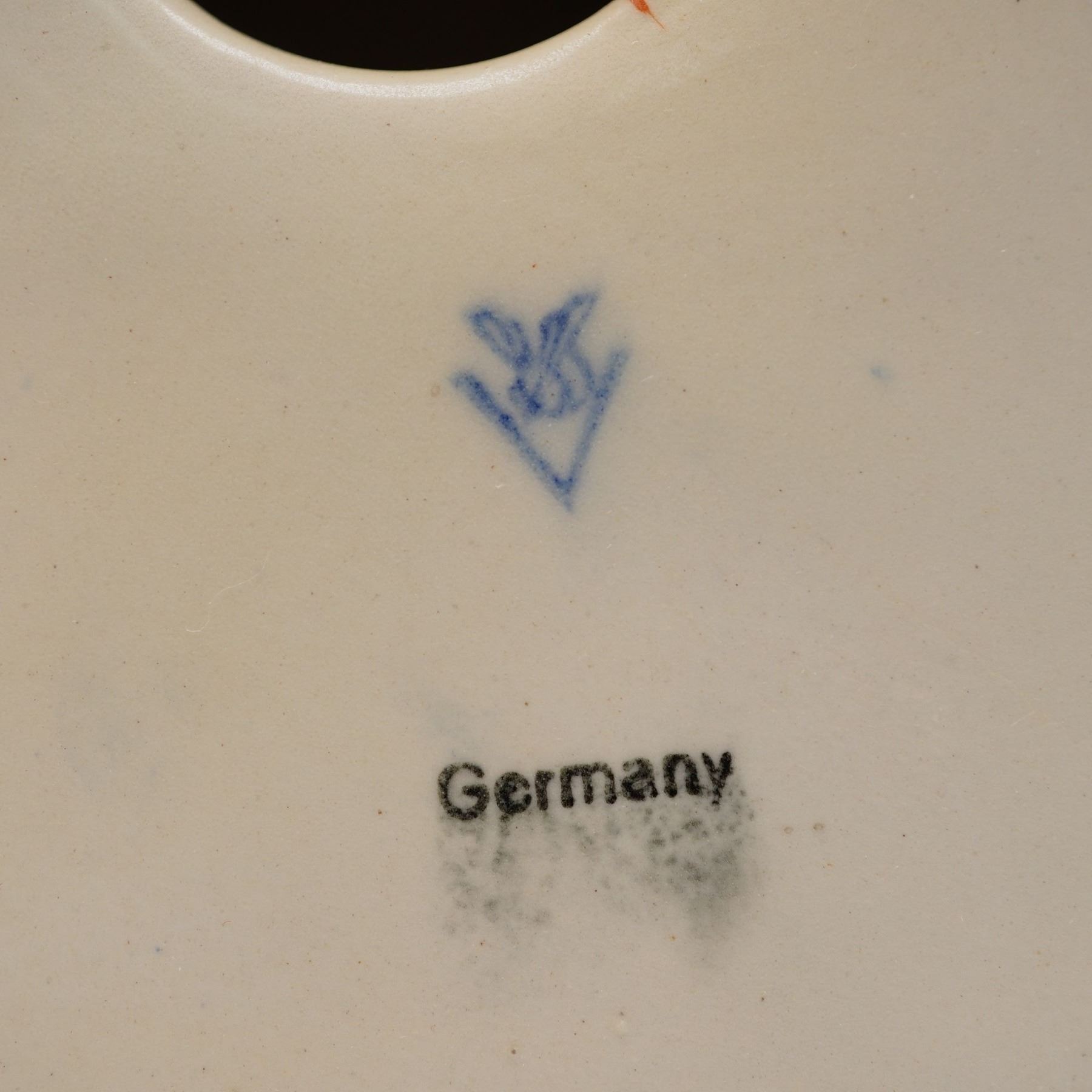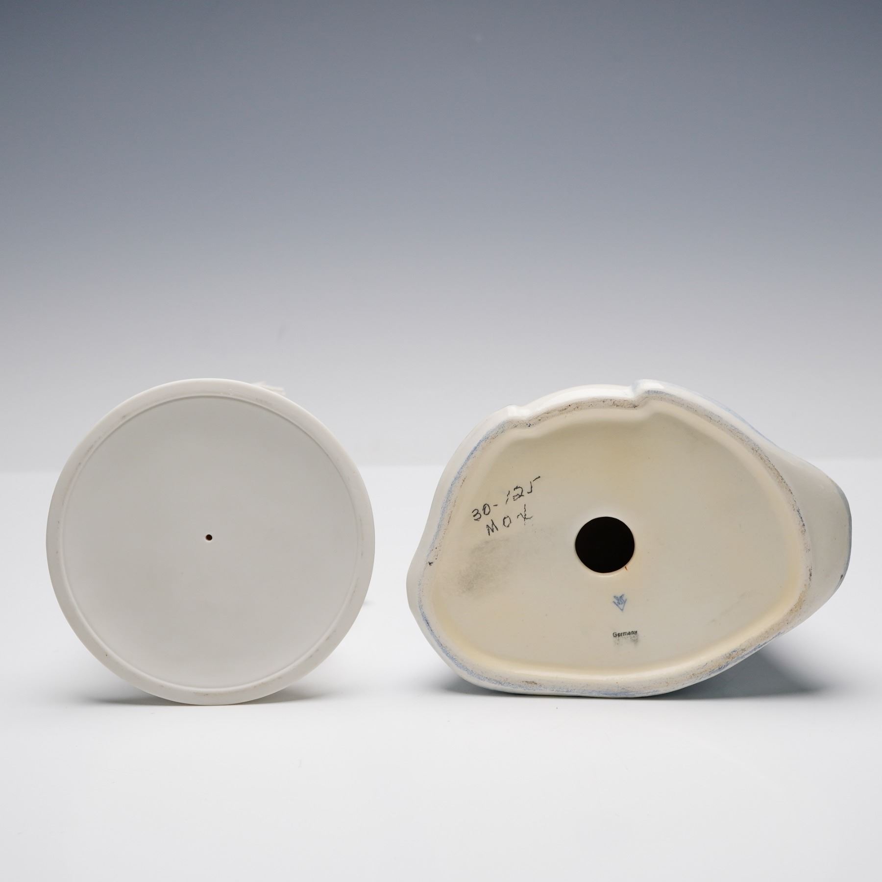 A two-piece group of religious porcelain figures featuring a Goebel Madonna and Child figurine alongside an unmarked figurine of St. Francis of Assisi with a fawn and bird. The Madonna displays hand painted pastel tones and delicate detail, while the St. Francis is finished in matte white. The Madonna is marked with the Goebel backstamp and model number 10/1.