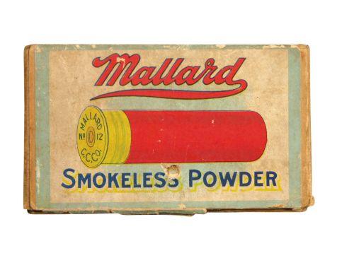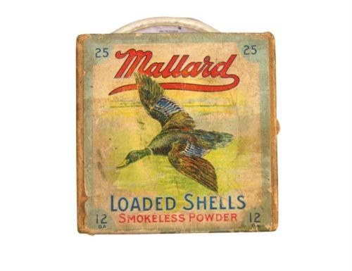 Two Piece Mallard Shot Shell Box for 12 gauge smokeless powder shot shells, empty. Very good condition, complete.