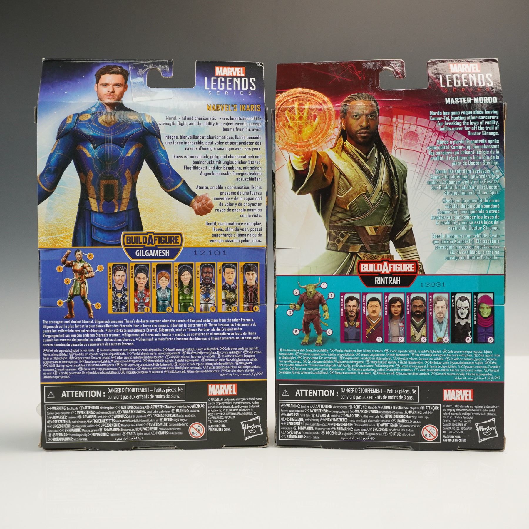Pair of Marvel Legends Series 6-inch action figures by Hasbro, each part of a Build-A-Figure collection. Includes Marvel's Ikaris from Eternals, part of the Gilgamesh Build-A-Figure wave, featuring an alternate head and hands. Also includes Master Mordo from Doctor Strange in the Multiverse of Madness, part of the Rintrah Build-A-Figure series, with alternate hands, accessories, and a BAF piece. Both figures are factory sealed in original packaging with character artwork and bios on the back. Each figure is articulated and designed for collectors ages 4 and up. Each box measures 6.25"L x 2.5"W x 10.5"H.