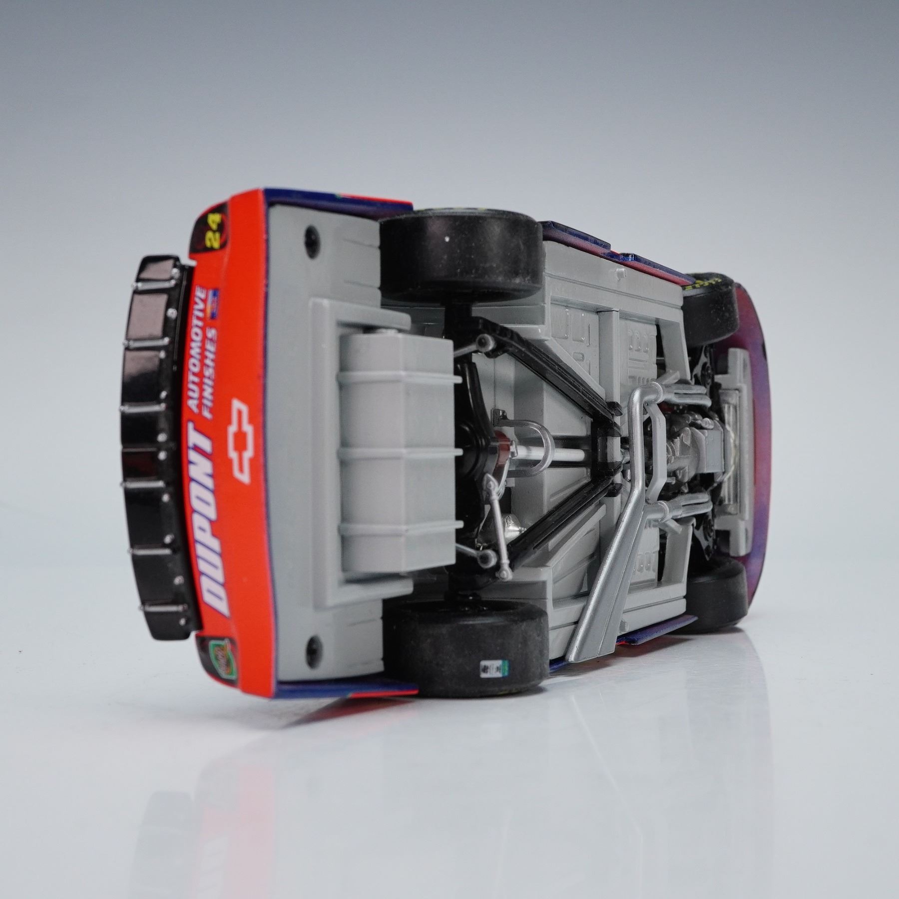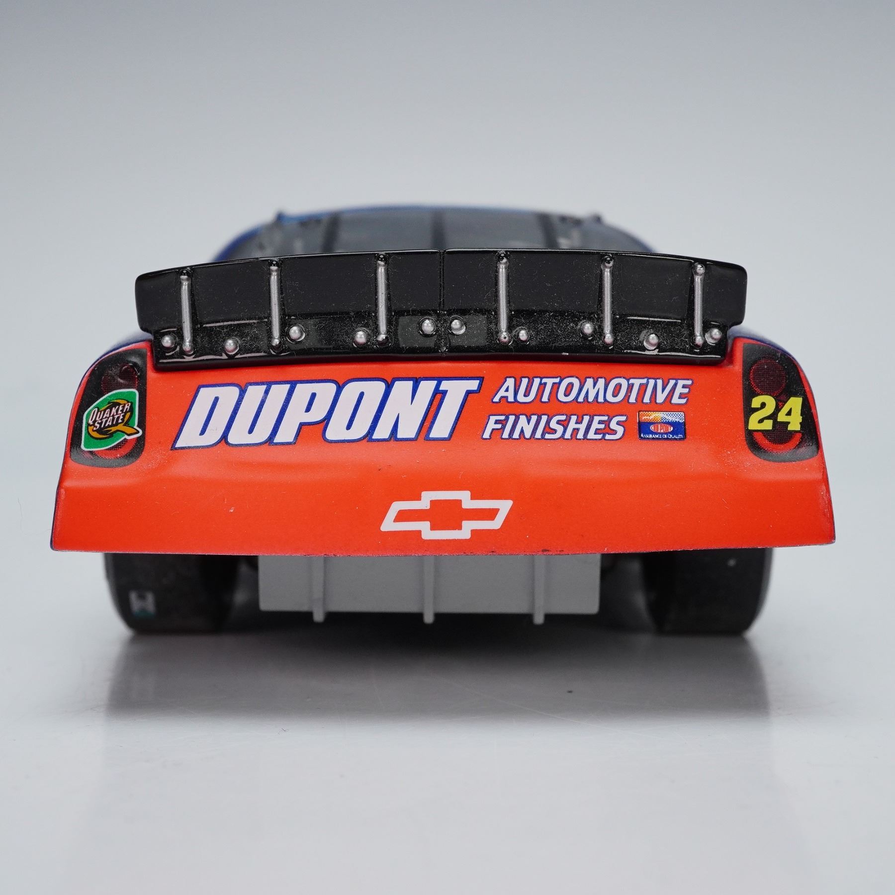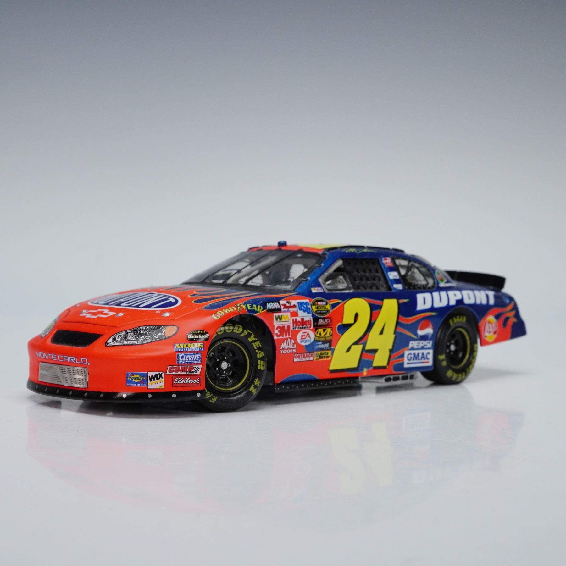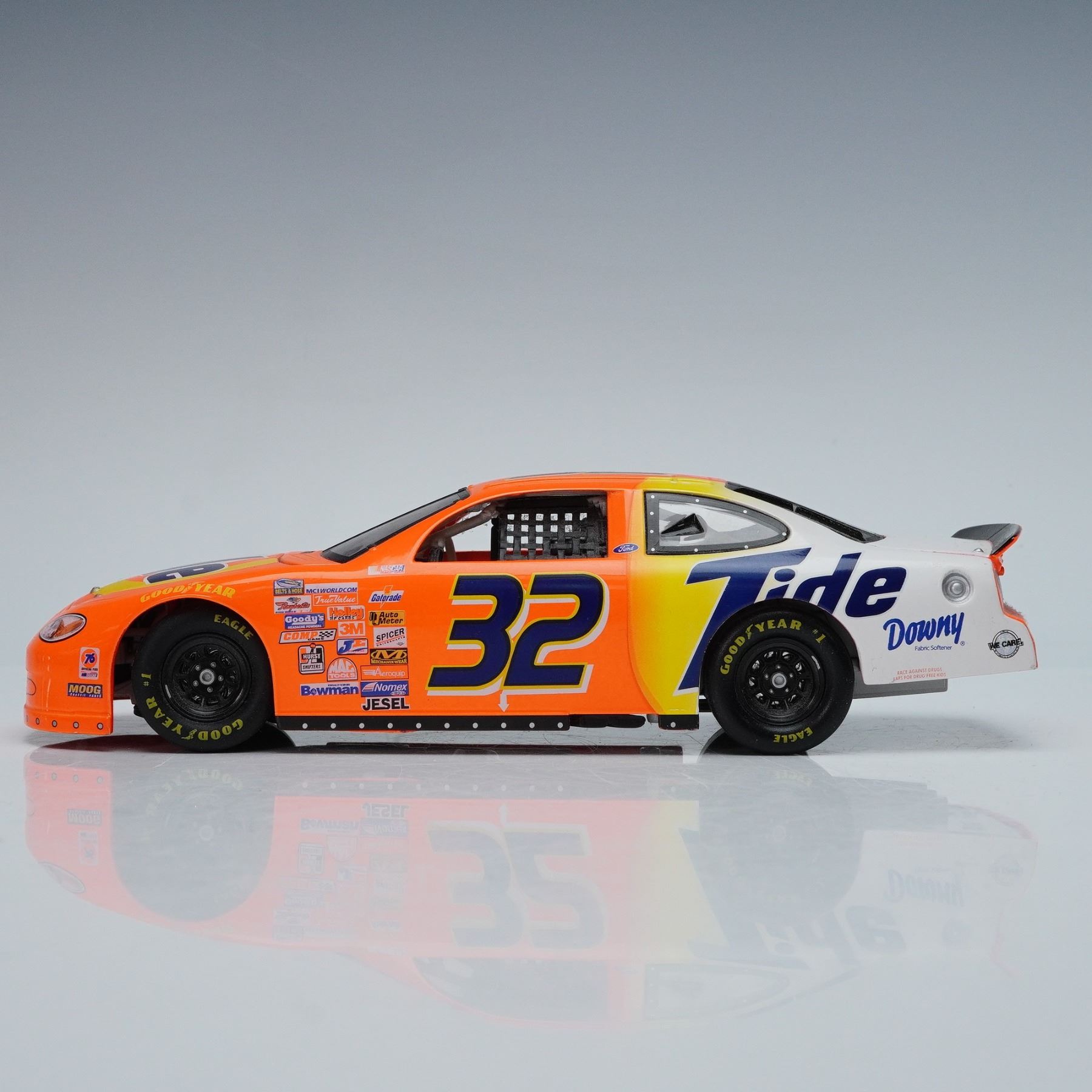 These NASCAR model cars showcase two iconic liveries, with Jeff Gordons number 24 in vivid red and blue featuring bold Dupont branding and flame graphics, and Scott Pruetts number 32 in bright orange fading to white with the classic Tide logo. Each car is detailed with sponsor decals, black racing interiors, authentic wheels, and aerodynamic body styling that captures the look of their track ready counterparts. Mattel backstamp. Action backstamp.