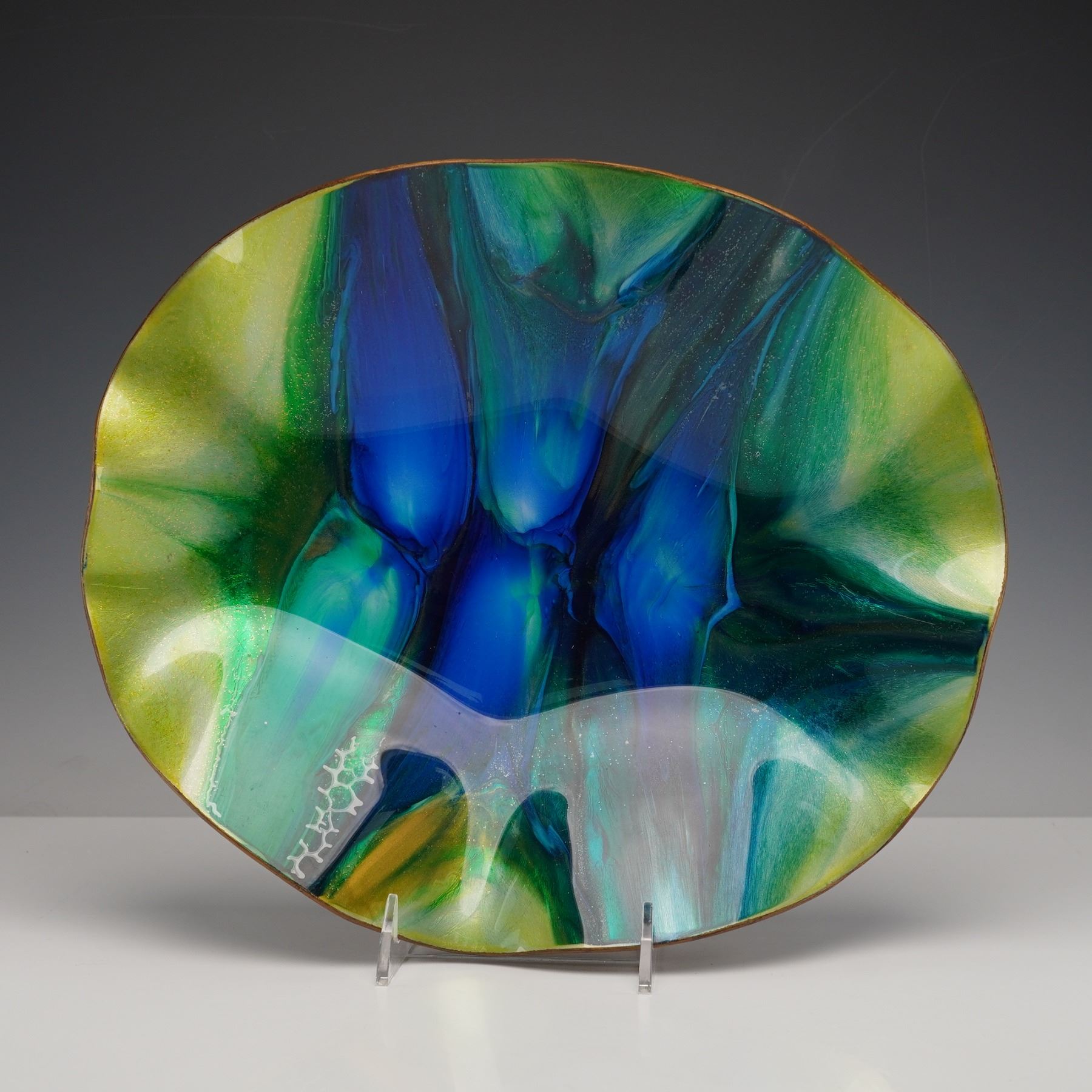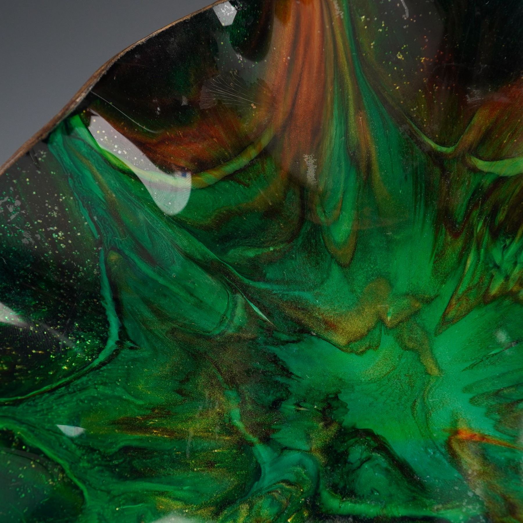 A striking pair of mid-century decorative art glass bowls, each displaying fluid, marbled swirls of rich green, blue, amber, and gold tones. The organic, freeform shapes are backed in genuine leather with a metallic gold finish, typical of Seetusee's distinctive fusion of artistry and craftsmanship. Retains original red and gold foil label reading "Mayfair Seetusee, Made in Canada, Genuine Leather Backed," with impressed mark "M52" visible on verso. Model M52.