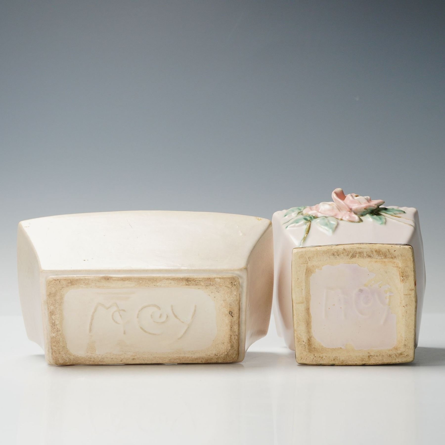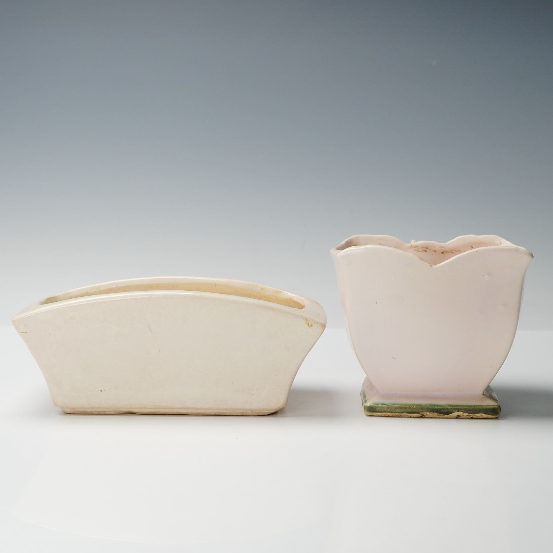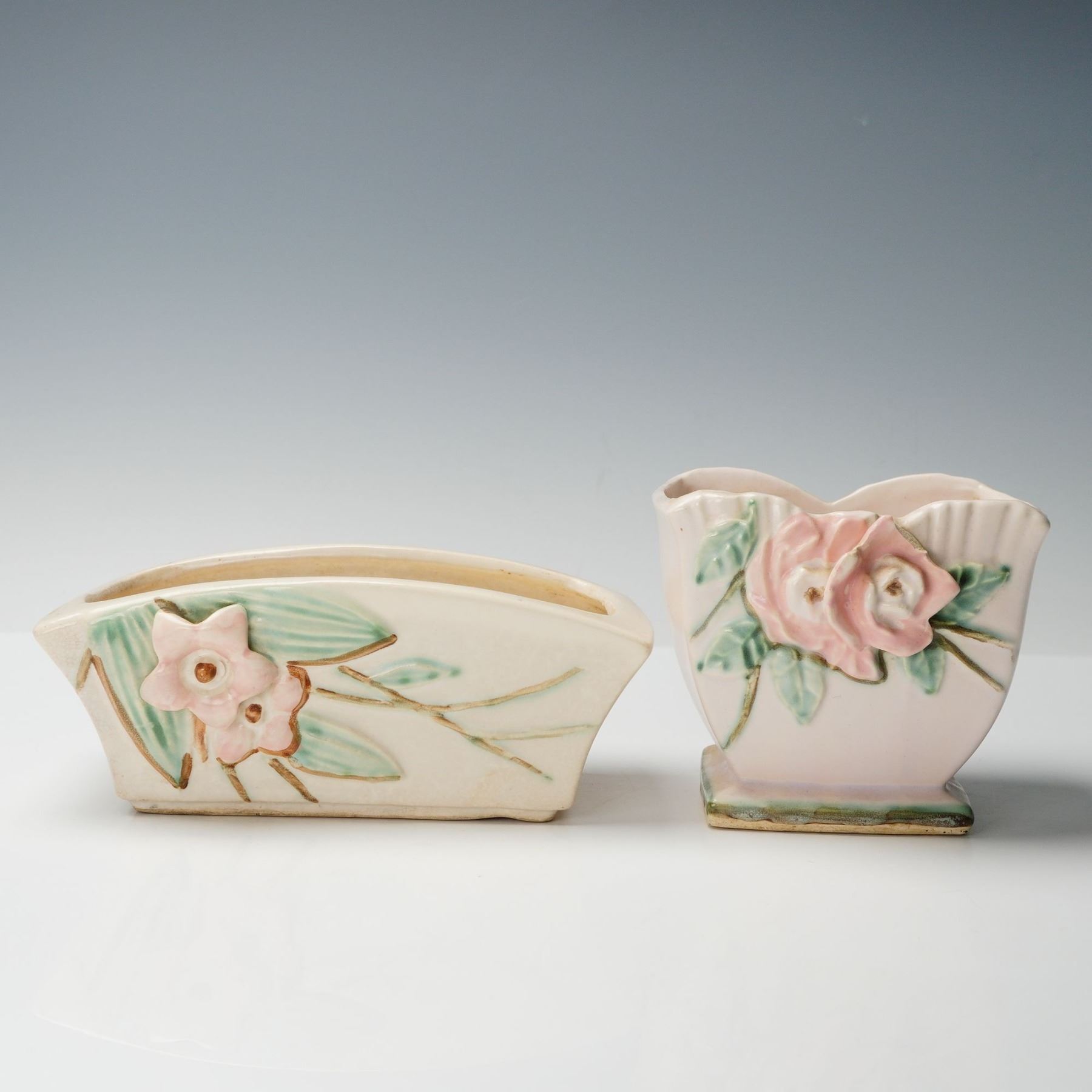 Two charming vintage McCoy pottery planters, both featuring the delicate Wild Rose motif in soft pastel tones. Each piece displays McCoy's signature hand-applied floral decoration with raised pink blossoms and green leaves against a creamy and blush ground. The first planter has a sleek, elongated form with incised floral detail, while the second has a scalloped rim and pedestal base, accentuated by applied pink roses in relief. Both pieces bear the impressed McCoy mark on the underside. These classic examples of mid-century American art pottery showcase McCoy's distinctive blend of subtle color, organic design, and functional elegance.