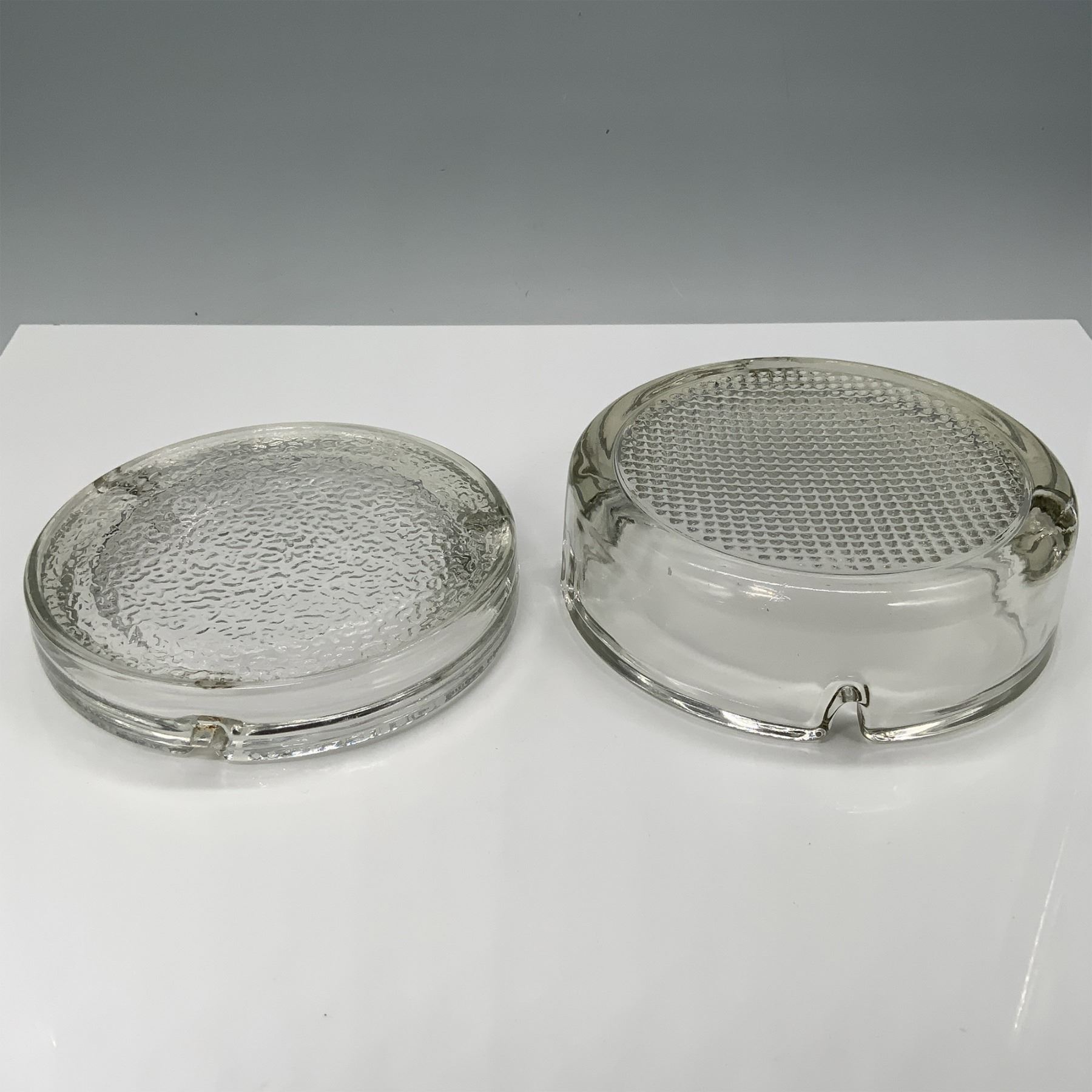 This lot includes a pair of vintage glass ashtrays, each featuring a textured pattern on the bottom. The clear glass pieces display a honeycomb-like design that adds a unique visual texture to the base, while the tops remain smooth. The ashtrays have curved sides, showcasing a mid-century modern aesthetic. Both pieces are in excellent condition with no visible chips or cracks, making them a great addition to any collection of vintage glassware.