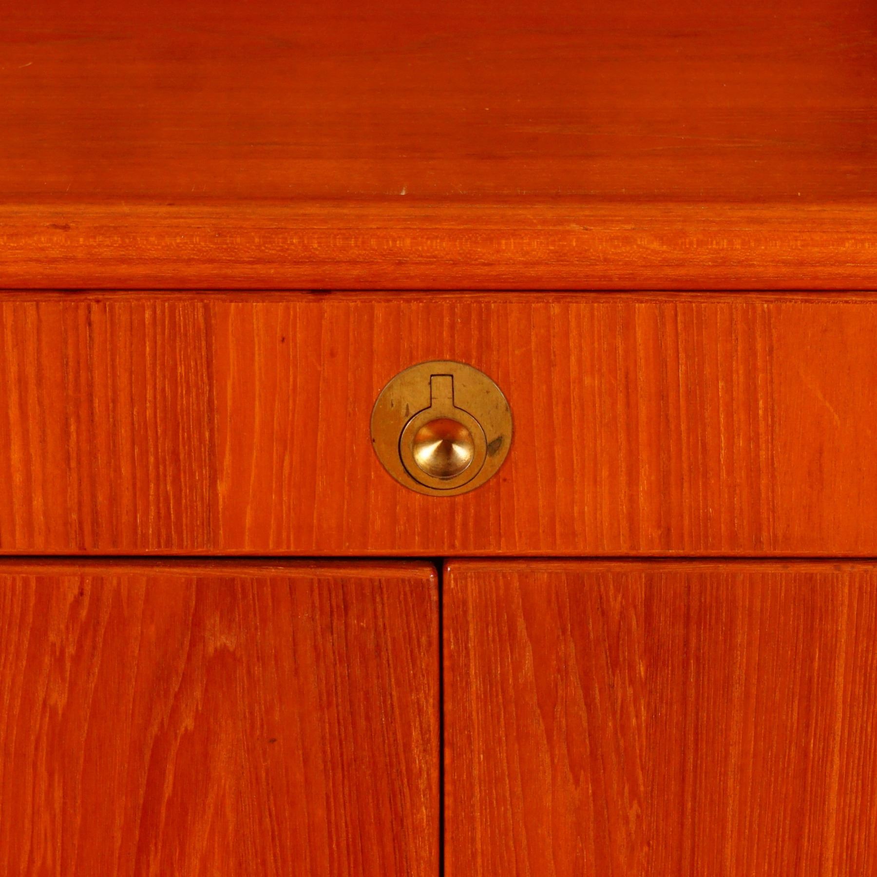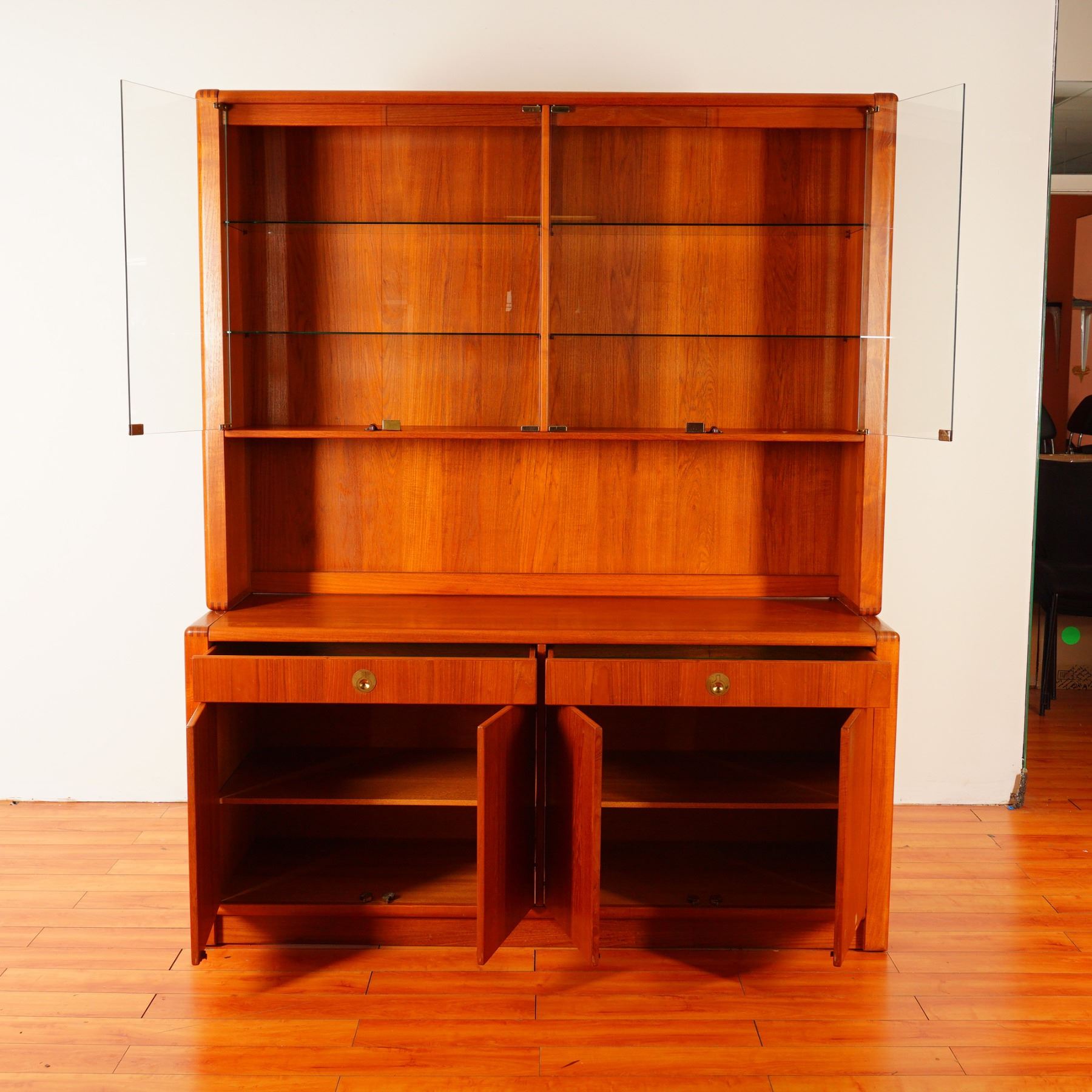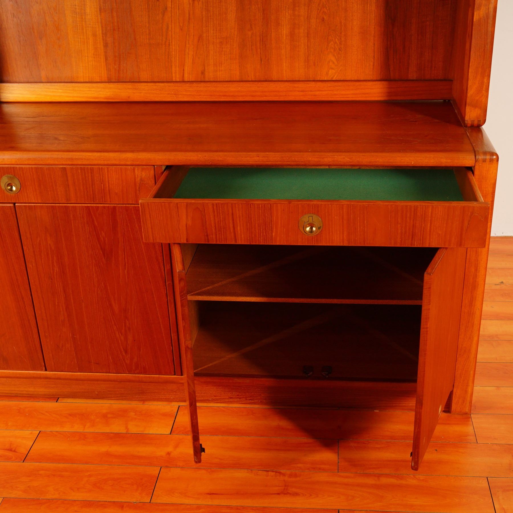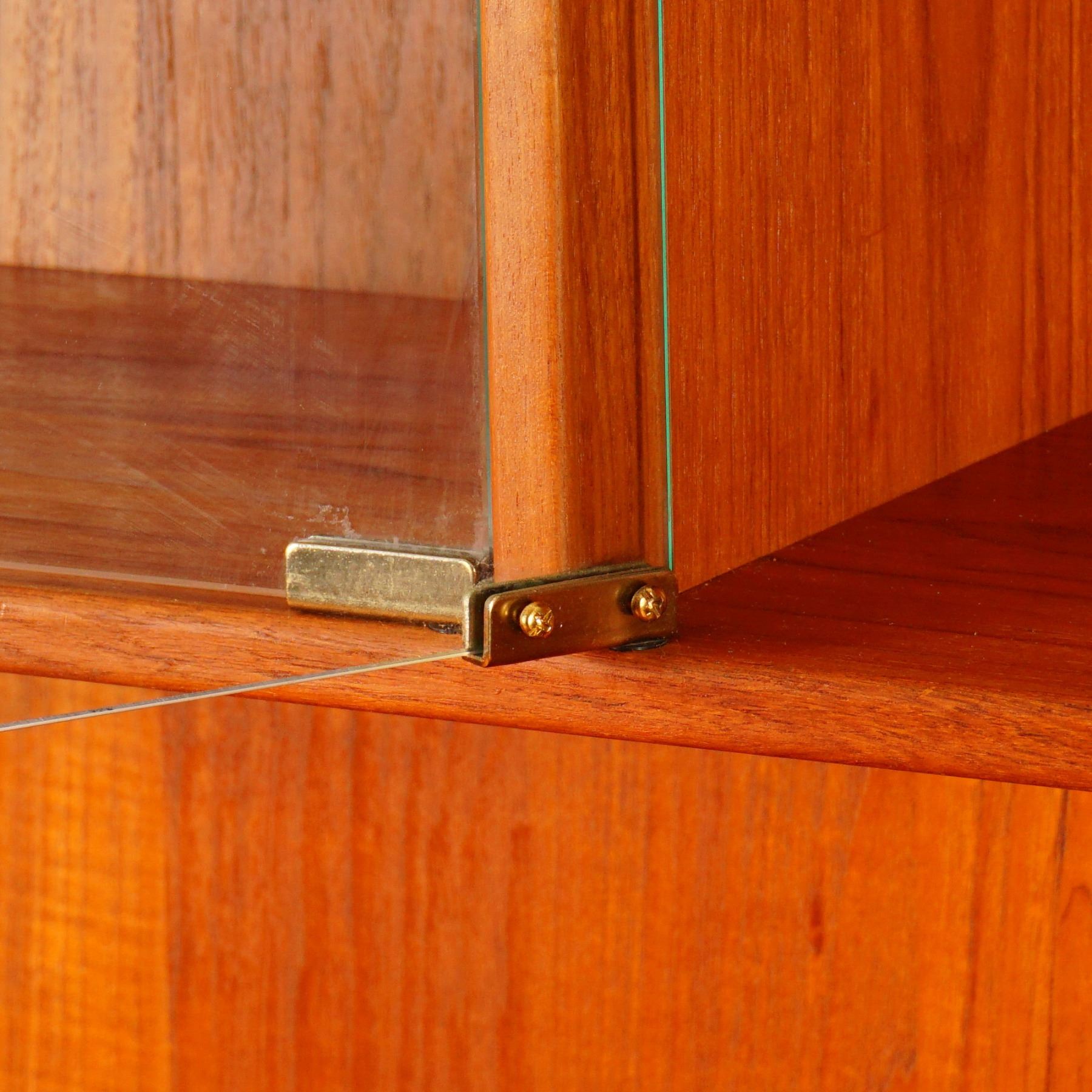 This striking mid century teak display cabinet by Captain Line, made in Singapore, features warm golden tones and clean Scandinavian-inspired lines. The two-piece construction includes an upper glass-fronted display hutch with two adjustable glass shelves, and a lower credenza with double doors and two drawers lined in green felt for fine storage. Brass ring pulls, dovetail joinery, and sculpted edges highlight its quality craftsmanship, while the glass panels and warm teak grain enhance its refined, modernist presence. A sophisticated and versatile addition to any mid century modern interior, perfect for collectors and design enthusiasts alike.