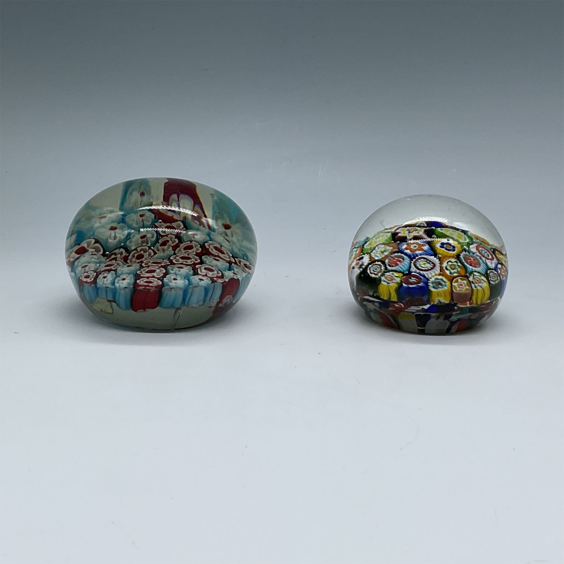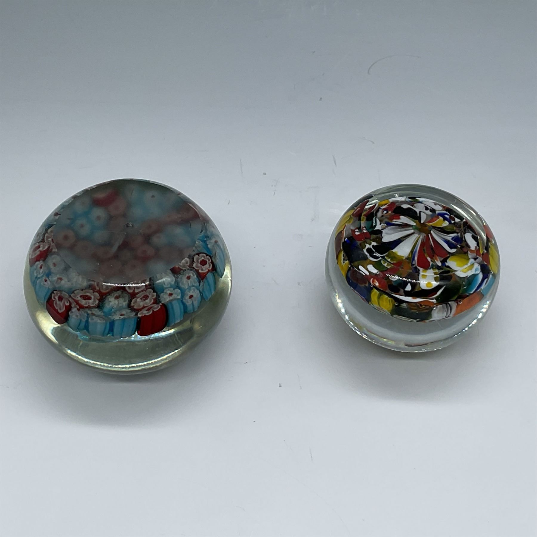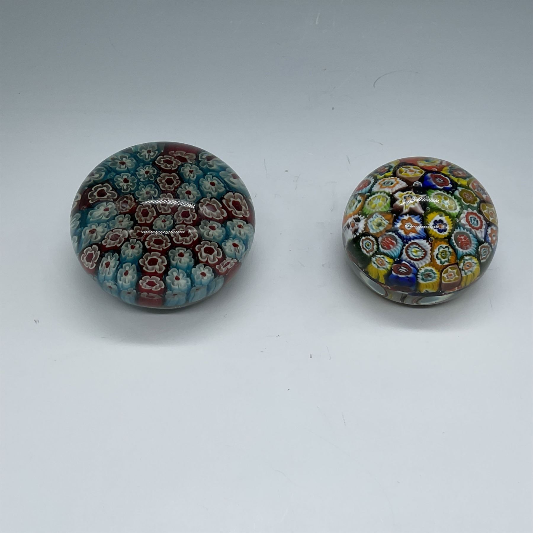 A pair of Millefiori paperweights featuring intricate multicolor floral designs. One paperweight showcases a vibrant palette of reds and blues, while the other displays a lively mix of bright, colorful millefiori patterns. Both pieces exhibit exquisite craftsmanship and are perfect for collectors or as decorative accents.