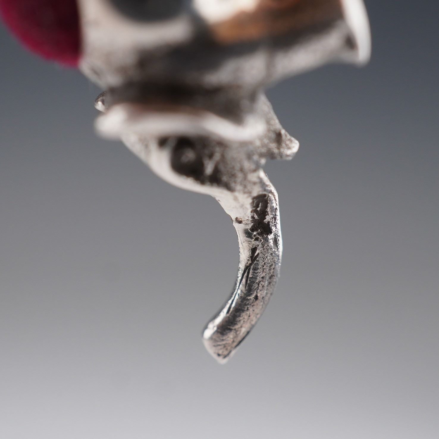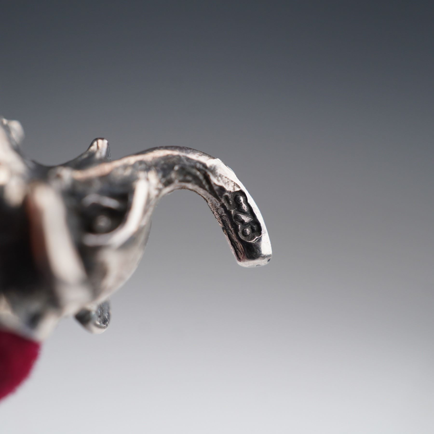 This charming 2-piece set of miniature elephants is crafted from sterling silver, each featuring a red felt pin cushion on their backs. The elephants are intricately detailed, with raised trunks and realistic features. These playful figurines serve as functional pin cushions while adding a whimsical touch to any collection. Both pieces are marked "925" to indicate their sterling silver composition. Overall weight: 0.42 oz.