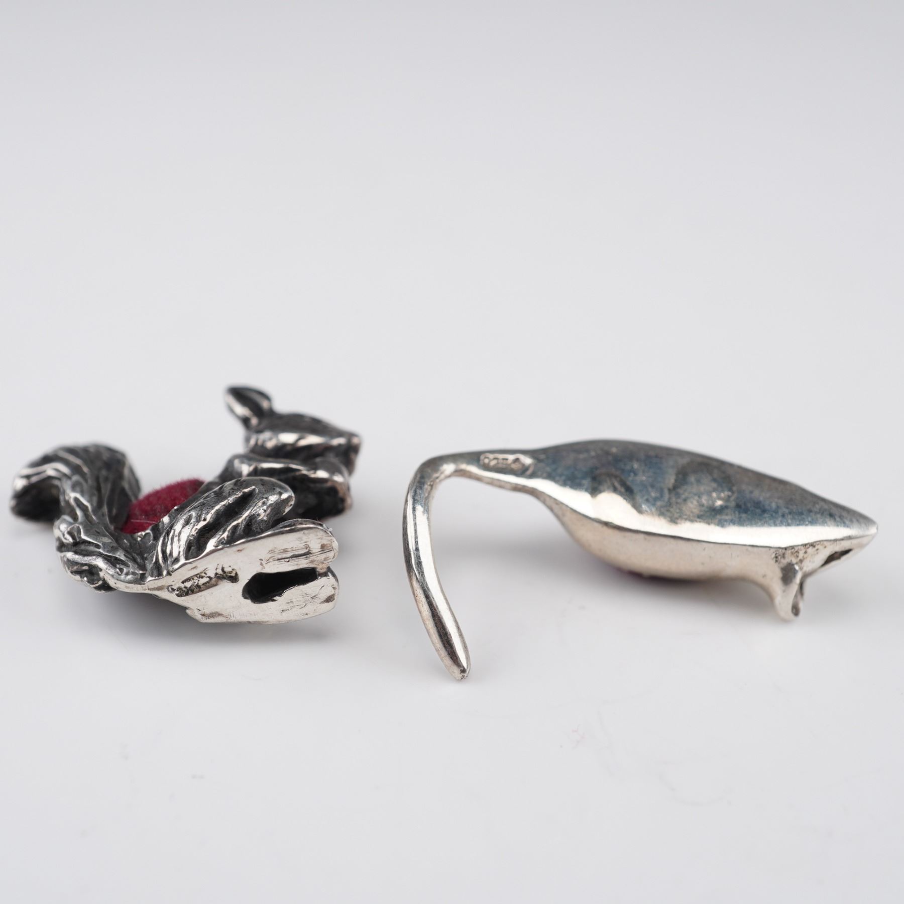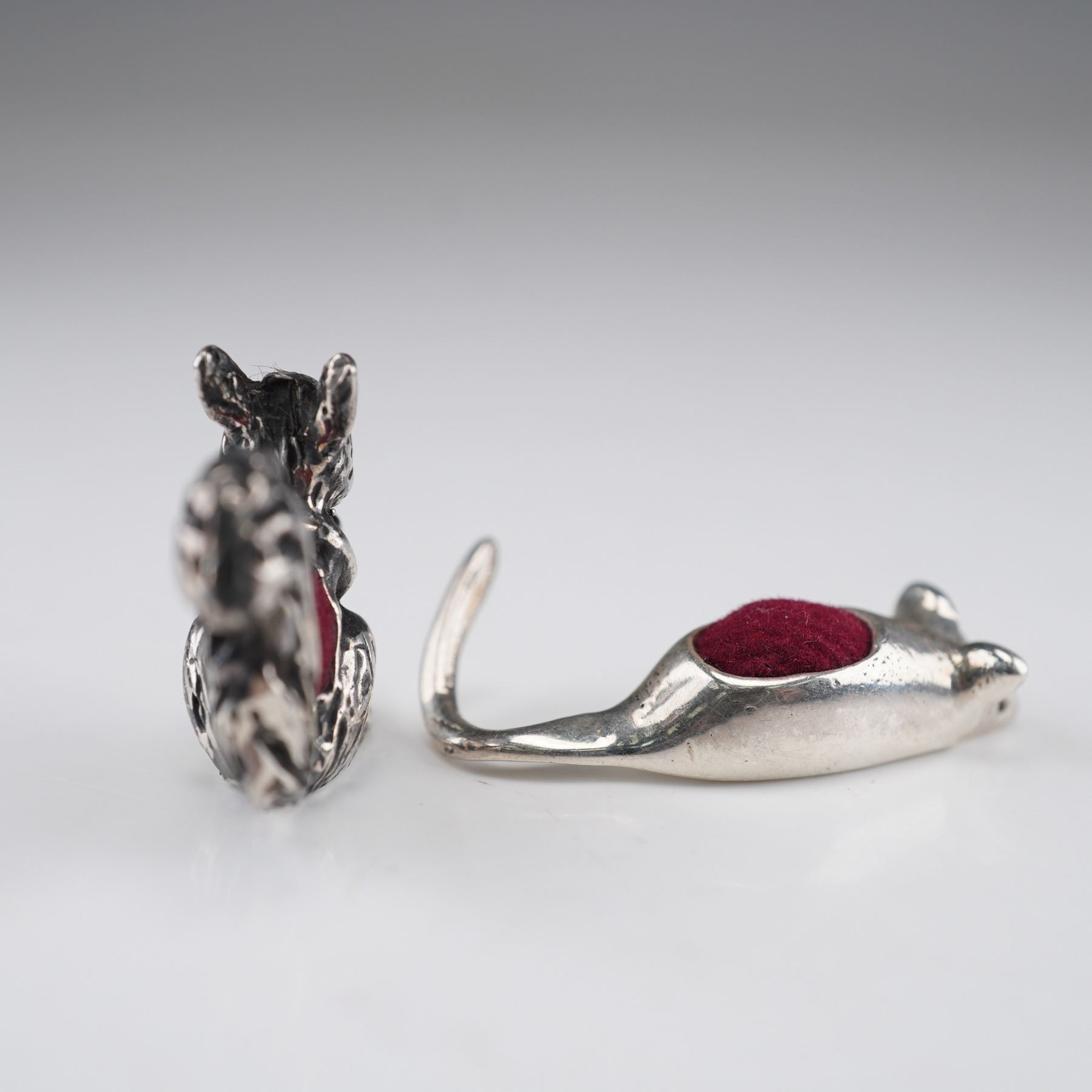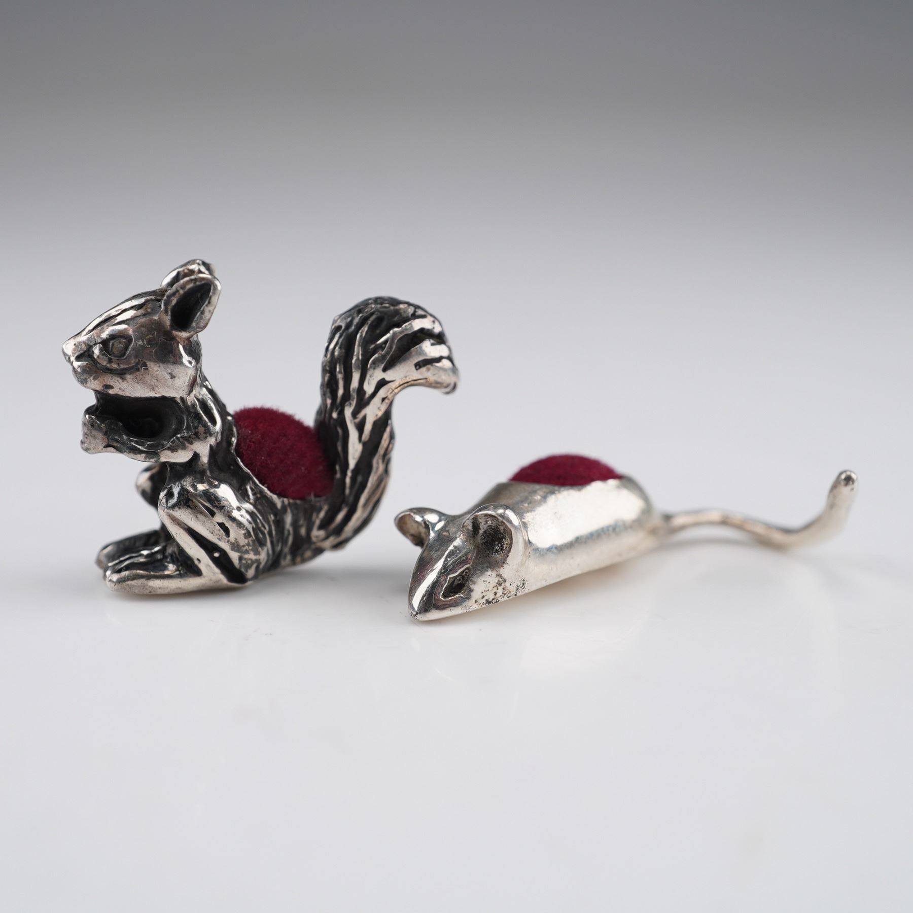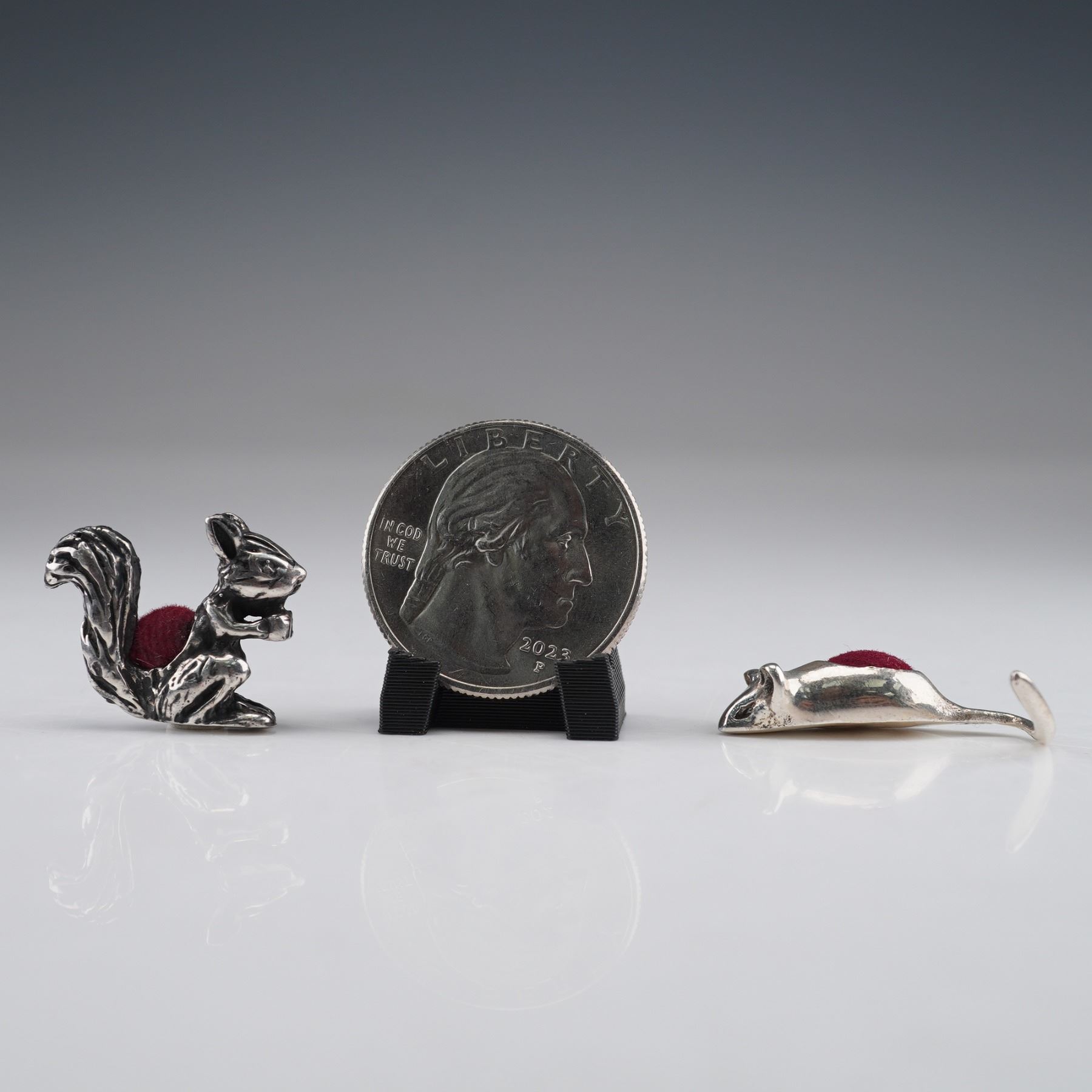 2pc Miniature Sterling Silver Pin Cushions, Mouse and Squirrel