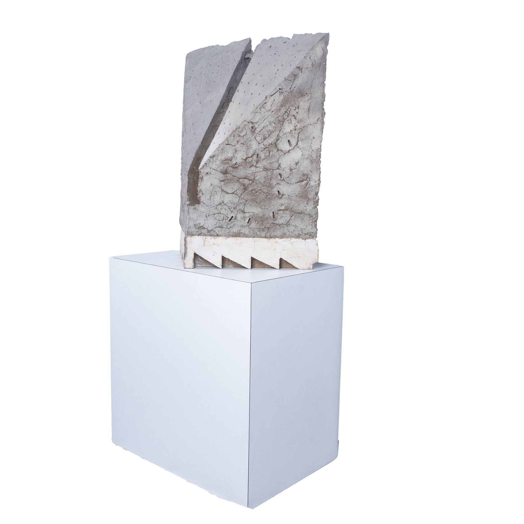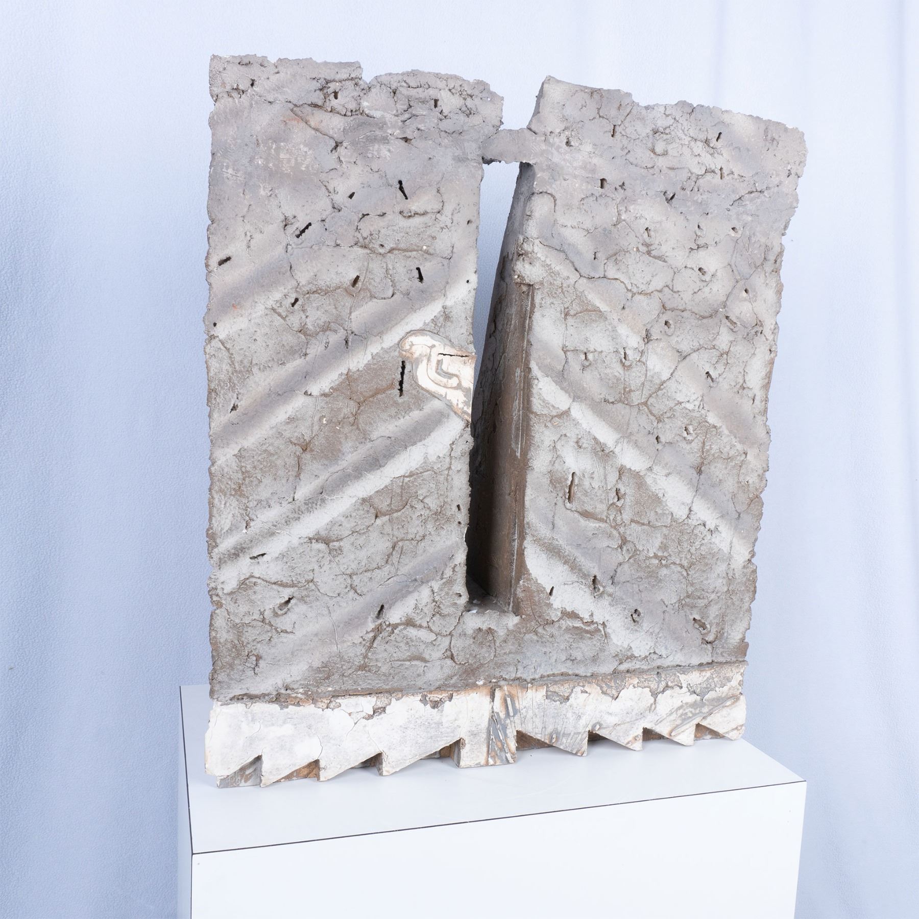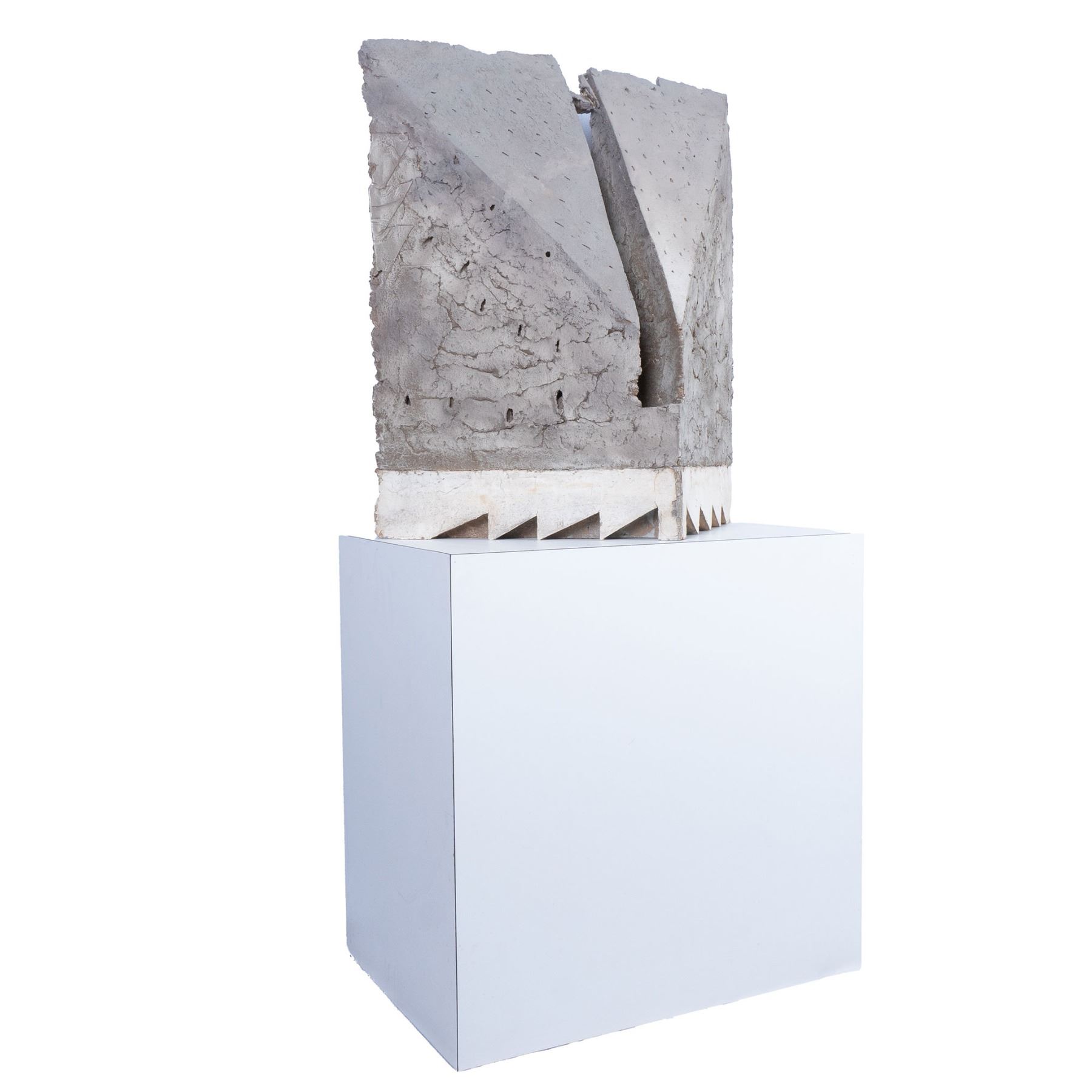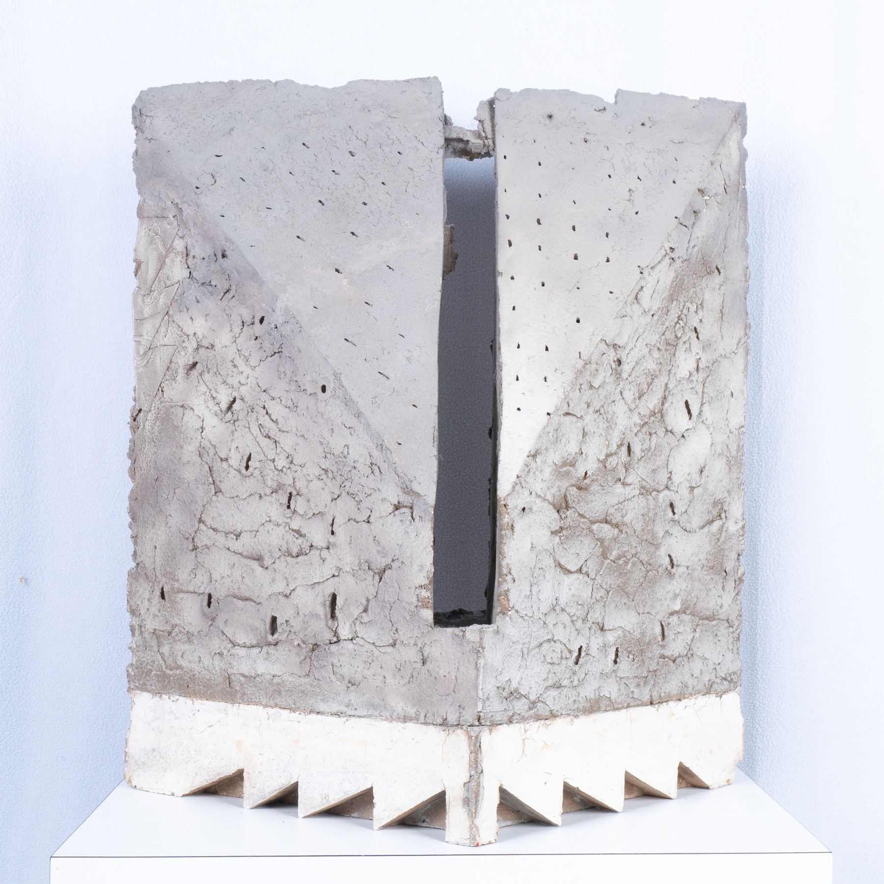 A large gray painted pierced plaster sculpture with a smooth white plaster ziggurat base, 23.5"L x 10"W x 26.25"H. This item has a white laminate veneered base included, 24"L x 16"W x 24"H.