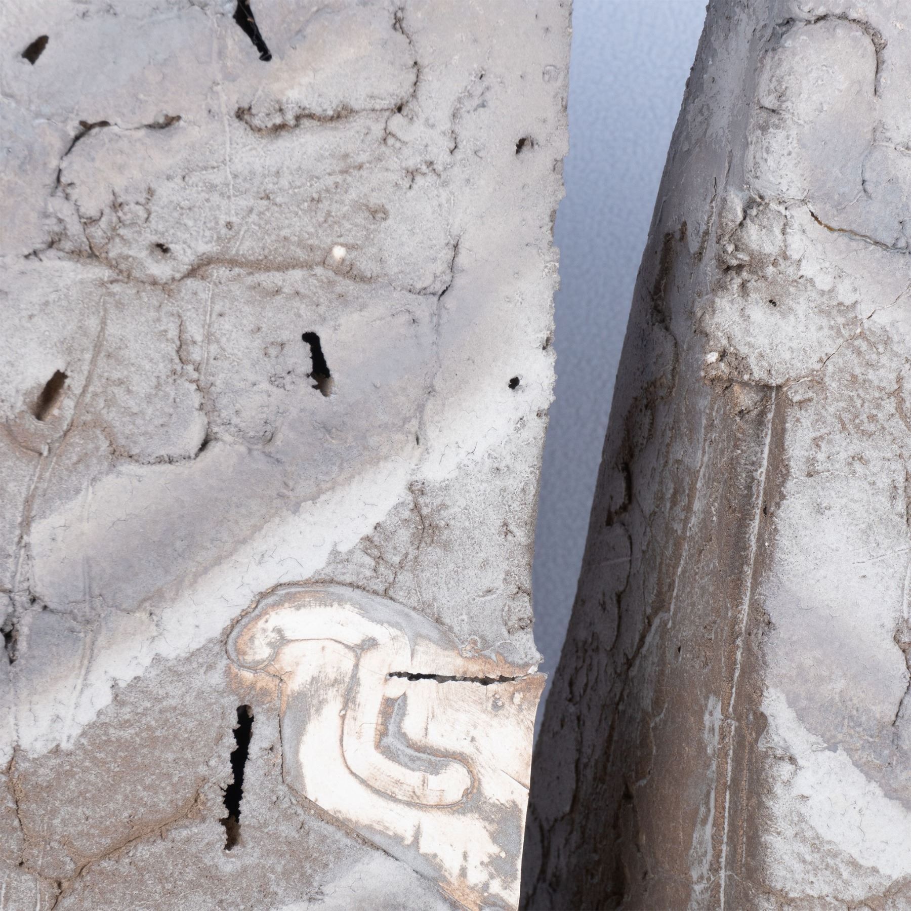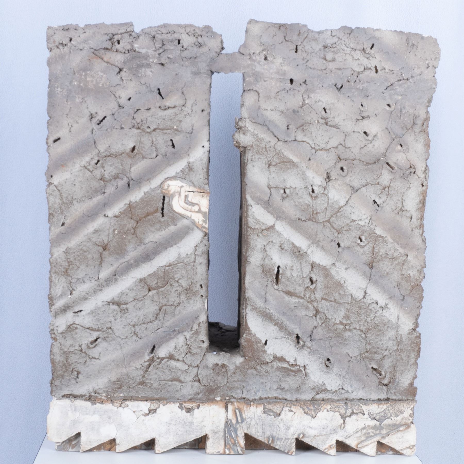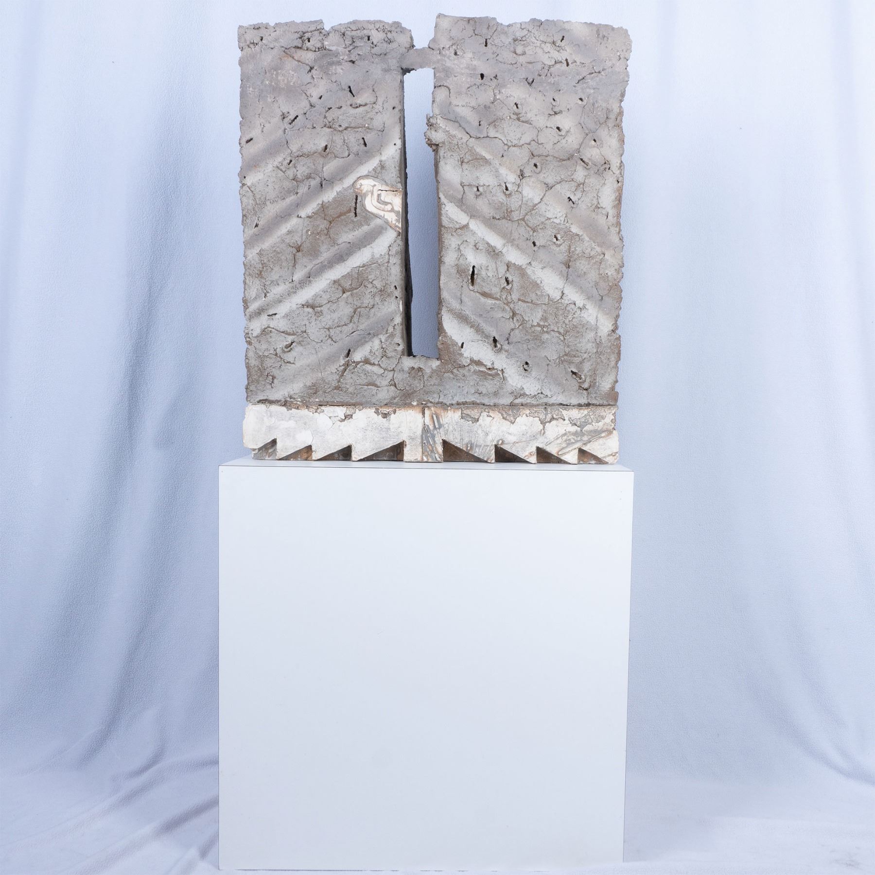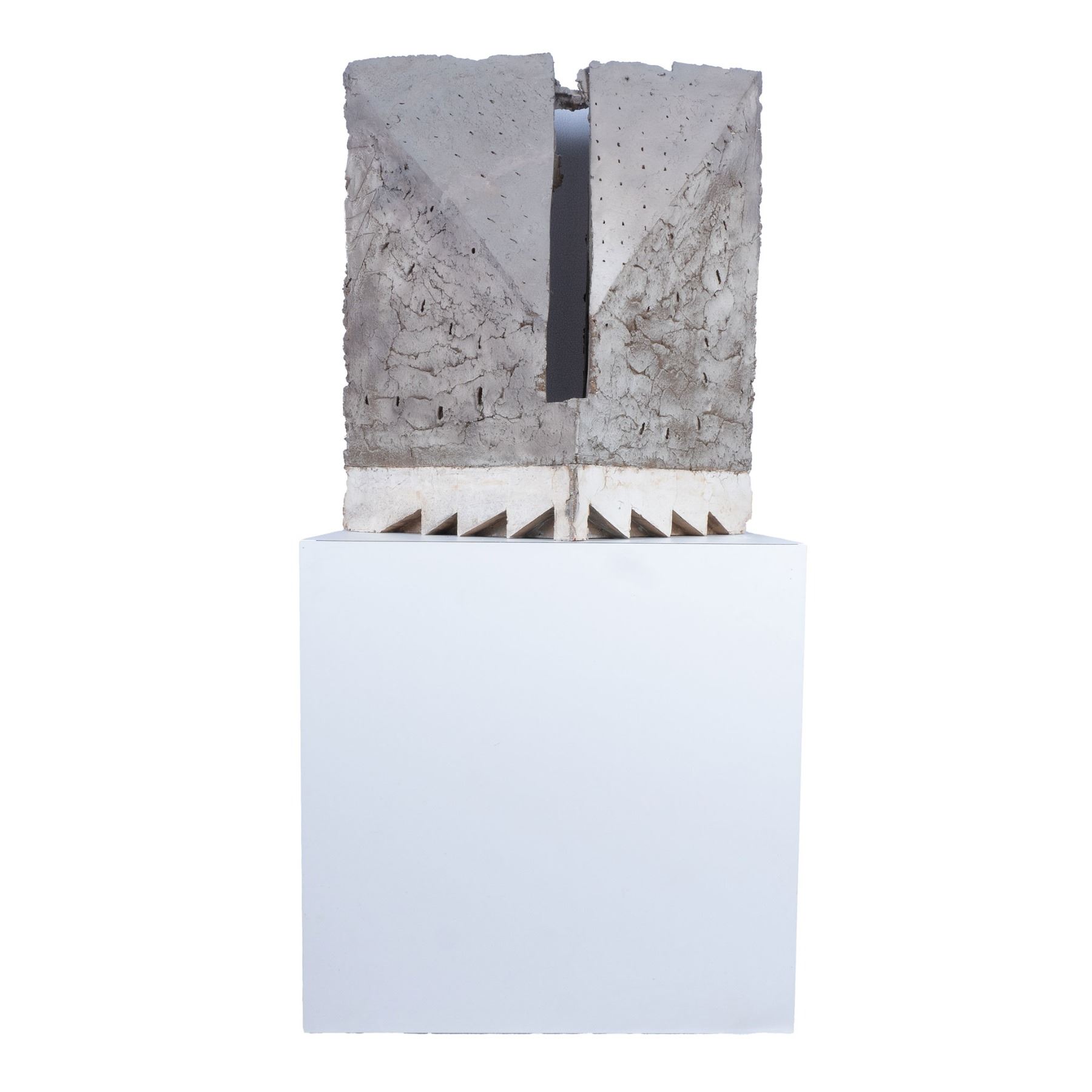 A large gray painted pierced plaster sculpture with a smooth white plaster ziggurat base, 23.5"L x 10"W x 26.25"H. This item has a white laminate veneered base included, 24"L x 16"W x 24"H.