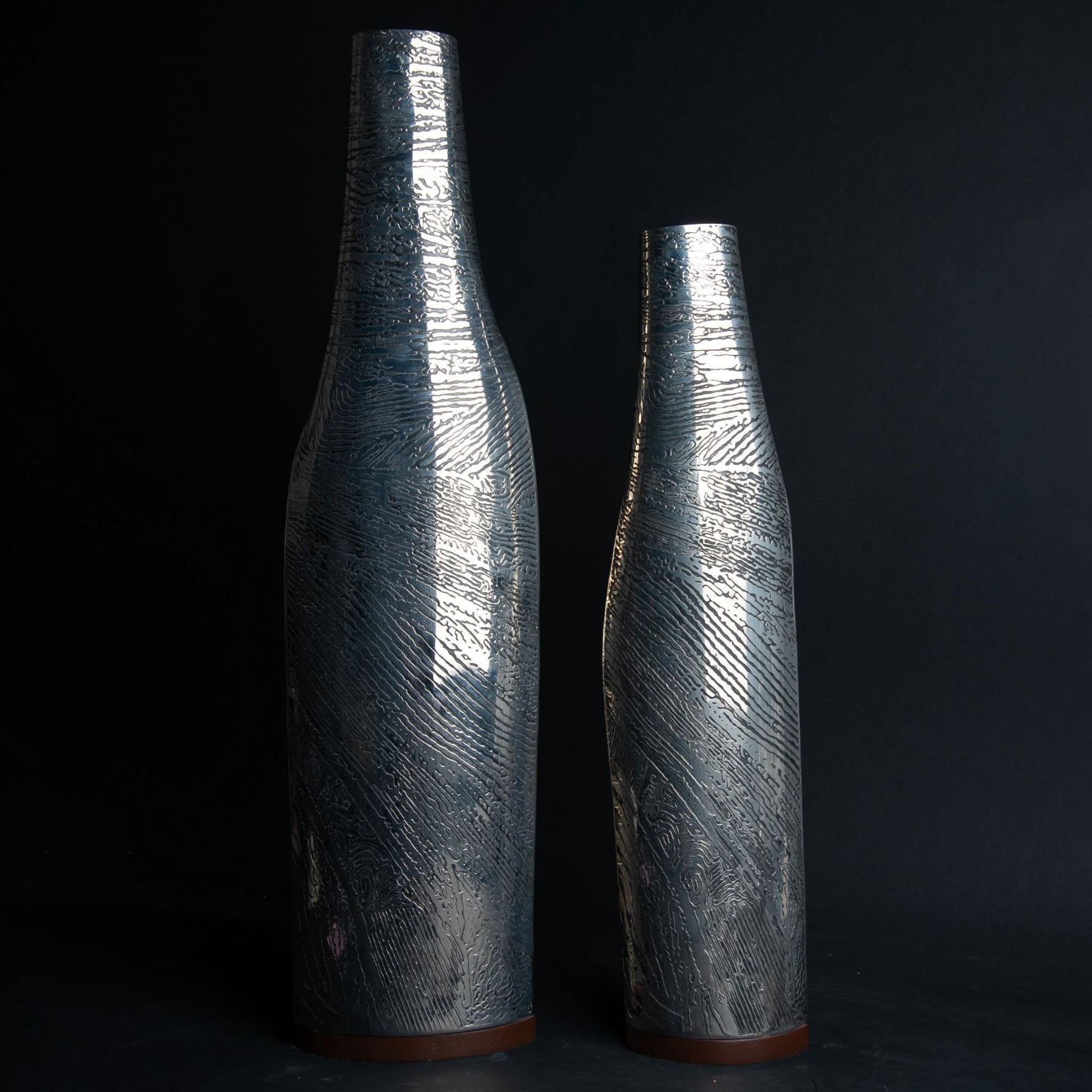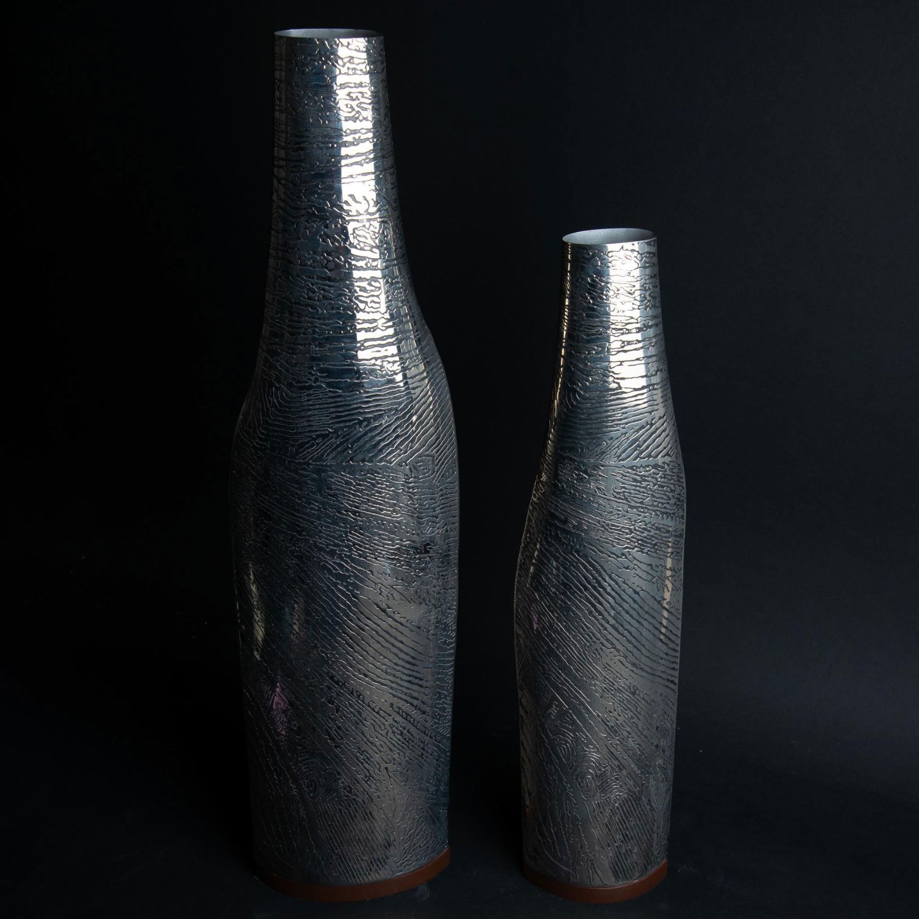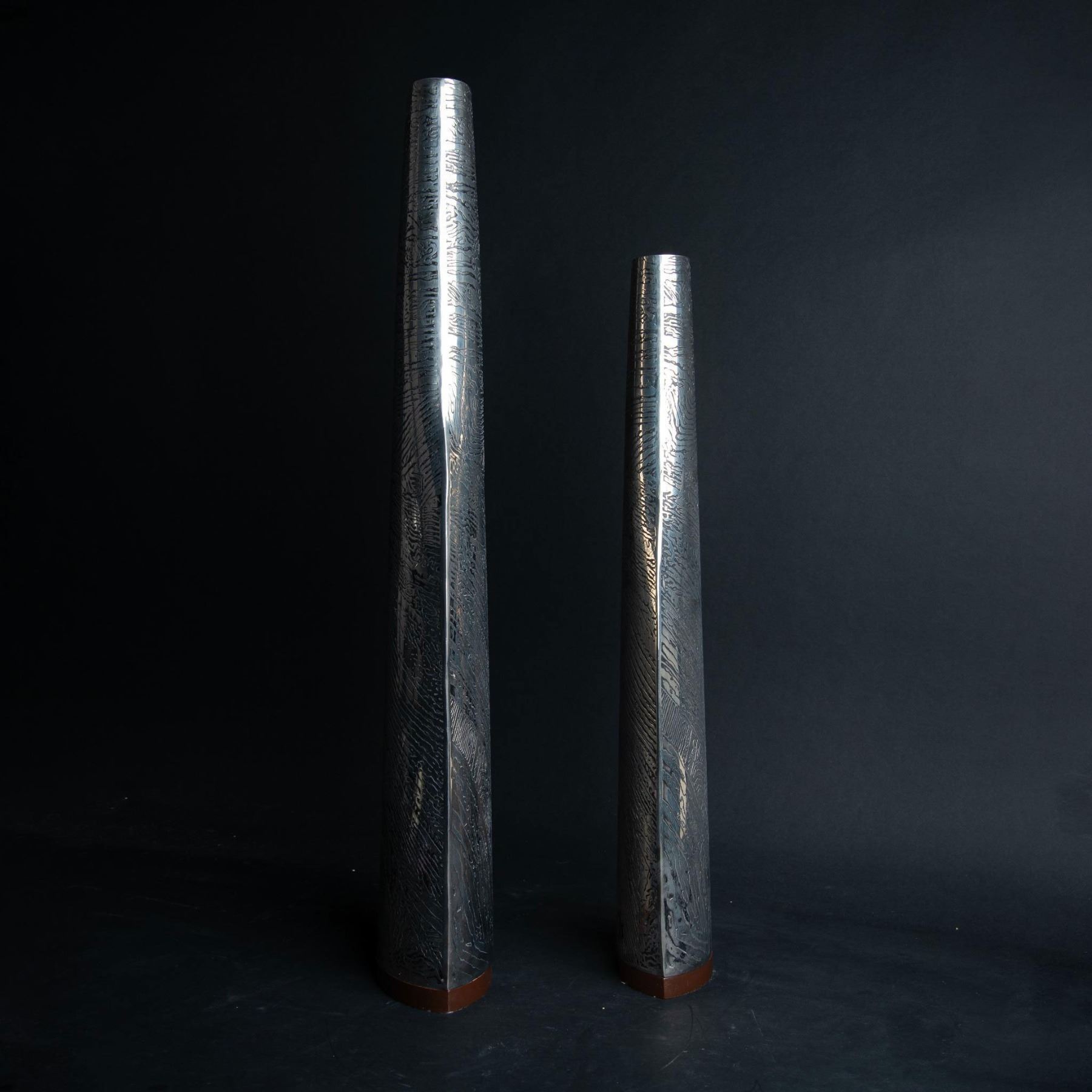 Two modern metal vases with an embossed wood grain reveal on a thin wood base. Tall vase dimension is 7.5"L x 4"W x 30.75"H. Short vase dimension 6"L x 3.25"W x 24.75"H.
