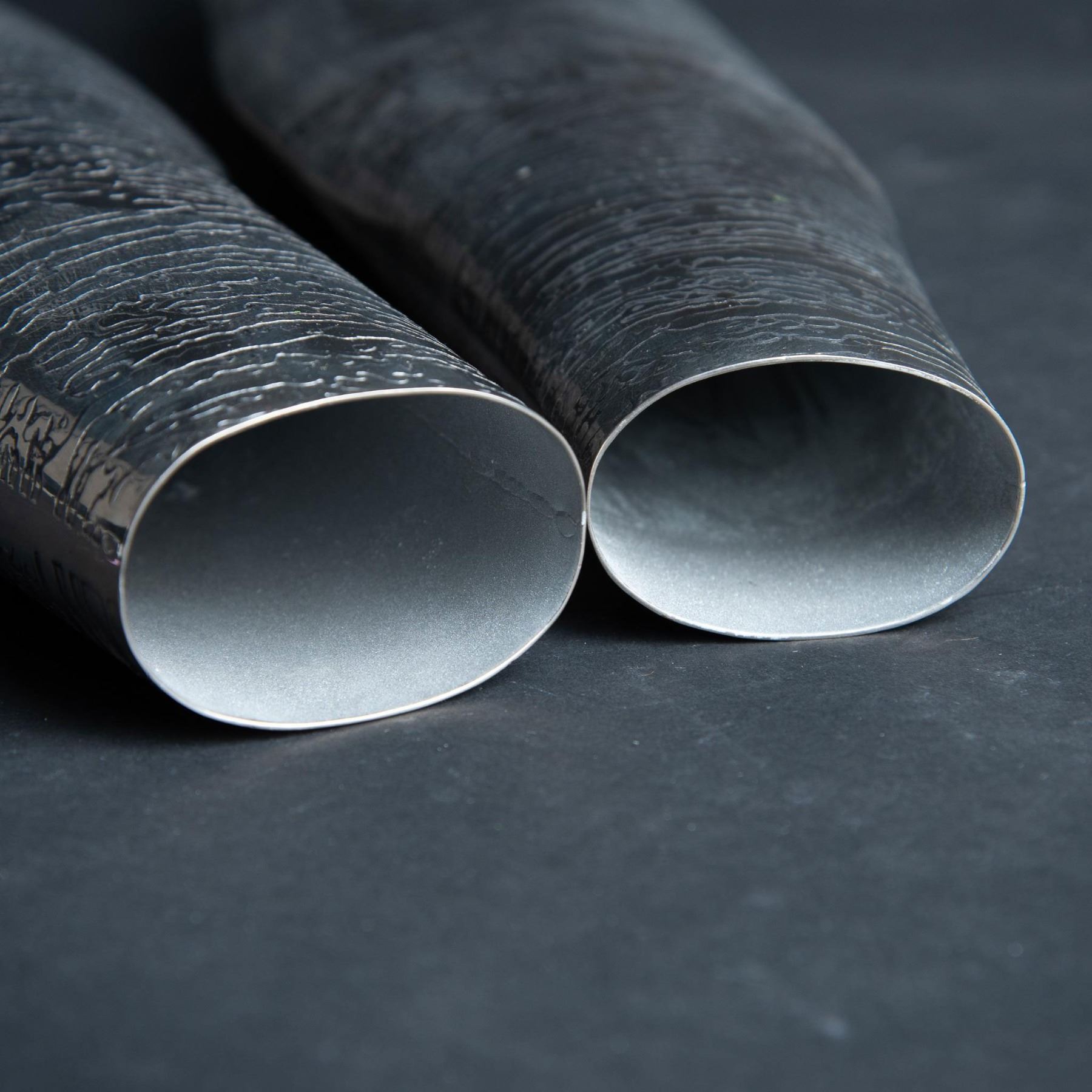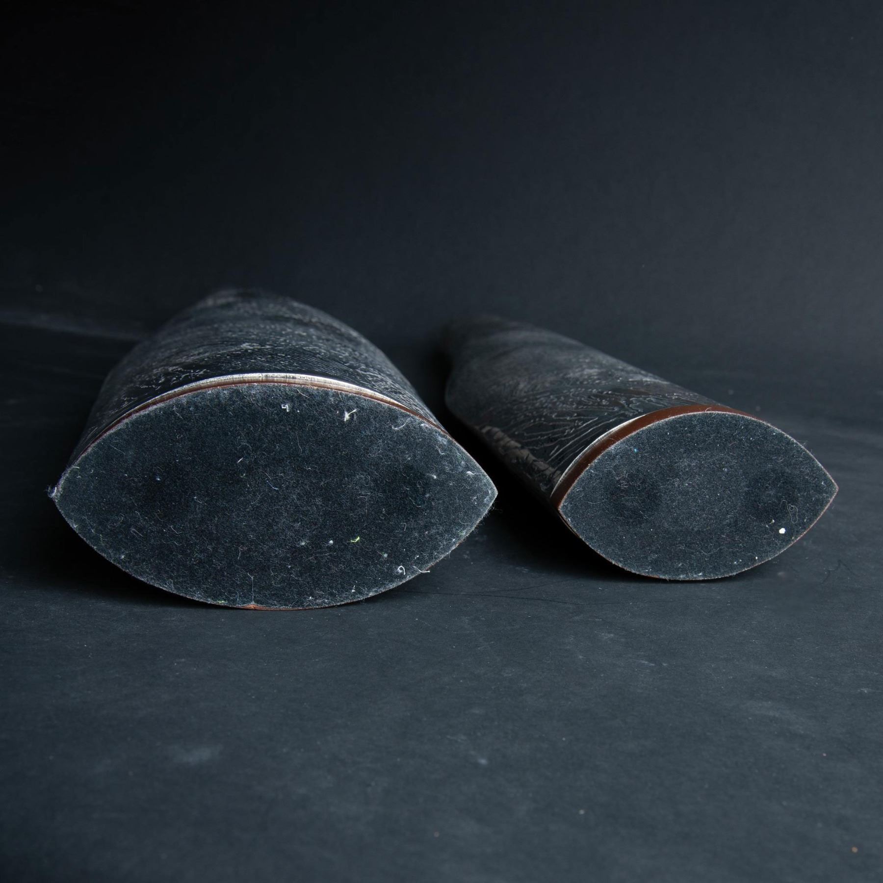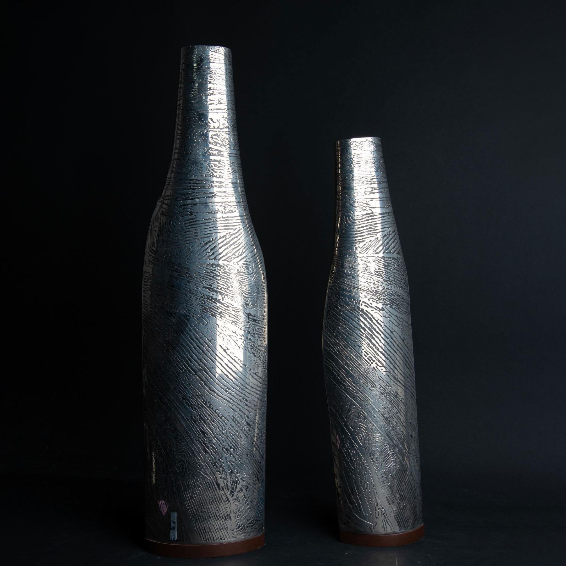 Two modern metal vases with an embossed wood grain reveal on a thin wood base. Tall vase dimension is 7.5"L x 4"W x 30.75"H. Short vase dimension 6"L x 3.25"W x 24.75"H.