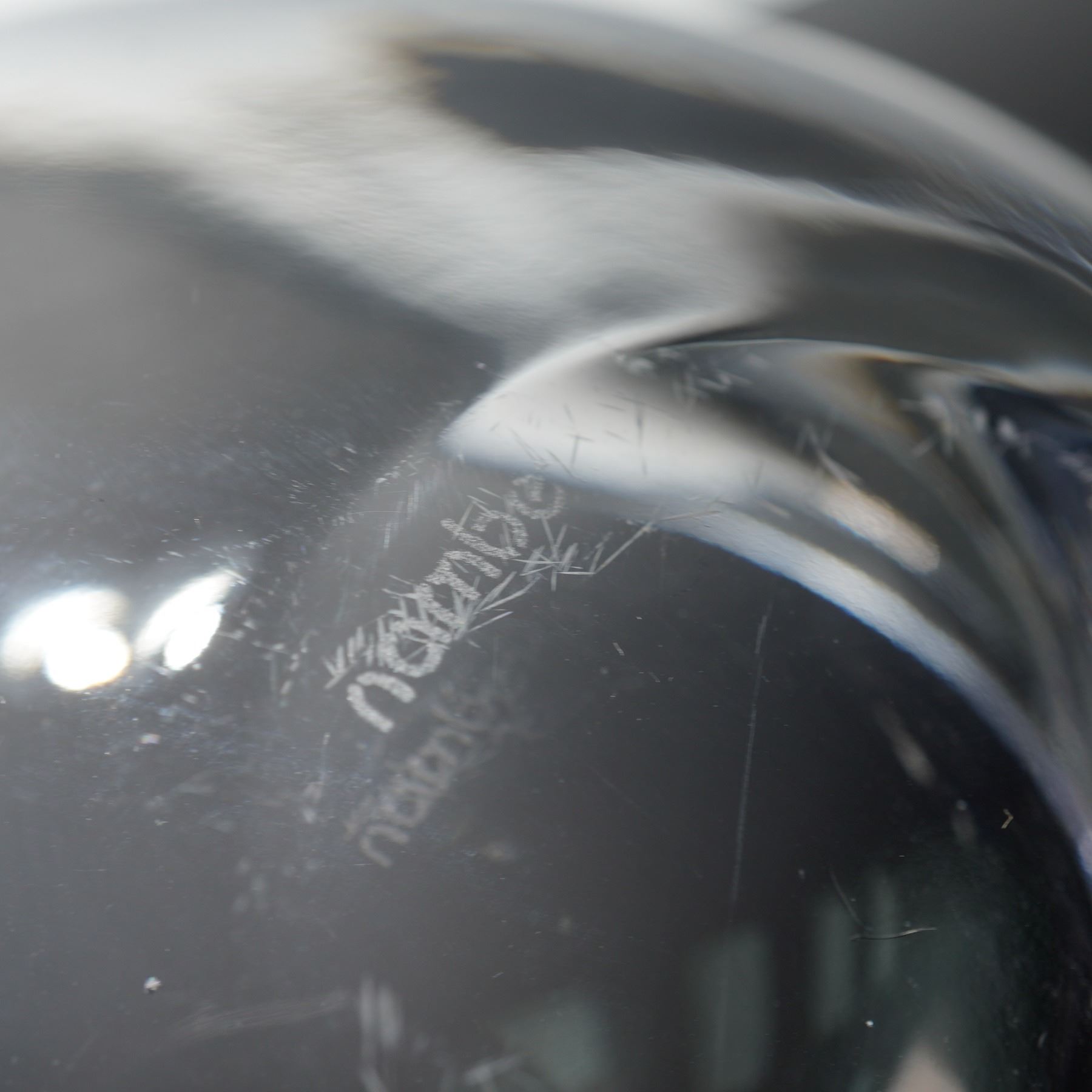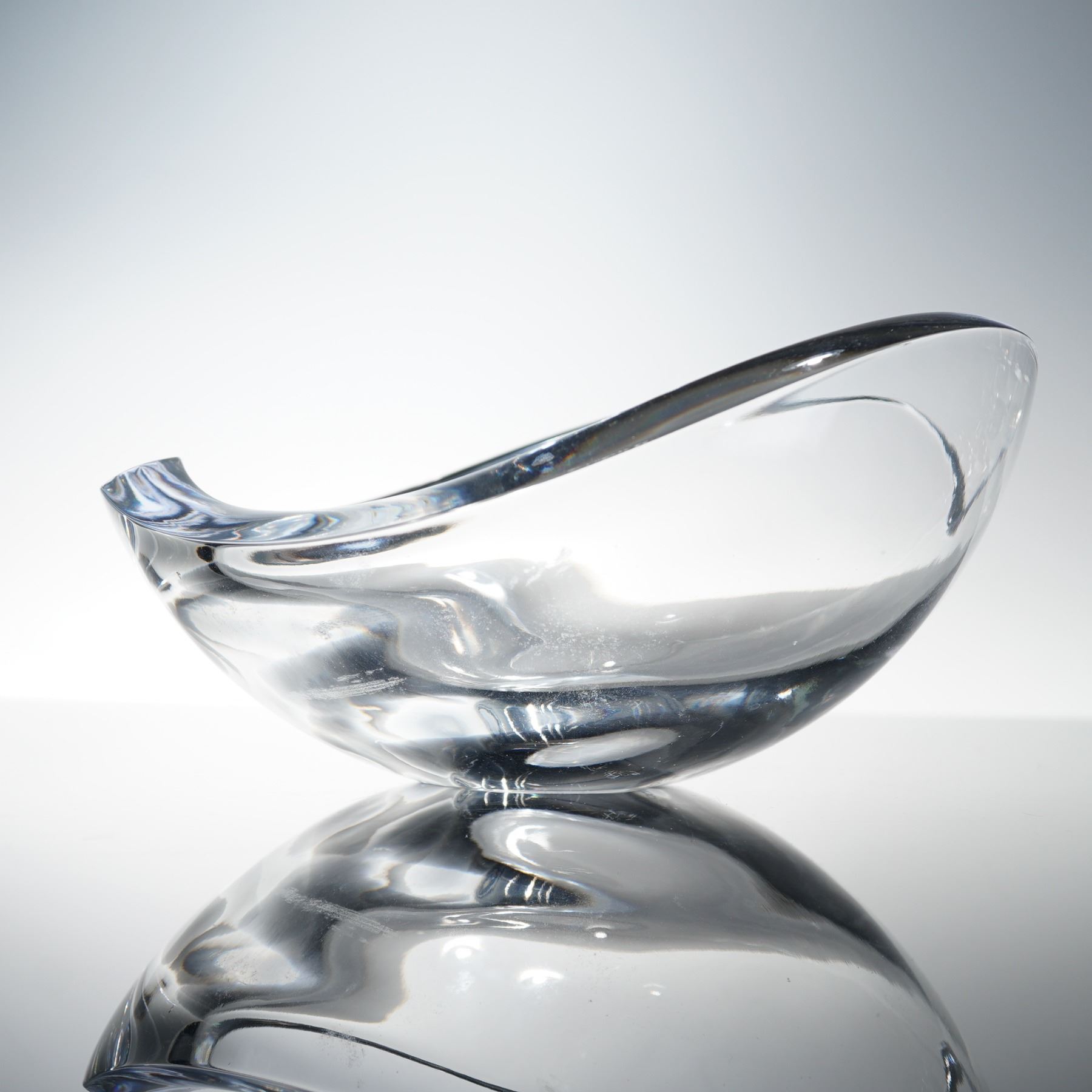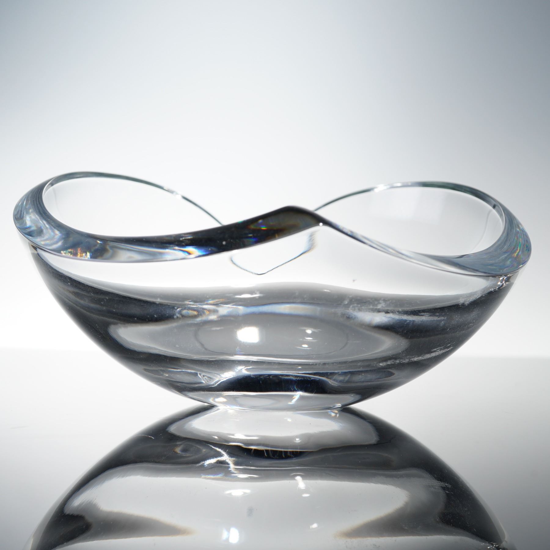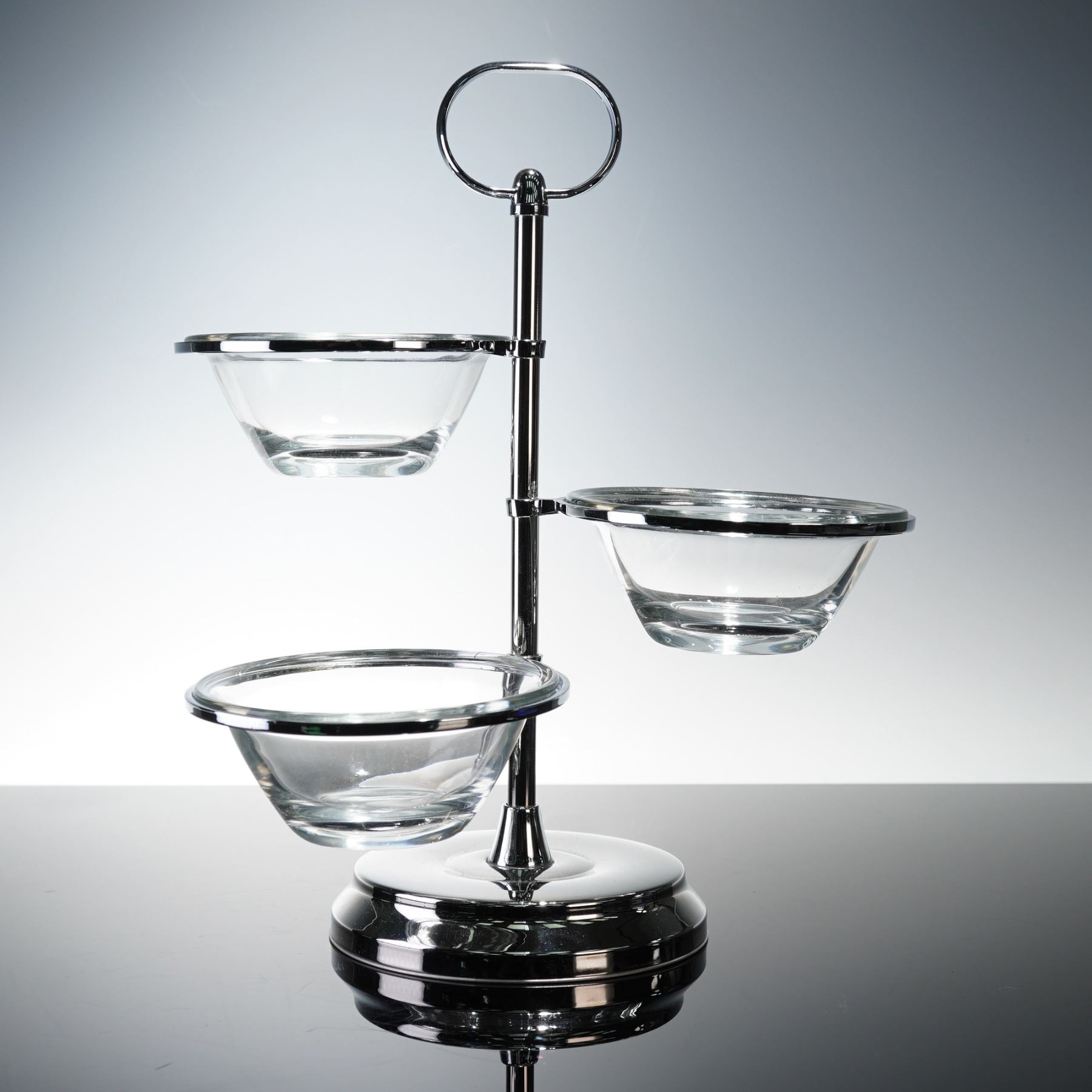 Features a modern two-piece combination of fine glass and stainless steel tableware. Included is a sculptural Nambe crystal bowl with a fluid, organic form and polished clarity, signed on the base. The bowl displays the signature design language associated with Nambe's mid- to late-century glass production, blending elegant curvature with functional artistry. Accompanying the bowl is a WMF stainless steel snack stand featuring three removable glass inserts supported by a chrome-plated tiered frame with a ring handle for easy service. Both pieces reflect refined modern design suitable for tabletop display or entertaining. The crystal bowl shows light surface wear to the underside consistent with display use, while the WMF stand and glass inserts remain in excellent condition. Together, they form an attractive pairing of contemporary European craftsmanship and timeless elegance.