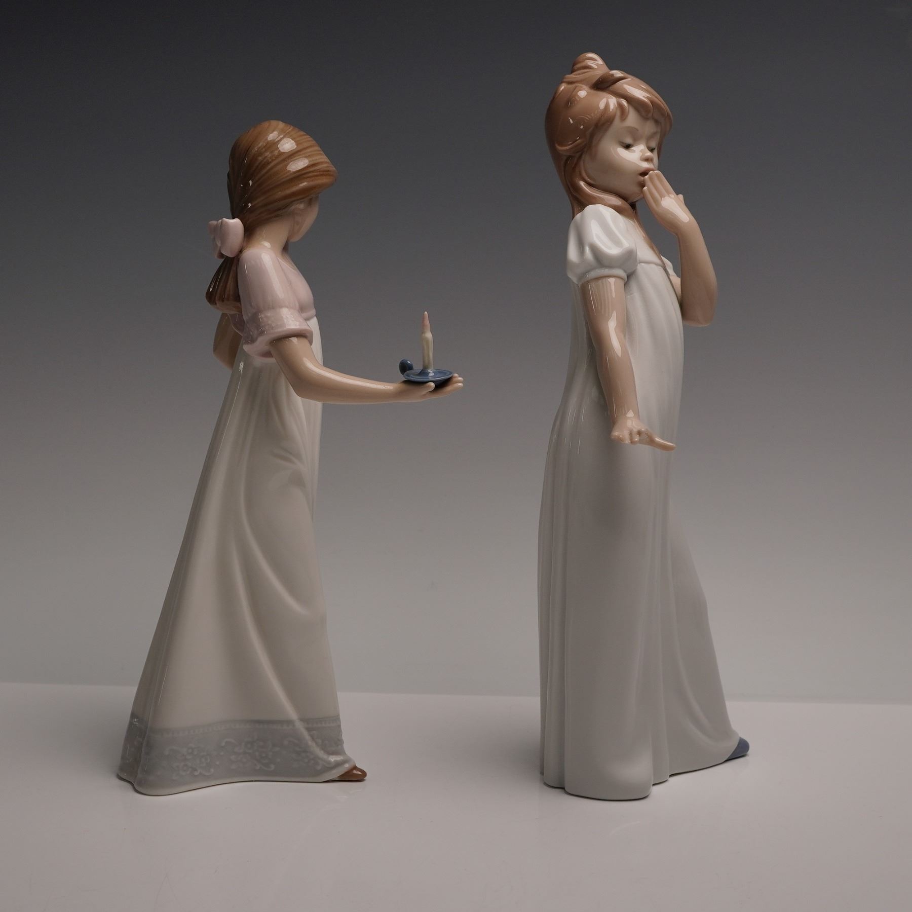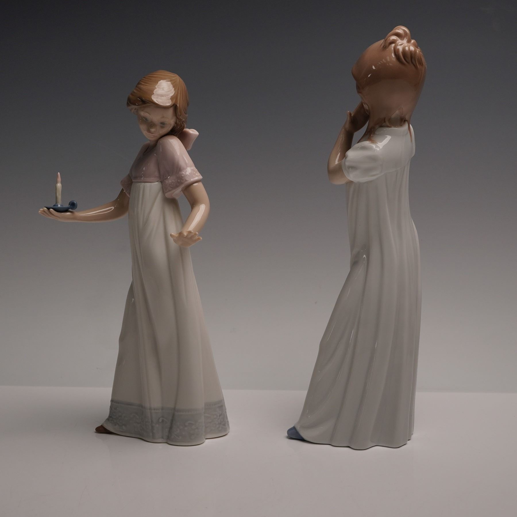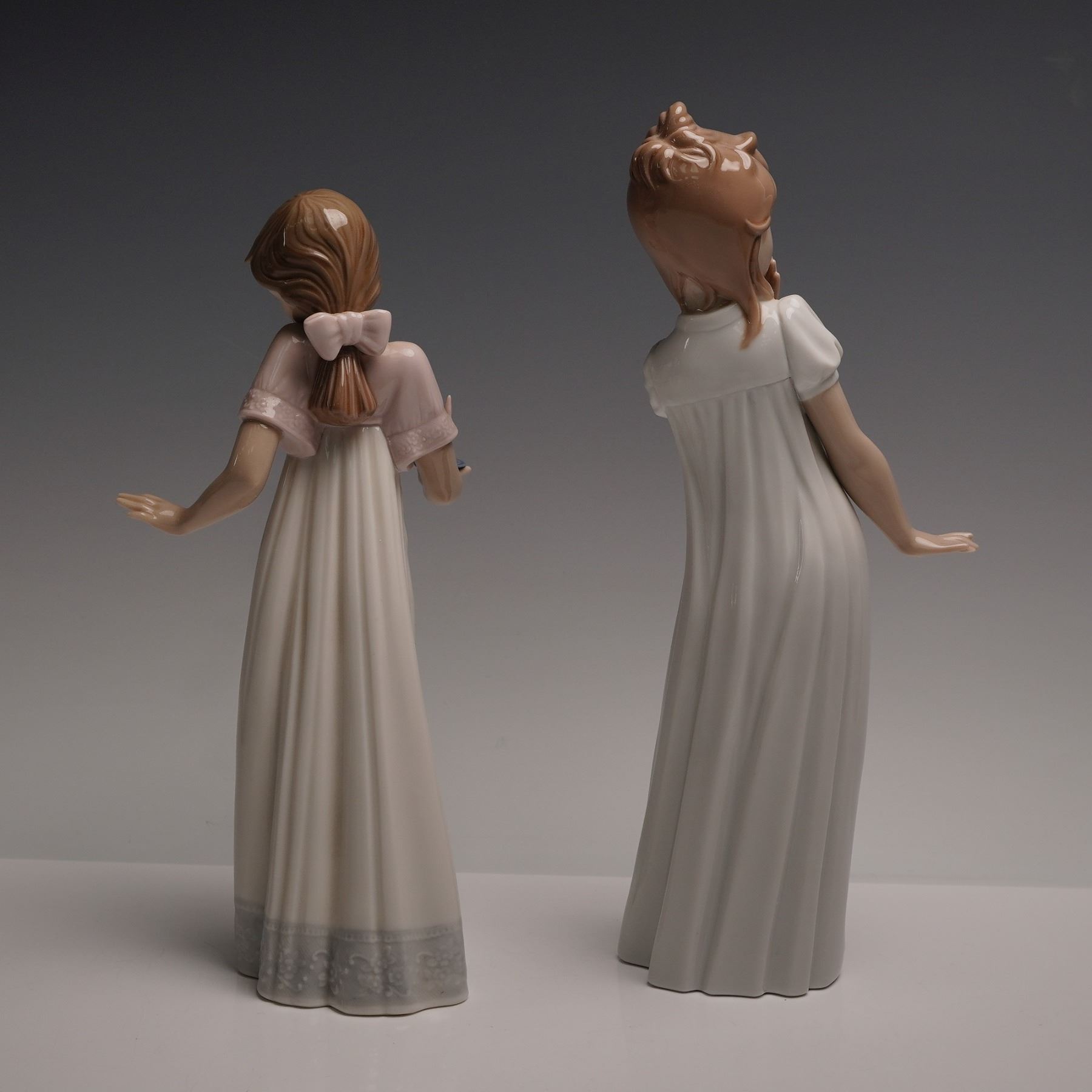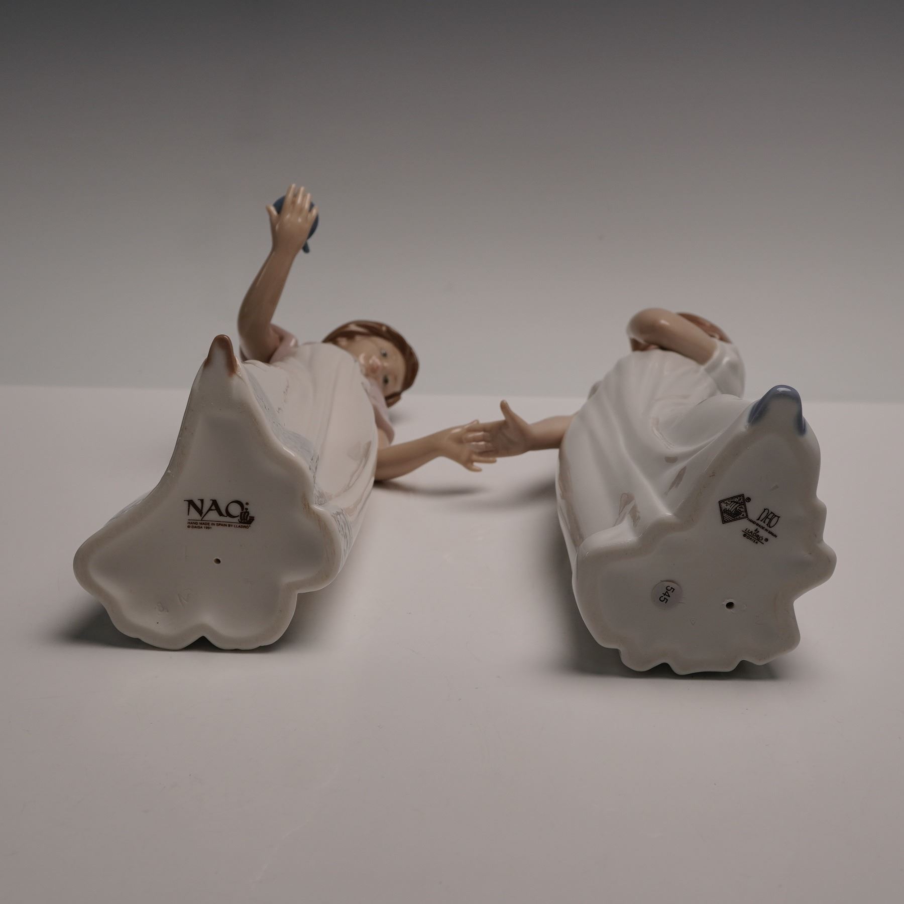 Set of two Lladro porcelain figurines depicting seated polar bears with realistic detailing and soft, glossy glaze. Each figure captures the gentle posture and expressive features of the animals, one leaned over called Seated Polar Bear 1001209 and the other called Good Bear 1001205. Marked on the underside with the Lladro hallmark.