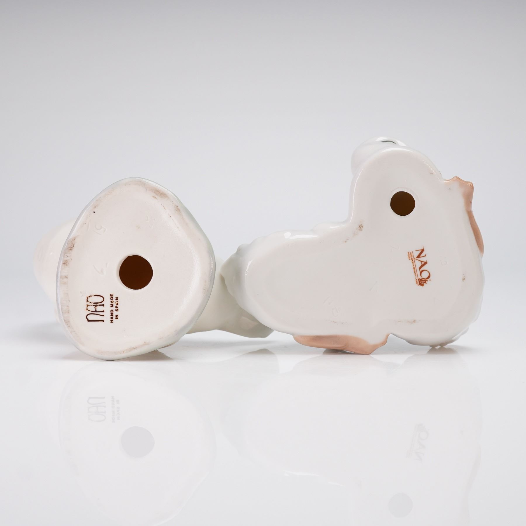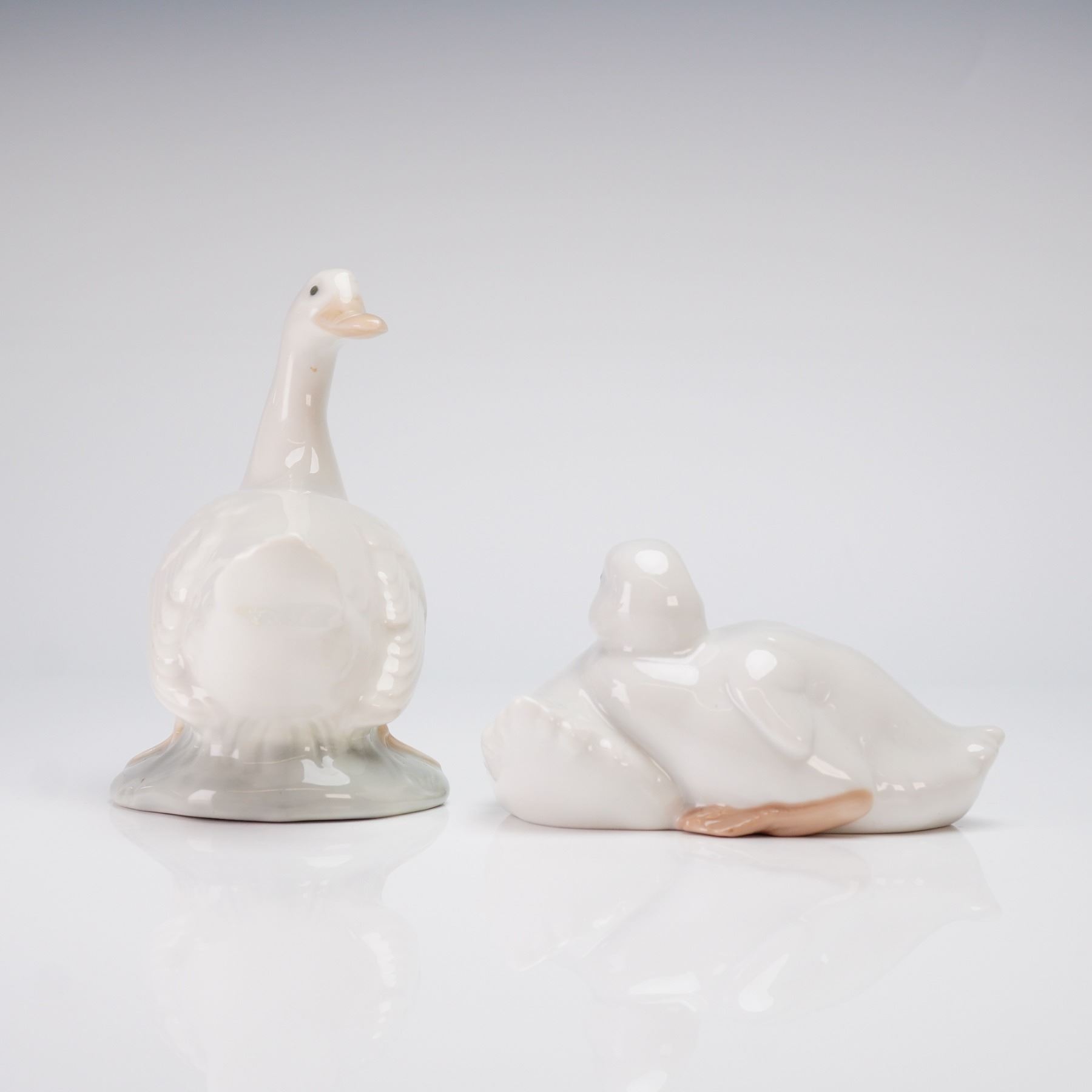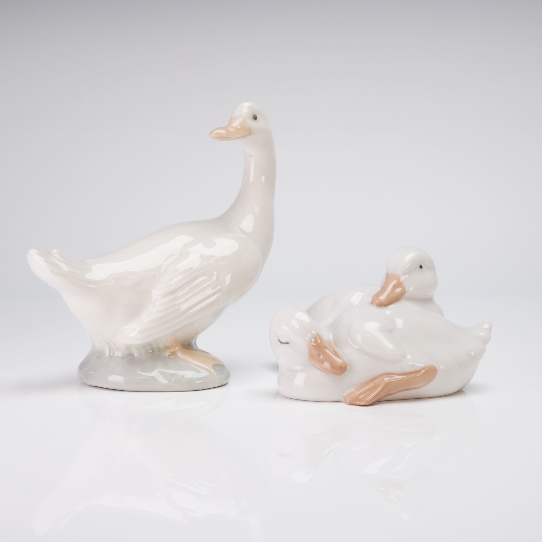 A duo of porcelain figurines by Nao by Lladro, handmade in Spain. The collection features two distinct figurines: a single standing goose and a grouping of two huddled ducklings. Both items are finished in a high-gloss white glaze with some accents of light peach/brown applied to the beaks and feet, and gray detailing is used on the bases. The undersides of both figurines are marked with "NAO / HAND MADE / IN SPAIN."